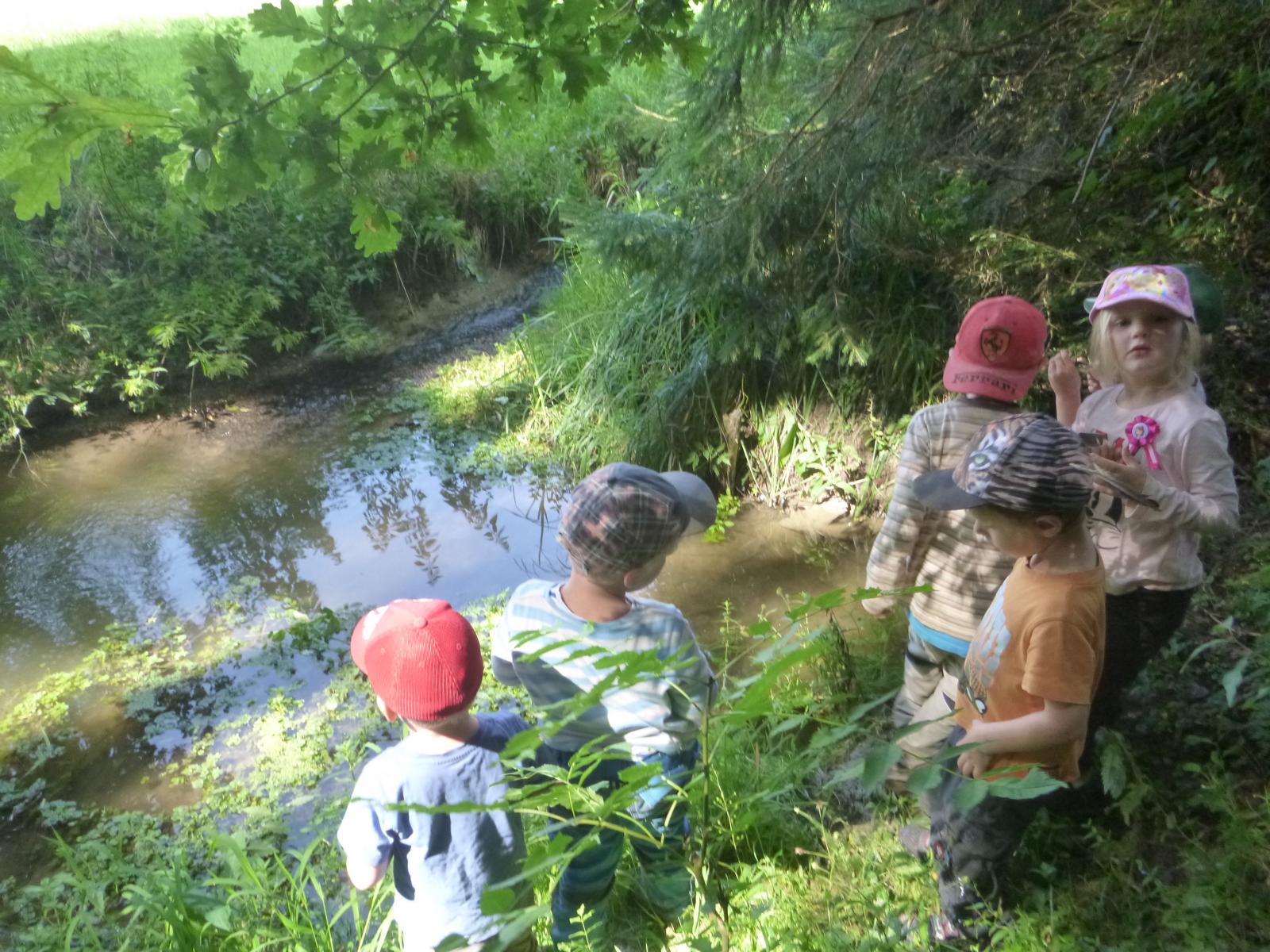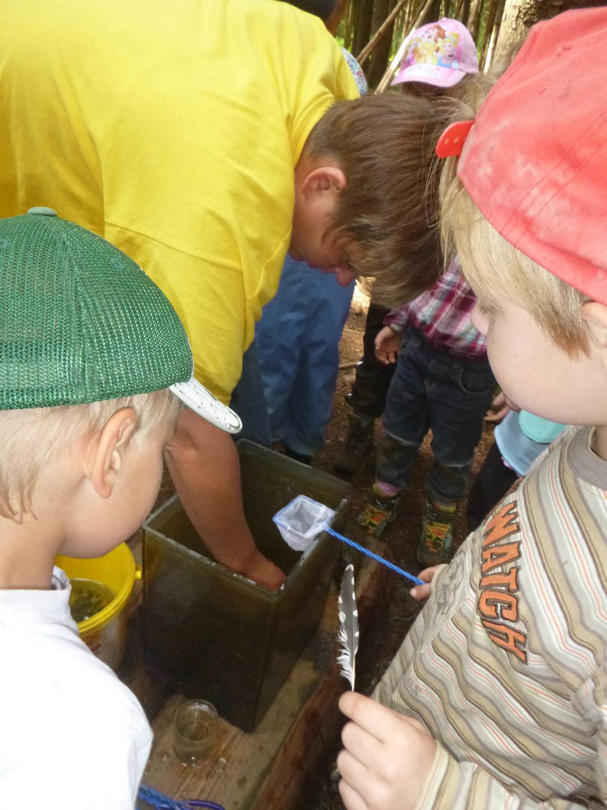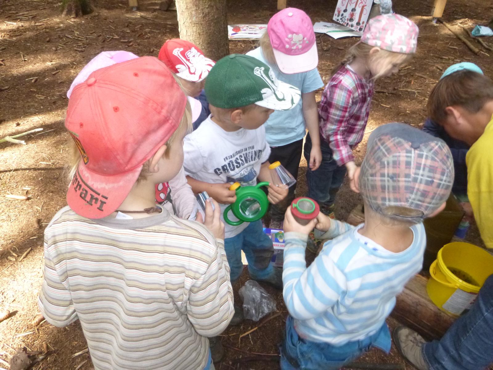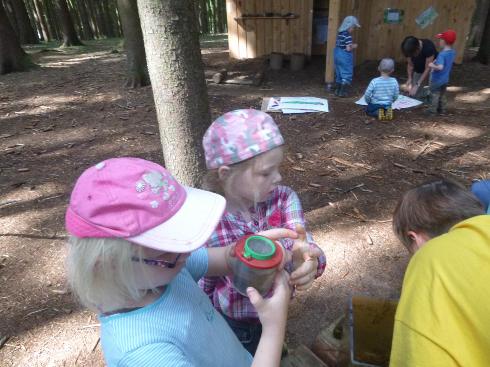Viel Geduld mussten die Waldkinder aufbringen, um mitzuerleben, wie aus den kleinen Kaulquappen, die seit Mai das große Glasgefäß im Wald bewohnten, richtige Frösche wurden. Jeden Tag wurde nachgesehen, das Wasser hin und wieder erneuert, Fischfutter mitgebracht und nachgezählt, ob auch wirklich alle Quappis noch da sind. Mittlerweile hatten die künftigen Frösche schon Namen erhalten, bekamen tatsächlich immer dickere Bäuche und wedelten ansonsten munter durch’s Wasser. Die ersten Füße wurden aufgeregt zur Kenntnis genommen! Nach weiteren zwei Wochen wurden aus den Zweibeinern Vierbeiner und der Schwanz bildete sich zurück. Vorsichtshalber bauten die Kinder eine Ausstiegshilfe, damit die Frösche ihre Kinderstube auch verlassen können. Und wirklich: eines Morgens waren die Winzlinge ausgezogen! Nur das Nesthäkchen verweilte noch ein paar Tage im kühlen Nass, bevor es sich auch über den hölzernen Laufsteg ins Froschleben wagte. Gelegentlich treffen wir einen kleinen Frosch im Wald, erkennen ihn als einen der unseren, begrüßen ihn recht freundlich und würden gerne erfahren, was er schon alles im Wald erlebt hat……