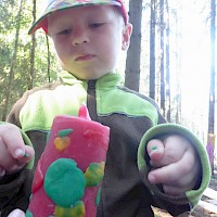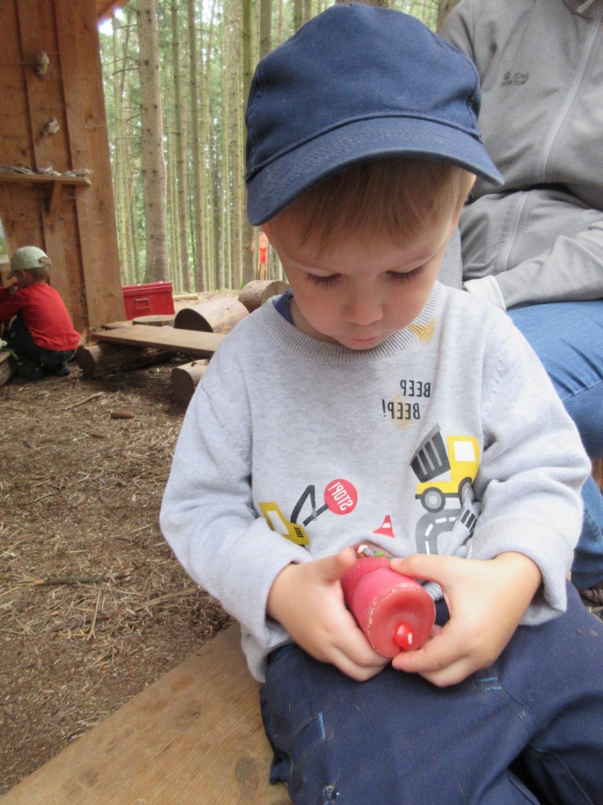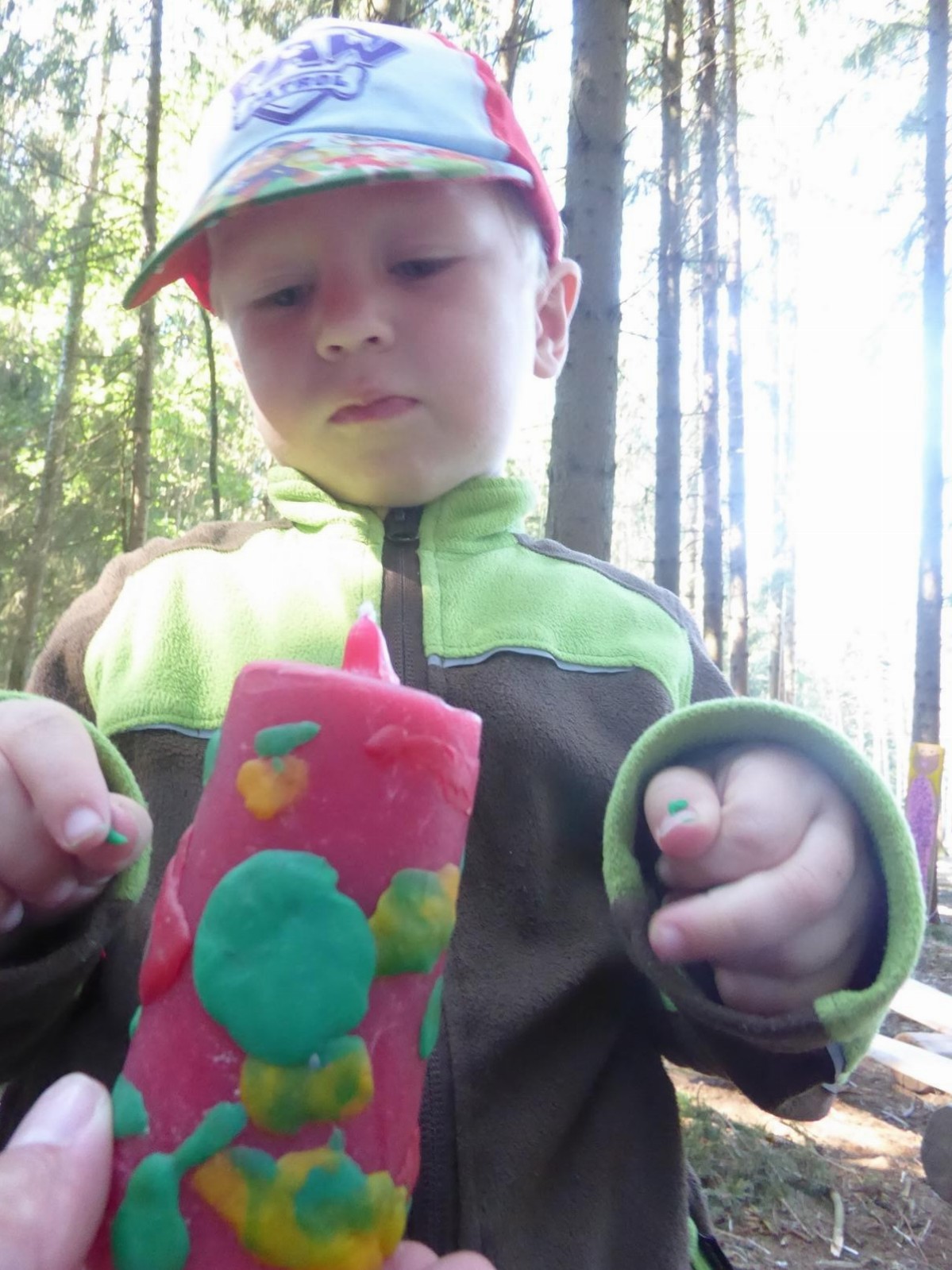 Wie jedes Jahr, darf sich jedes Kind seine eigene Geburtstagskerze selber gießen. Dazu werden Toilettenpapierrollen in Lehm gedrückt, alte Wachsreste geschmolzen und in die Rollen gegossen. Am nächsten Tag knibbeln die Kinder die Papierreste vom ausgehärteten Wachs. Danach kann sich jedes Kind seine eigene Kerze individuell mit verschiedenfarbigen Wachsstücken verzieren. Und schon ist die Kerze bereit für ihren Einsatz.
