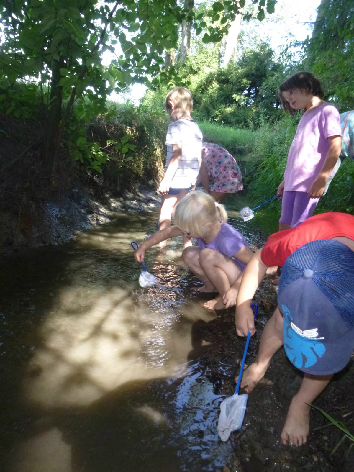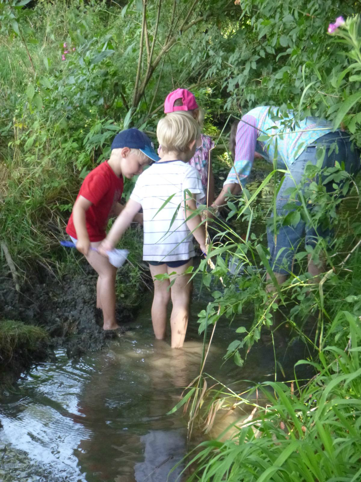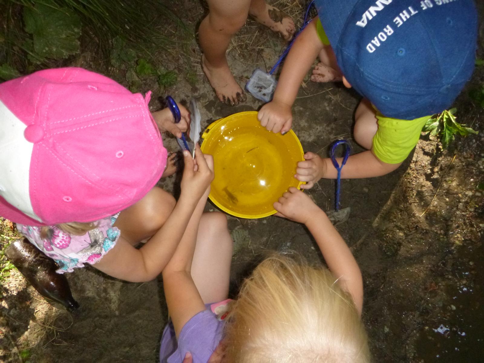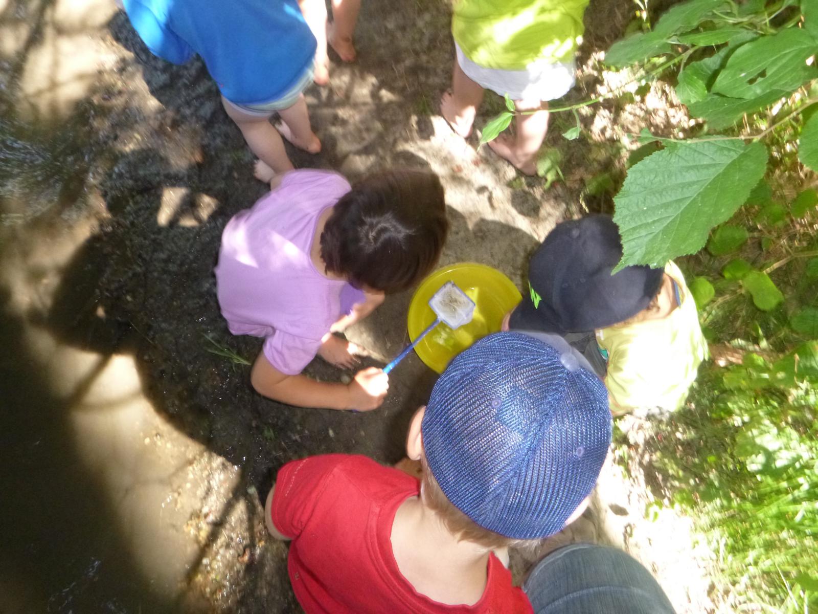 Heute geht es nicht zum Baden an den Lausbach - ausgerüstet mit Keschern, Lupenbechern und Eimern möchten wir herausfinden, wer zwischen Steinen und Ufergras im Bachwasser lebt. Nach einer kurzen Einführung steigen die Kinder vorsichtig ins Wasser und ziehen die Kescher über den steinigen Bachgrund. Hat sich schon etwas verfangen? Nein, nur ein paar Steinchen und Wasserlinsen sind im Kescher gelandet. Nach ein paar weiteren Versuchen zappelt etwas im Netz und wird vorsichtig in die Wasserschüssel befördert - ein kleiner Bachflohkrebs rudert mit seinen unzähligen Beinchen da im Wasser herum. In der Becherlupe wird er genauestens betrachtet, bevor er wieder in den Bach zurückkommt. Einige Wasserläufer und Mückenlarven sind die nächsten Gäste im Wassereimer. Wir Staunen über die Geschwindigkeit, mit der die Wasserläufer sich auf der Wasseroberfläche bewegen und überlegen, warum sie nicht versinken. Im Ufergrün verstecken sich zwei Grünlinge, eine Raupe und ein großer Grashüpfer. Doch den scharfen Forscheraugen der Kinder entgehen sie nicht.