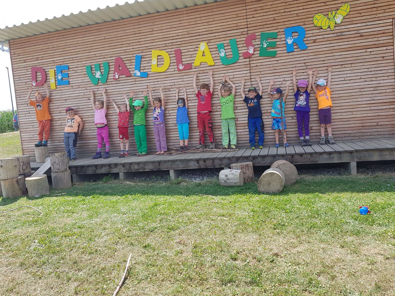 Die künftigen Schulkinder wiederum verabschiedeten sich mit einem bunten Geschenk vom Kindergarten. Viele bunte Buchstaben prangen seither am Häusl und verraten allen, wer da zu finden ist: Die WALDLAUSER!