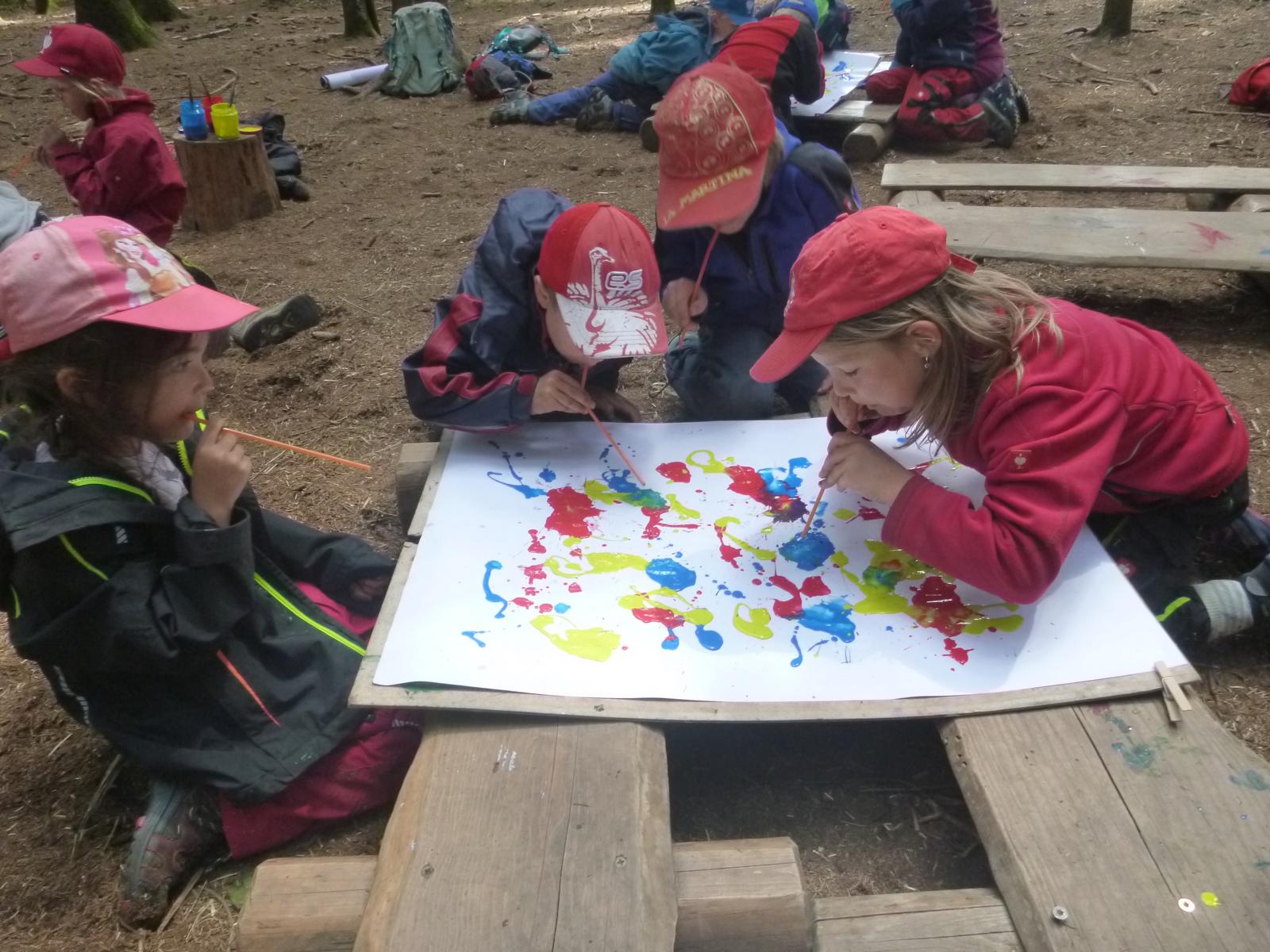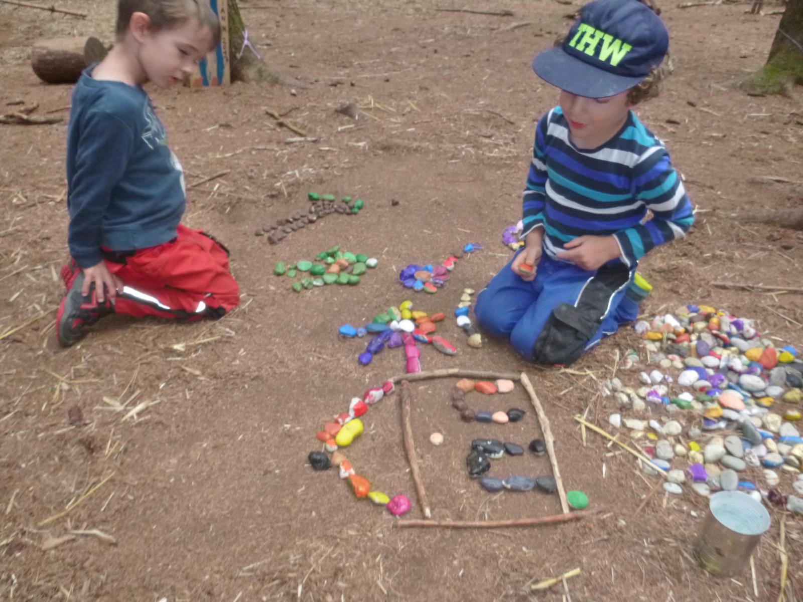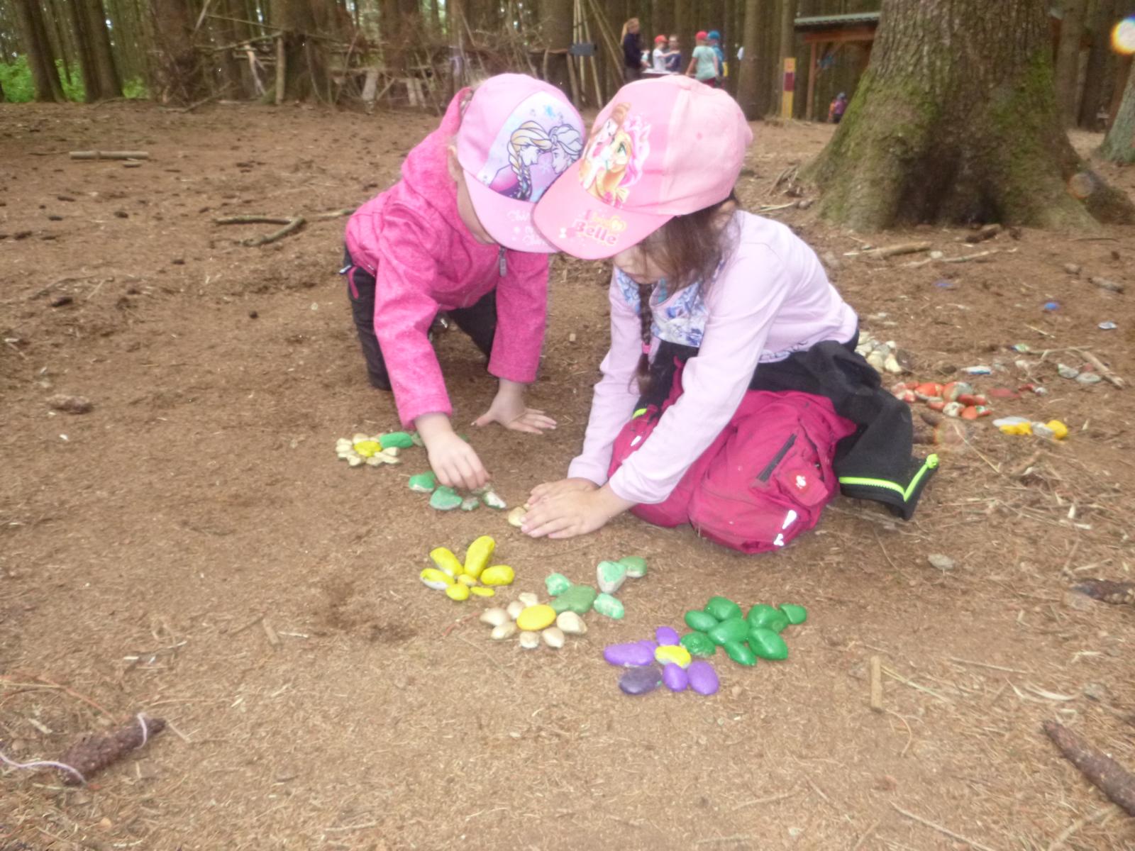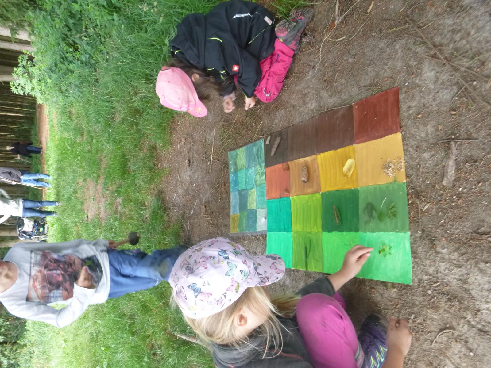 Viele buntbemalte Steine laden ein, auf dem Waldboden bunte Mosaike und Bilder zu legen. Das unterschiedliche Grün der Blätter und Pflanzen wird gesammelt, beschrieben und findet einen Platz auf der Farbtafel. Manche Pflanzen, wie das saftige Springkraut eignen sich sogar zum Malen und aus Erde lässt sich unter Beimischung verschiedener Naturfarbstoffe Lehmschminke herstellen. Viele Lieder, Geschichten, Experimente und Spiele begleiteten die Kinder in die Farbenwelt und auch beim gemütlichen Familienpicknick drehten sich die gestellten Aufgaben rund um die Farben.