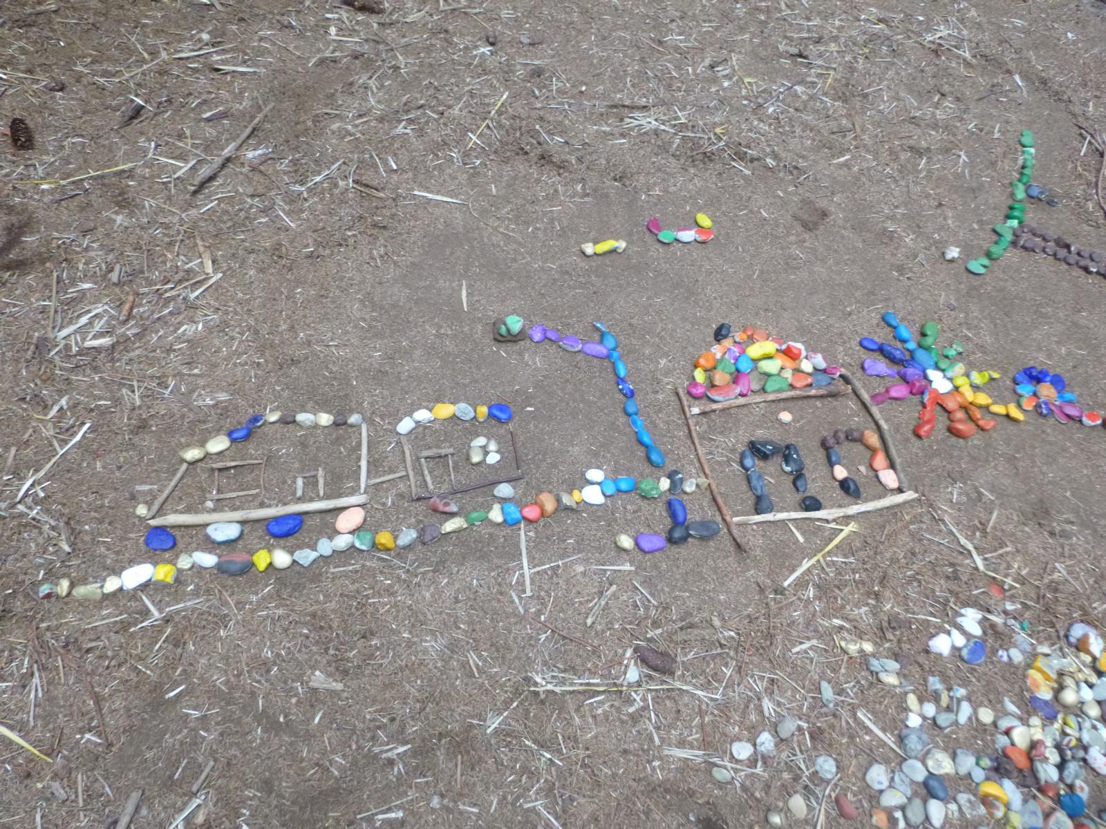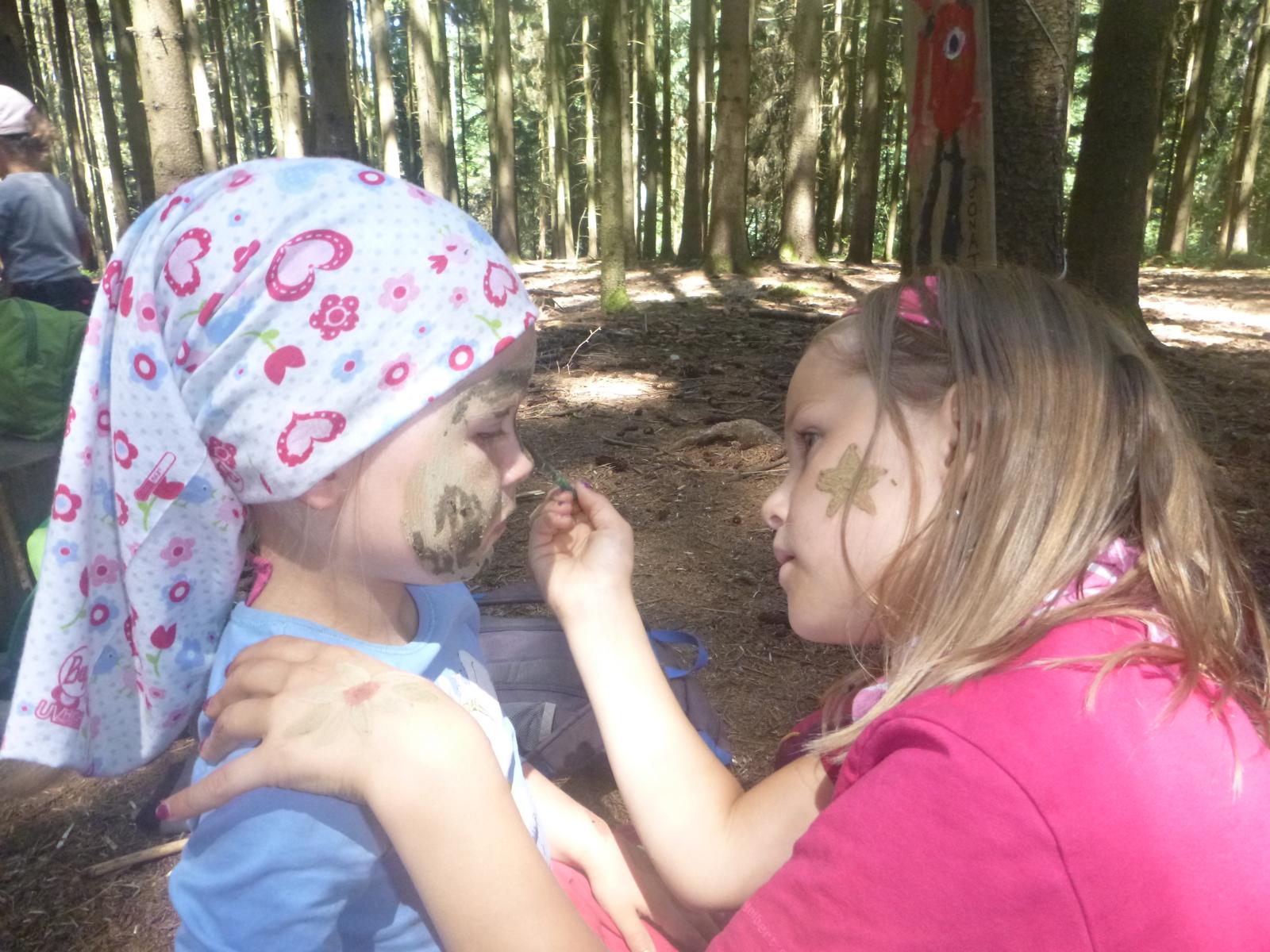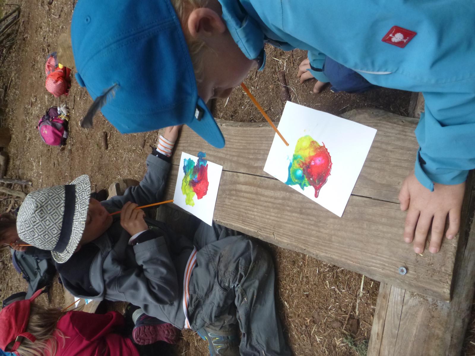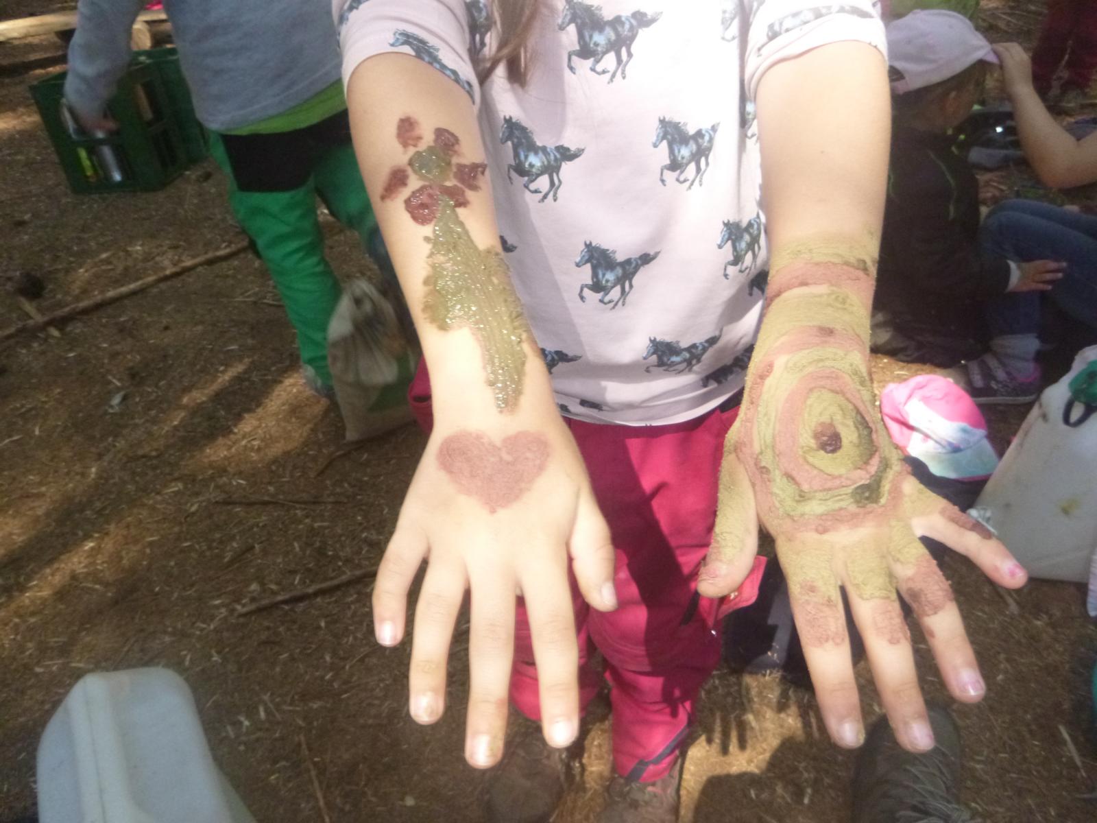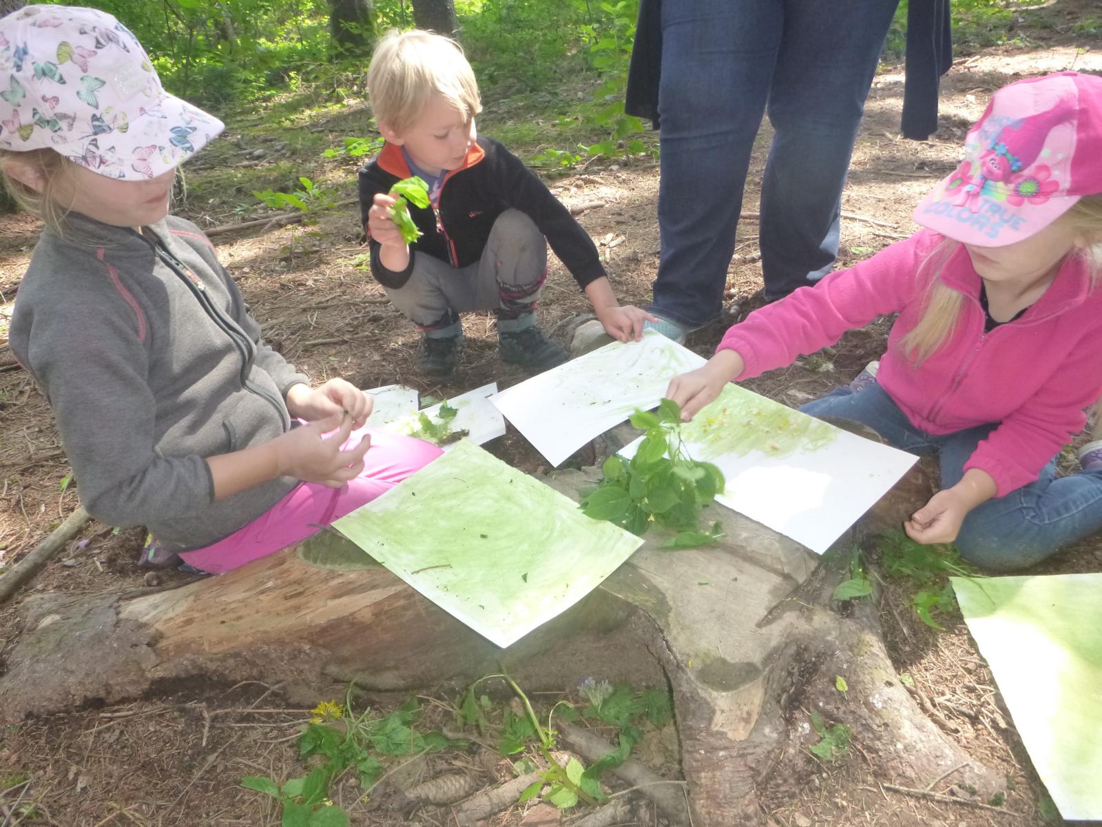 Viele buntbemalte Steine laden ein, auf dem Waldboden bunte Mosaike und Bilder zu legen. Das unterschiedliche Grün der Blätter und Pflanzen wird gesammelt, beschrieben und findet einen Platz auf der Farbtafel. Manche Pflanzen, wie das saftige Springkraut eignen sich sogar zum Malen und aus Erde lässt sich unter Beimischung verschiedener Naturfarbstoffe Lehmschminke herstellen. Viele Lieder, Geschichten, Experimente und Spiele begleiteten die Kinder in die Farbenwelt und auch beim gemütlichen Familienpicknick drehten sich die gestellten Aufgaben rund um die Farben.
