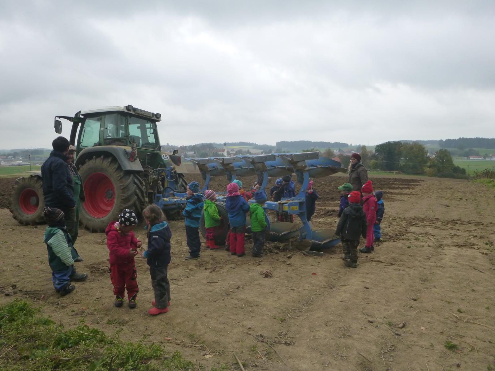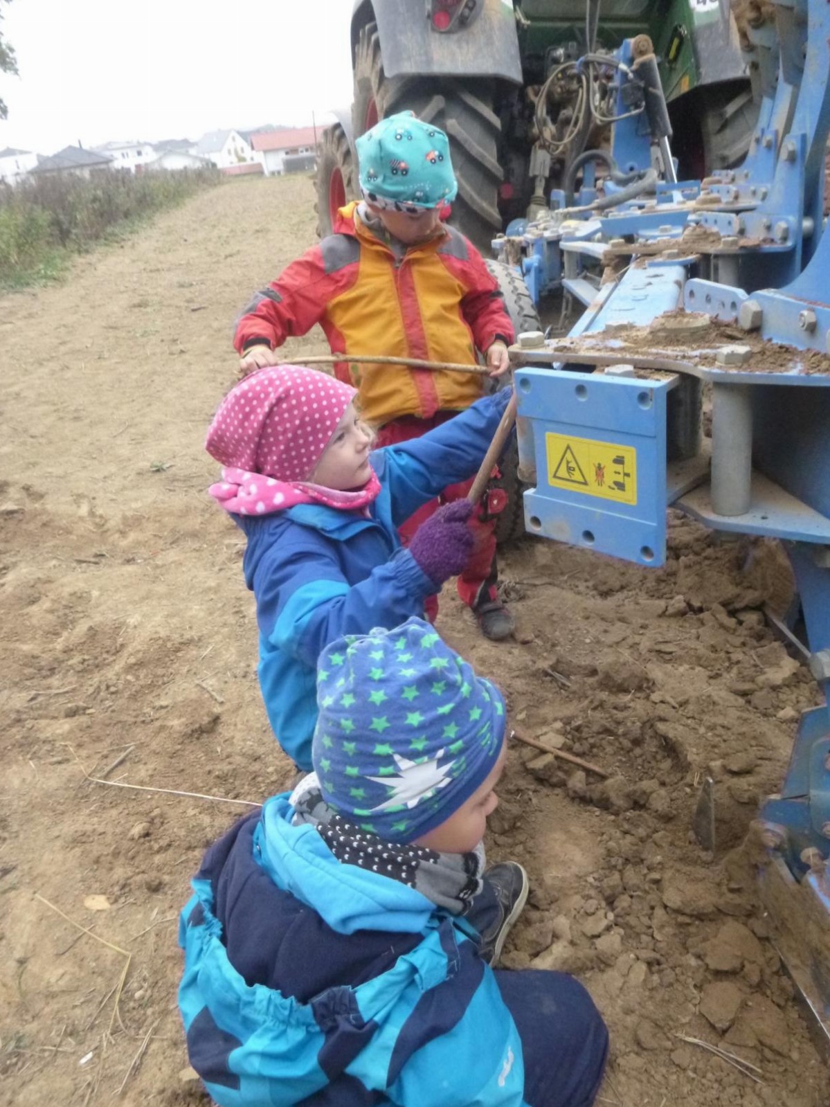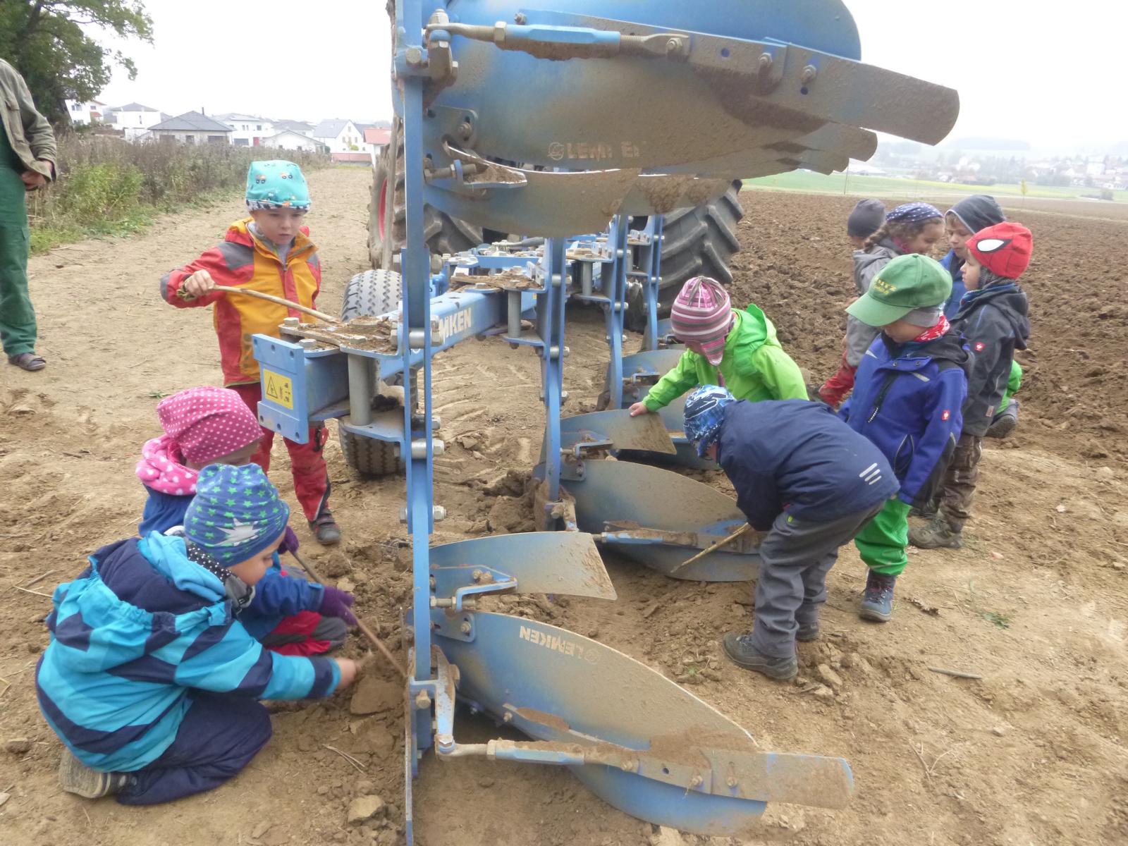 Ganz interessiert beobachteten die Kinder dann den echten Bulldog, der eines Tages das Feld umpflügte und für die nächste Aussaat herrichtete. Und ganz genau konnten die Waldlauser dann endlich alles untersuchen, als Herr Rottenwallner mit seinem Bulldog anhielt. Ehrfurchtsvoll wurden die scharfen Pflugscharen betastet und gezählt und die Zugmaschine fachmännisch in Augenschein genommen.  Und als sich Herr Rottenwallner wieder an die Arbeit machte, taten es ihm etliche Waldlauser - auf ihre Art - gleich.