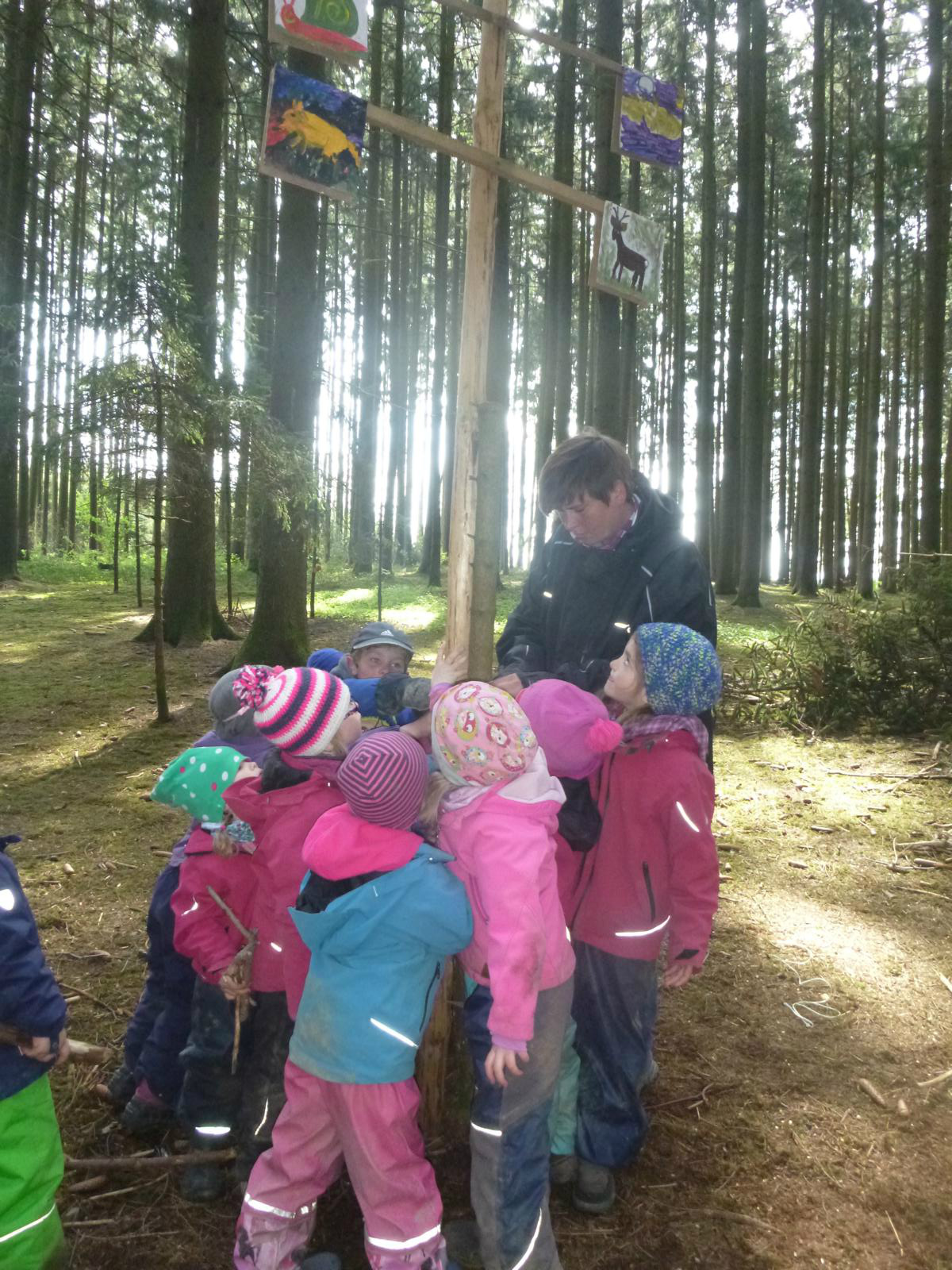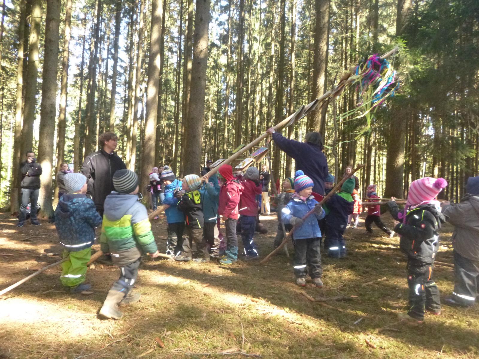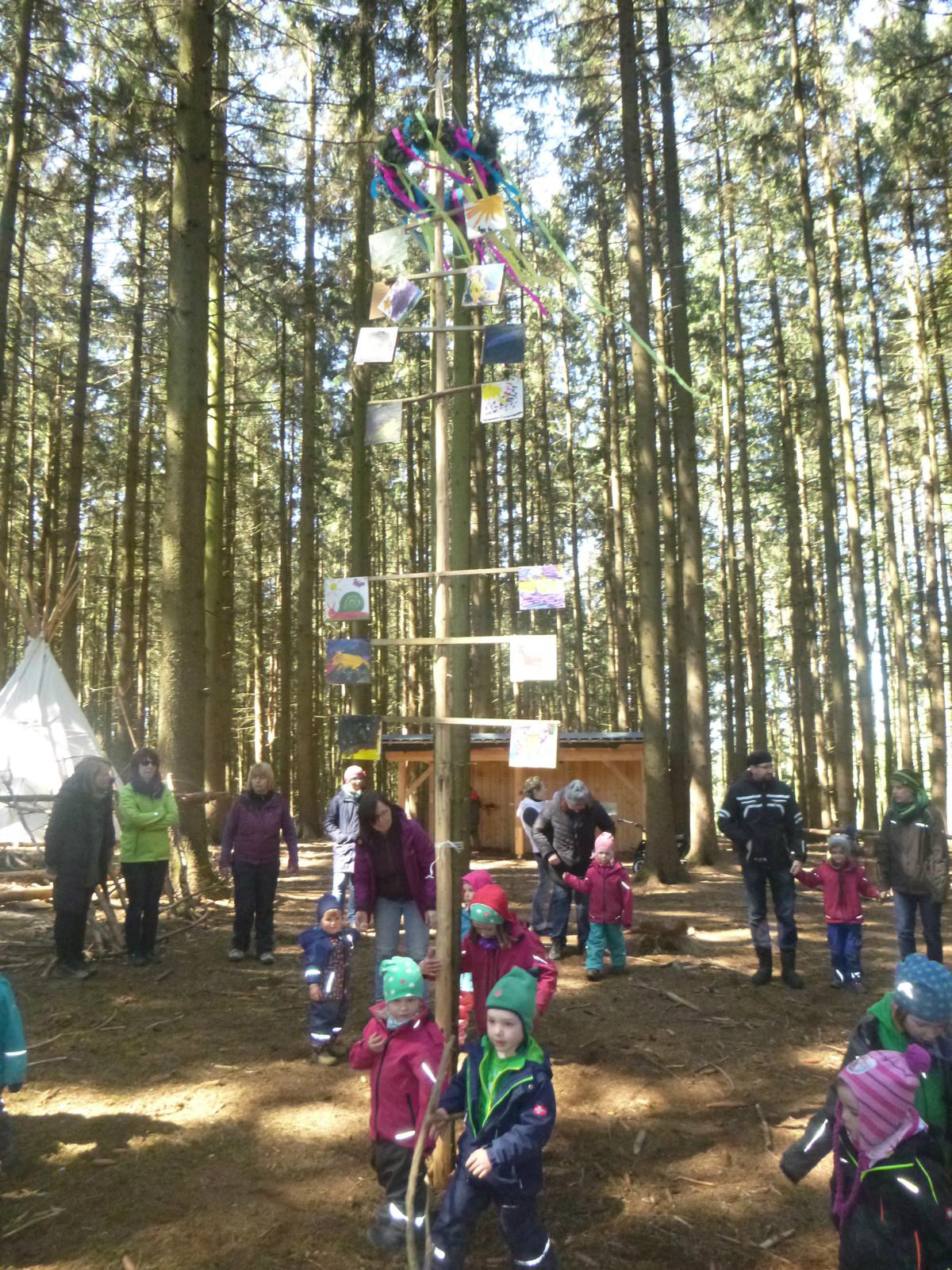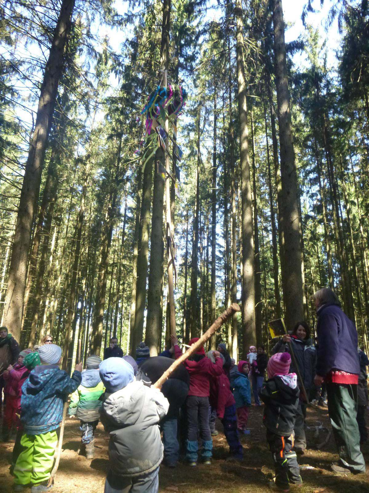 Alles hatten die Kinder in den letzten Tagen schon vorbereitet: Der alte Maibaum wurde umgelegt und mit weiteren Tafeln - für jedes Kind eine - bestückt, der Kranz bekam ein neues grünes Kleid und die Musikkapelle hatte schon tüchtig geprobt. Tänze und Lieder wurden mit viel Schwung und Gelächter einstudiert und in der Waldküche stand schon das Gierschpesto, die Kräuterlimonade, Schnittlauch- und Blütenbrote bereit. Jetzt fehlten nur noch die Eltern, die zum Maifest eingeladen waren und.........der Maibaum!
