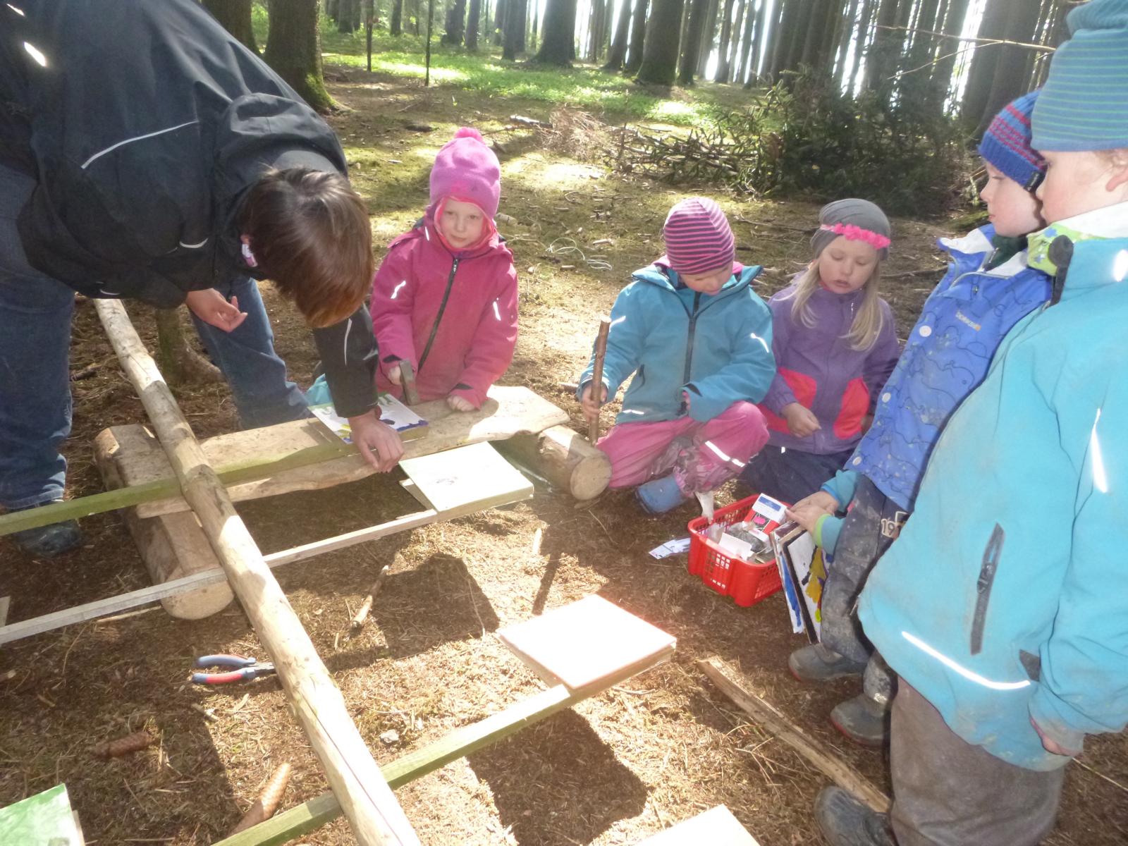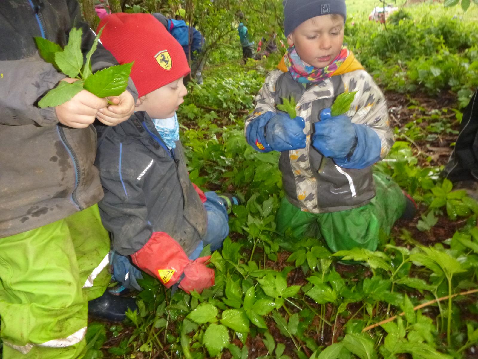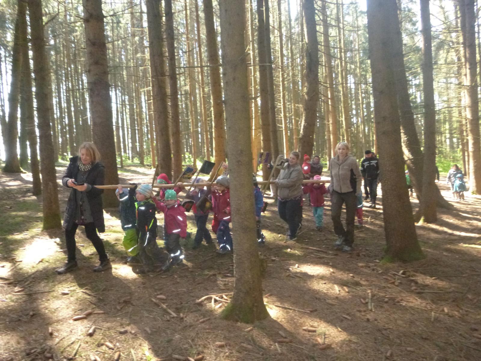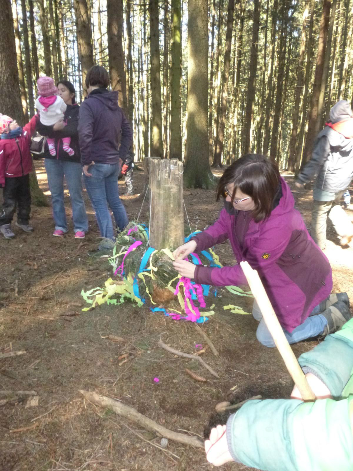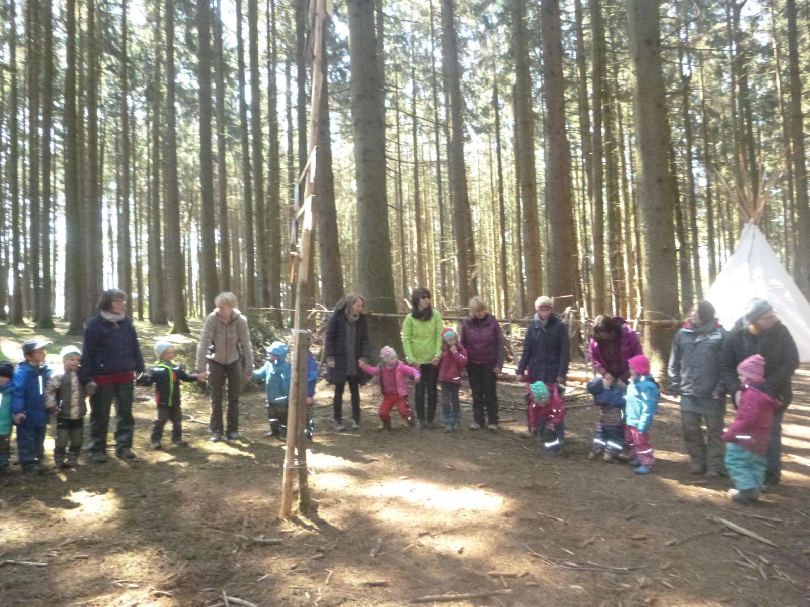 Alles hatten die Kinder in den letzten Tagen schon vorbereitet: Der alte Maibaum wurde umgelegt und mit weiteren Tafeln - für jedes Kind eine - bestückt, der Kranz bekam ein neues grünes Kleid und die Musikkapelle hatte schon tüchtig geprobt. Tänze und Lieder wurden mit viel Schwung und Gelächter einstudiert und in der Waldküche stand schon das Gierschpesto, die Kräuterlimonade, Schnittlauch- und Blütenbrote bereit. Jetzt fehlten nur noch die Eltern, die zum Maifest eingeladen waren und.........der Maibaum!