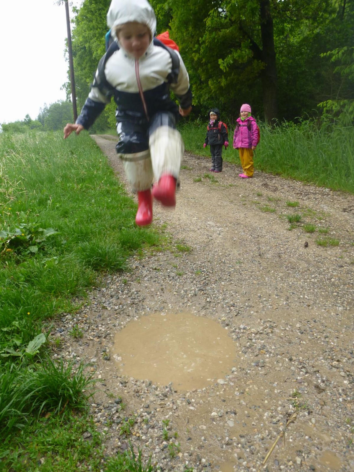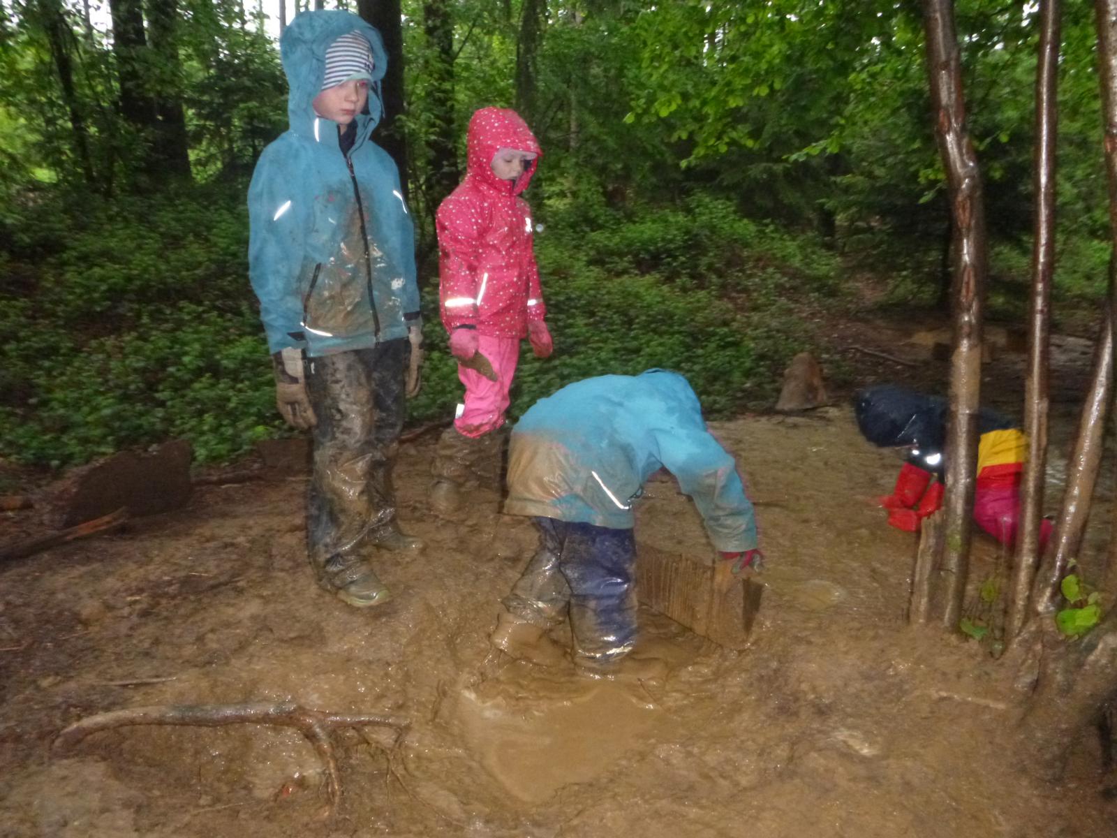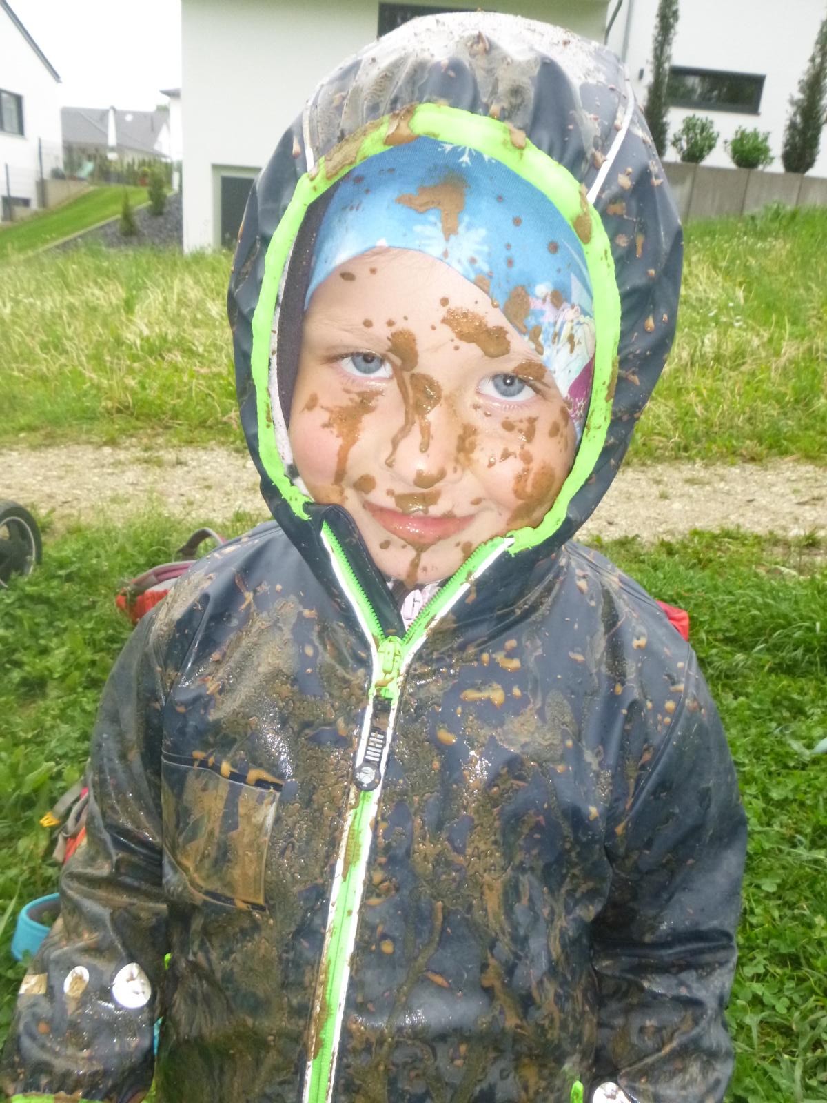 Nicht nur die von der andauernden Trockenheit geplagte Natur freute sich über die Regentage im Mai, auch die Waldlauser hatten ihr großes Vergnügen damit. Endlich gab es wieder Pfützen, die man „leerspringen“ konnte, baatzige Erde, die man als Beton, Knödelmasse, Malfarbe, Rutschbahn und vieles andere nutzen konnte. Der Phantasie sind hier keine Grenzen gesetzt und der Begriff „Spritztour“ bekommt hier mit einem mal eine ganz neue Bedeutung.