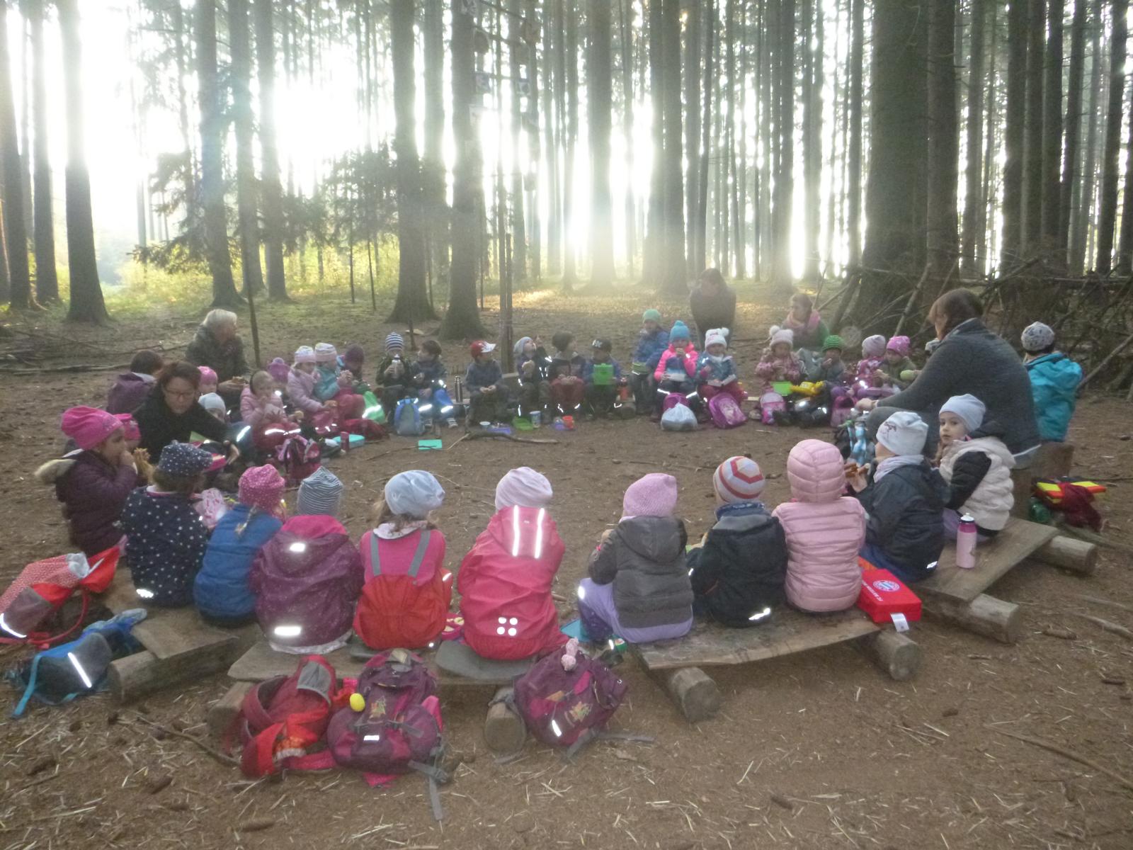 Bereits im Oktober hatten sich die künftigen Schulkinder des St.-Nikolaus-Kindergartens auf den Weg ins Lausbacher Holz gemacht. Mit großem Hallo wurden die künftigen Schulfreunde begrüßt und mit den Gebräuchen im Wald bekannt gemacht. In großer Runde ließ es sich gemütlich Brotzeitmachen und einer lustigen Spinnengeschichte lauschen. Gemeinsam wurden Häuser gebaut und Kletterbäume erklommen, gesägt und geschnitzt und so mancher Schatz gehoben.