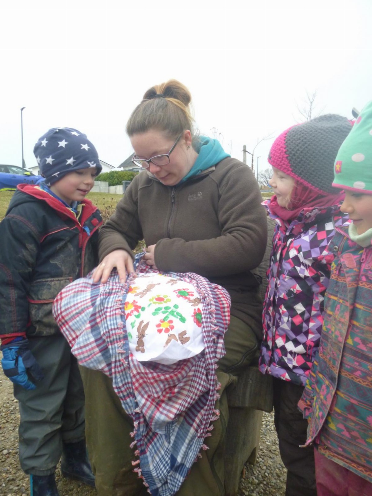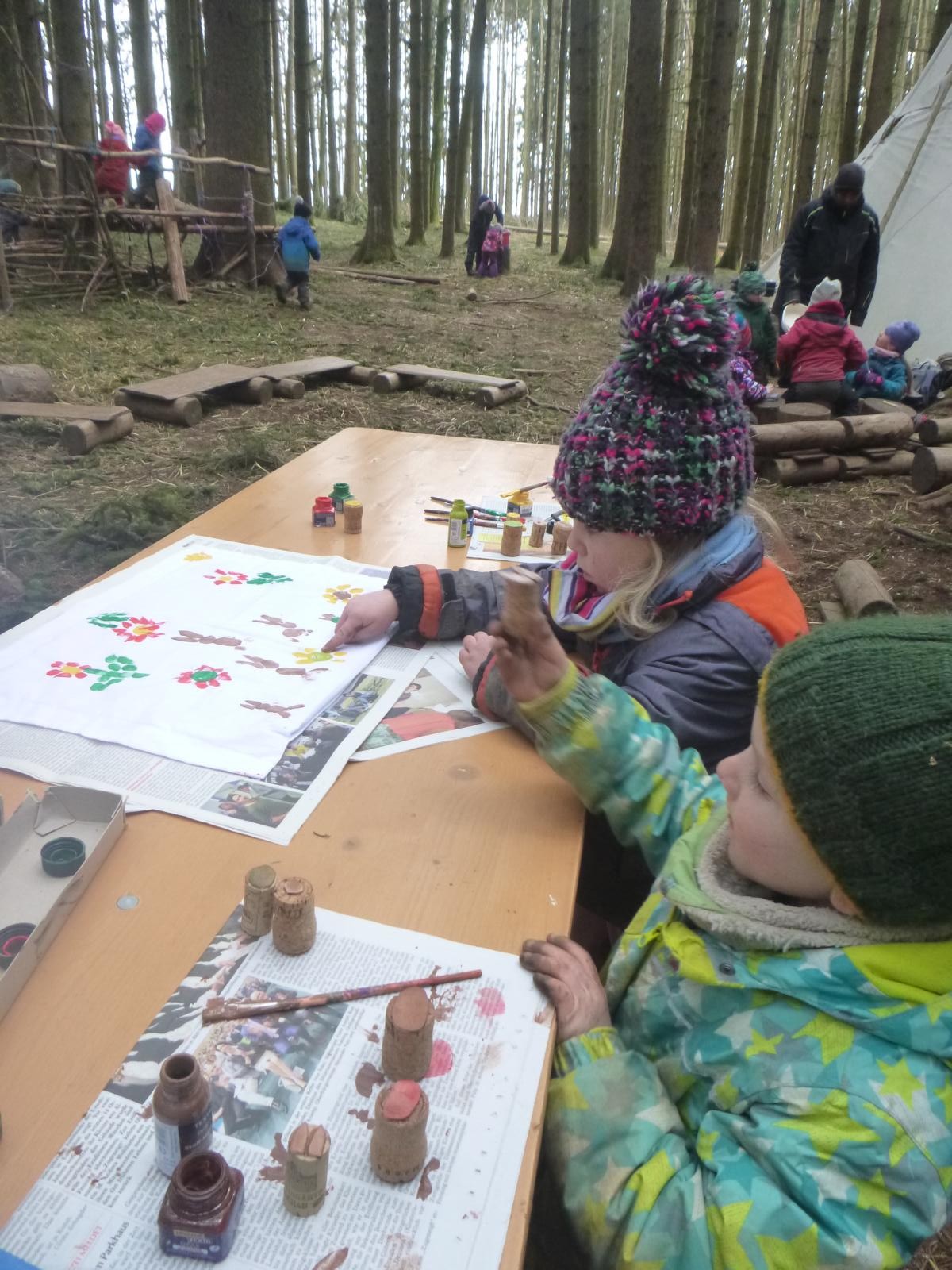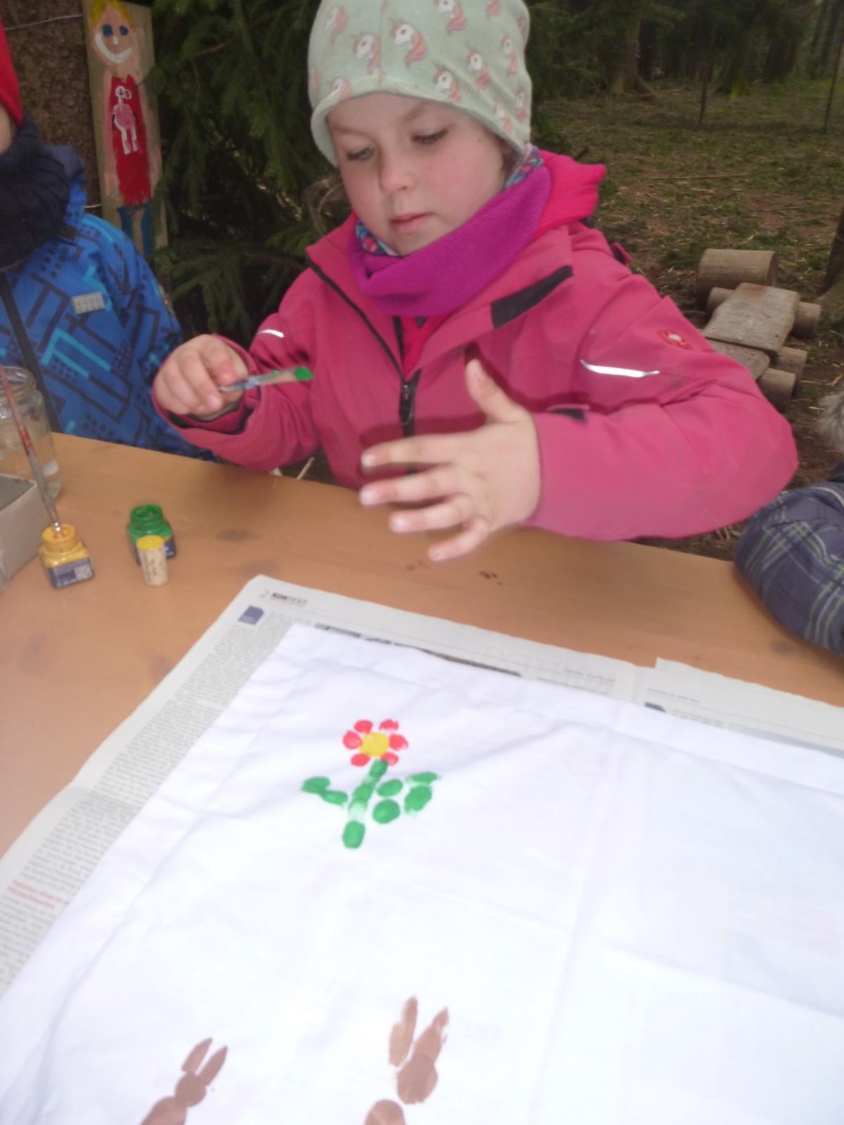 Korken, Finger und Farbe! Mehr braucht es nicht, um ein fröhliches Osterbild zu gestalten. Hasen hoppeln da nach kurzer Zeit über die Wiese und viele unterschiedliche Blumen erblühen. Das fertige "Bild" - auf Stoff gedruckt - macht doppelt Freude: den Kindern beim Gestalten und Daniela als Geburtstagsgeschenk!