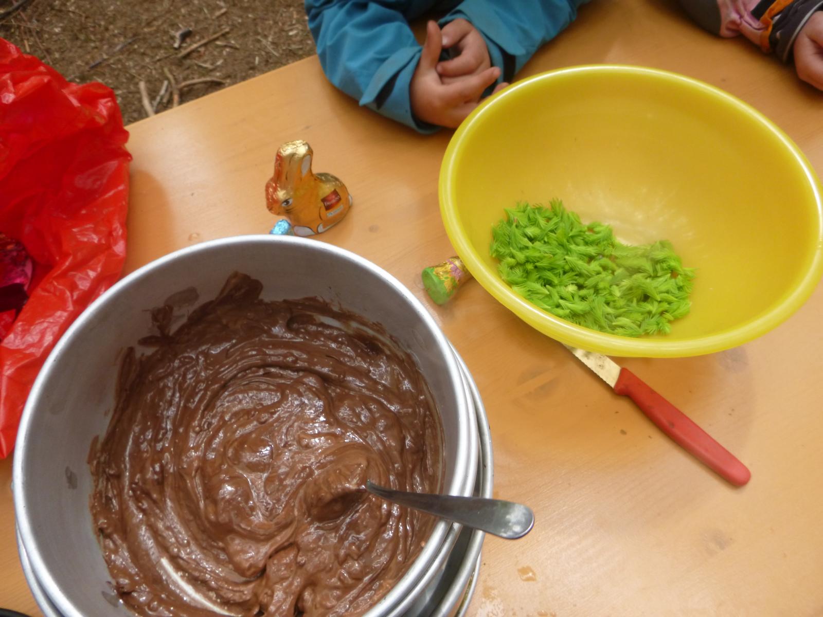 Ganz junge Fichtentriebe werden in flüssige Schokolade getaucht ( da kommen uns ein paar übriggebliebene Osterhasen gerade recht.....) und auf Pergamentpapier getrocknet. Ein wenig Naschen gehört da natürlich dazu!