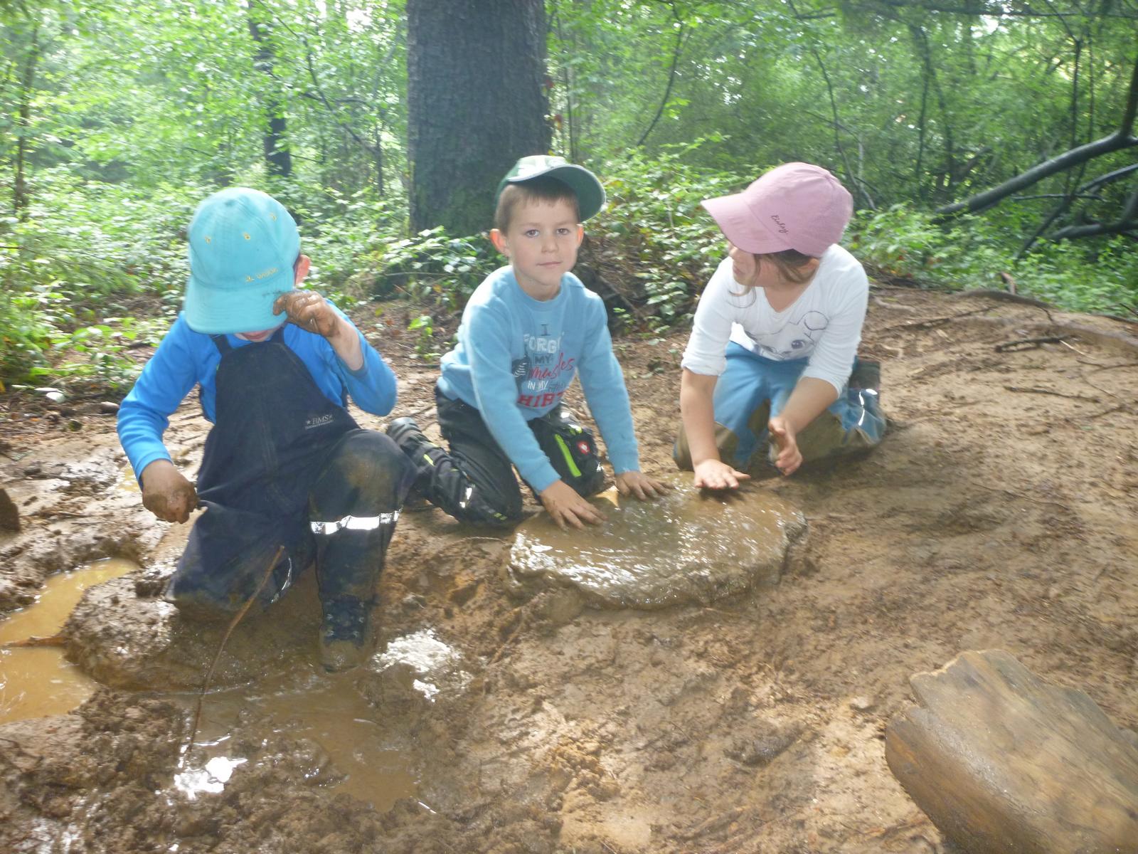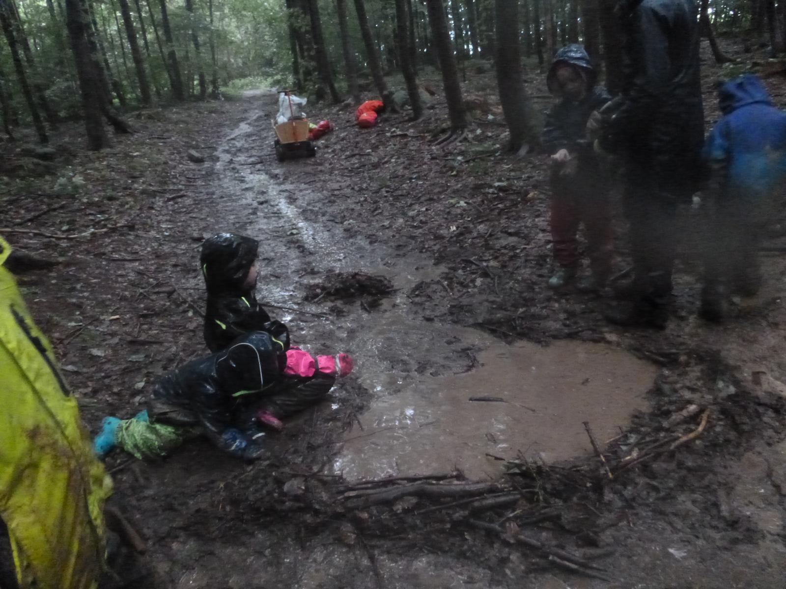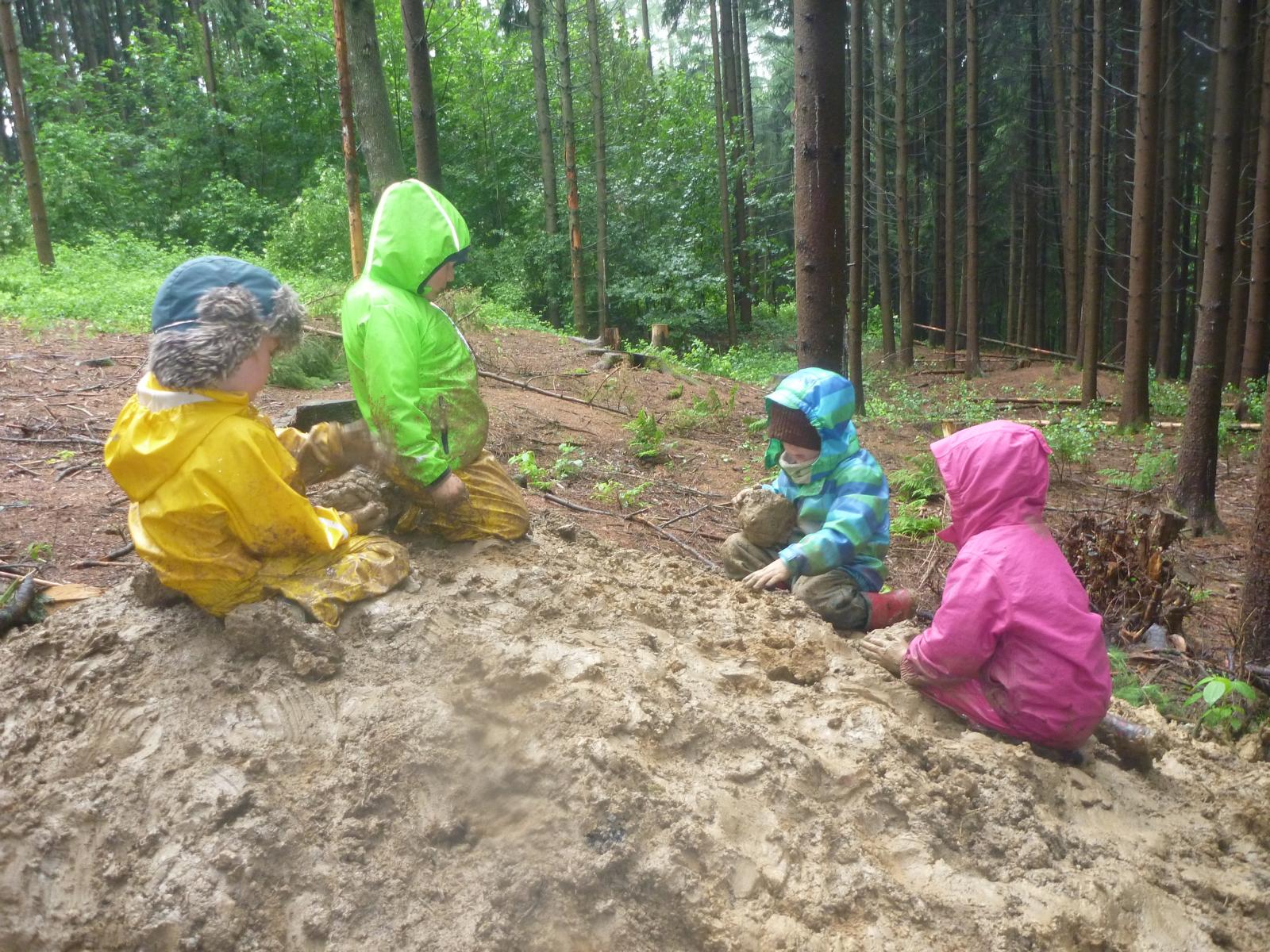 Dauerregen? Für die meisten Zeitgenossen eine eher verdrießliche Angelegenheit! Nicht so für die wetterfesten Waldlauser. Regen bedeutet experimentieren, ausprobieren und natürlich Spaß haben. Sie erleben, wie die Luft wohltuend gereinigt wird und die Pflanzenwelt das kostbare Nass mit rasantem Wachstum dankt. Die Erde, sonst oft staubig und knochentrocken, kann bearbeitet werden und der „Baatz“ lädt zum Bauen, Formen und sogar zum Malen ein. Und so ganz nebenbei merken die Kinder, wie es das Selbstbewusstsein stärkt, wenn man auch mal widrige Situationen wie klamme Finger und nasse Füße aushalten kann.