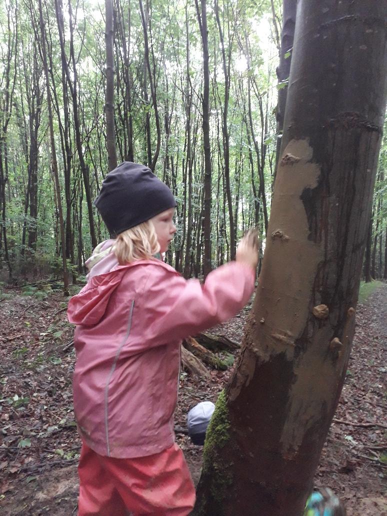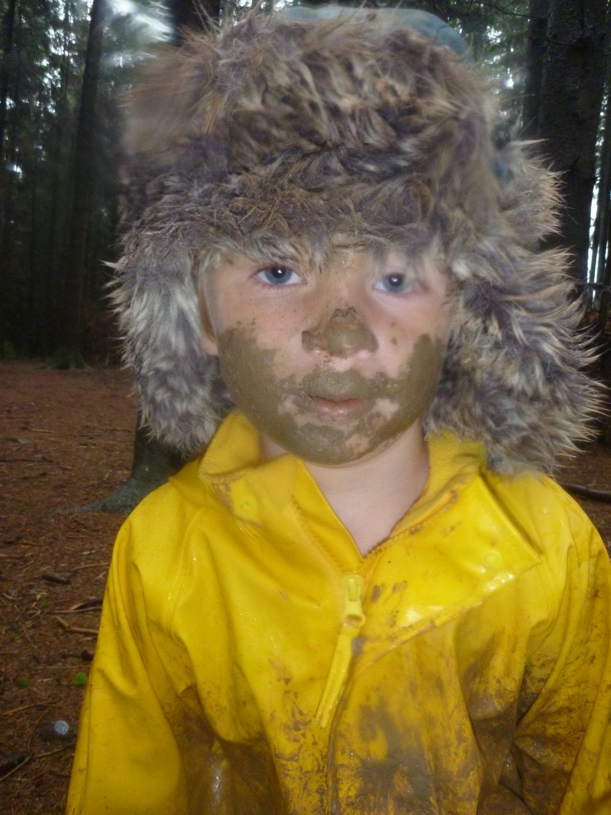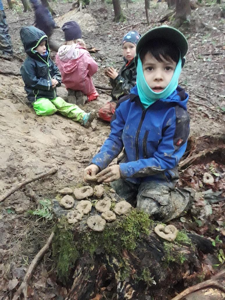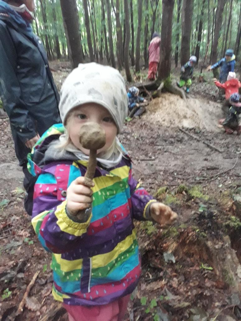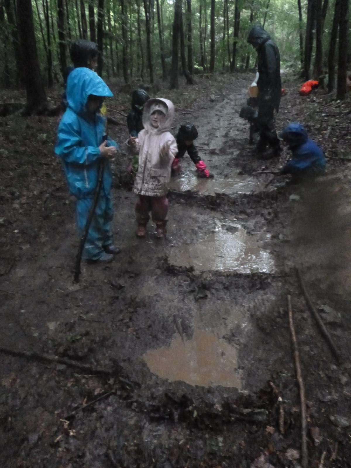 Dauerregen? Für die meisten Zeitgenossen eine eher verdrießliche Angelegenheit! Nicht so für die wetterfesten Waldlauser. Regen bedeutet experimentieren, ausprobieren und natürlich Spaß haben. Sie erleben, wie die Luft wohltuend gereinigt wird und die Pflanzenwelt das kostbare Nass mit rasantem Wachstum dankt. Die Erde, sonst oft staubig und knochentrocken, kann bearbeitet werden und der „Baatz“ lädt zum Bauen, Formen und sogar zum Malen ein. Und so ganz nebenbei merken die Kinder, wie es das Selbstbewusstsein stärkt, wenn man auch mal widrige Situationen wie klamme Finger und nasse Füße aushalten kann.