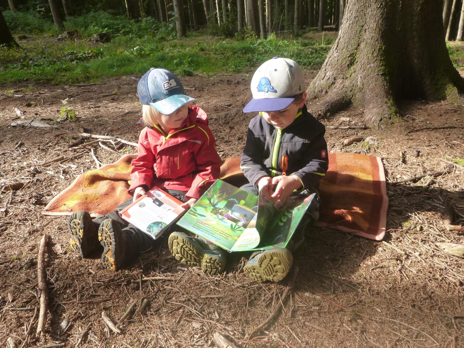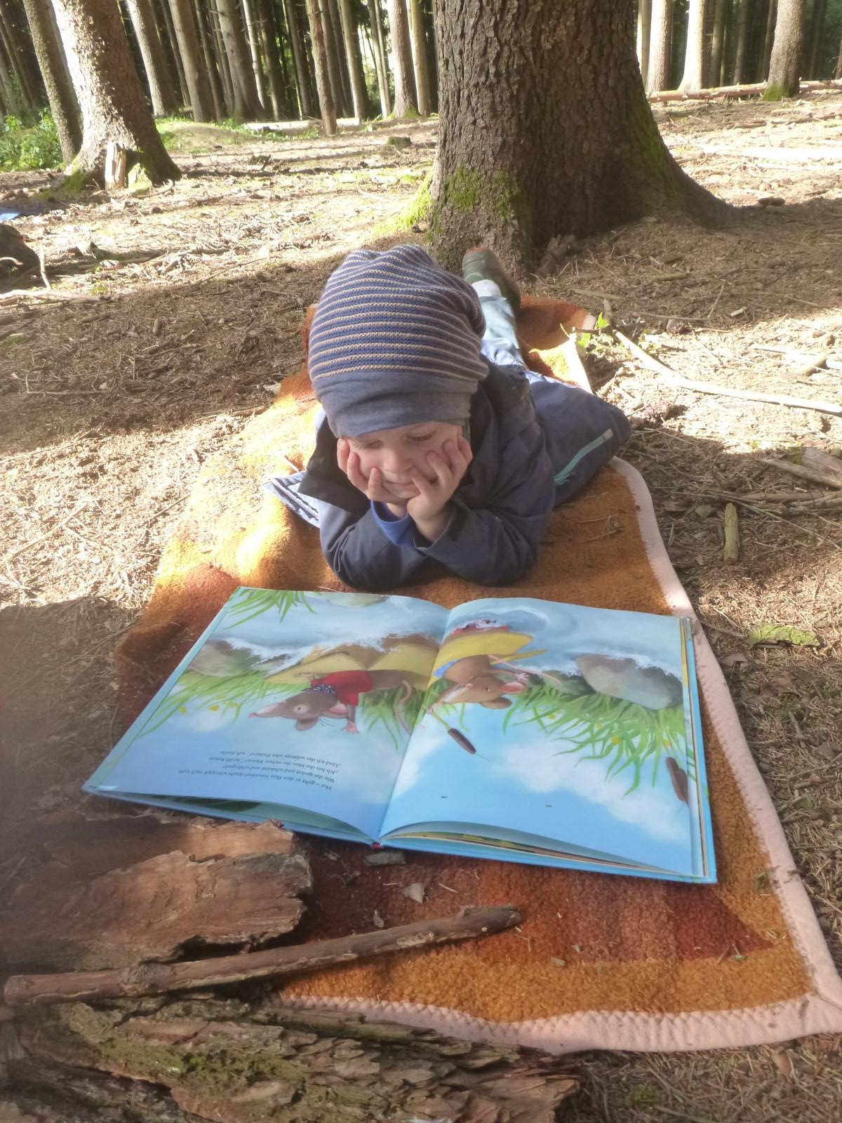Erst gibt es eine Bilderbuchgeschichte für alle und dann kann nach Herzenslust geschmökert werden. Auf kleinen Leseinseln machen es sich die Waldlauser gemütlich und genießen im frühherbstlichen Sonnenschein die mitgebrachten Bücher zu den unterschiedlichsten Themen. Jeder hat da so seine Methode….