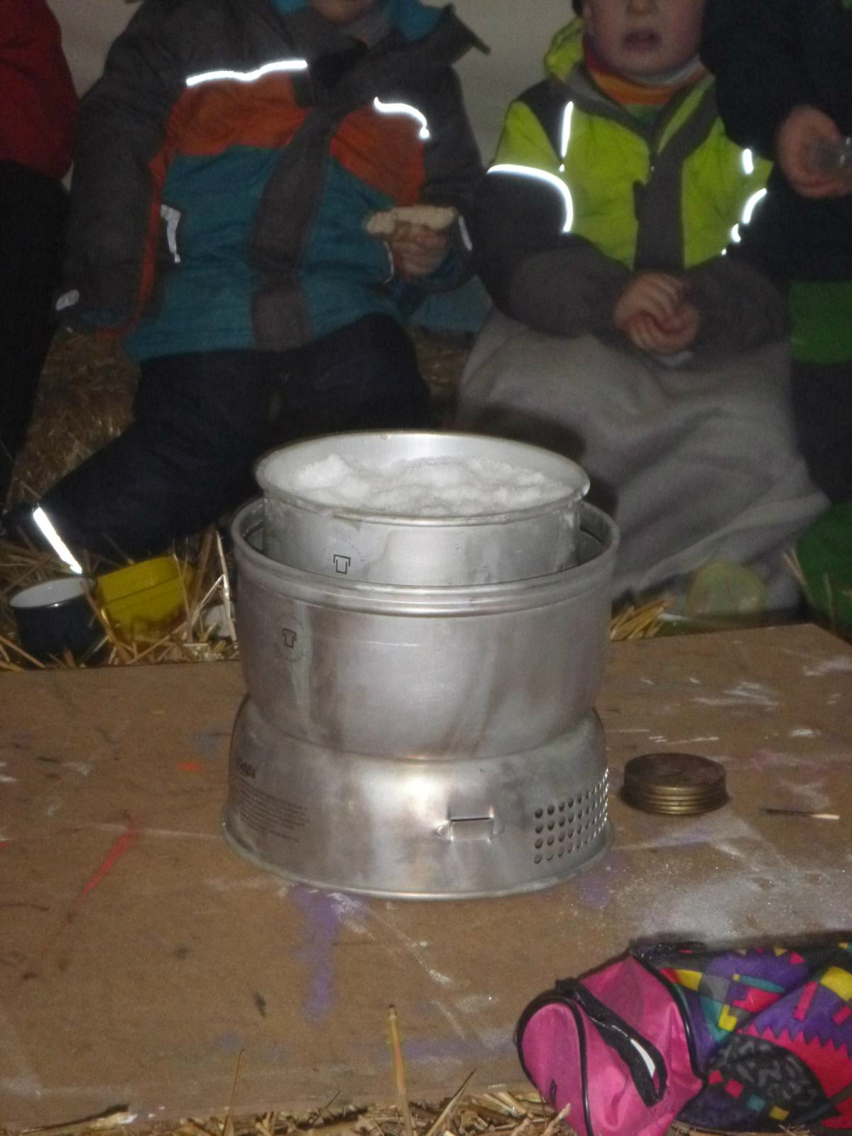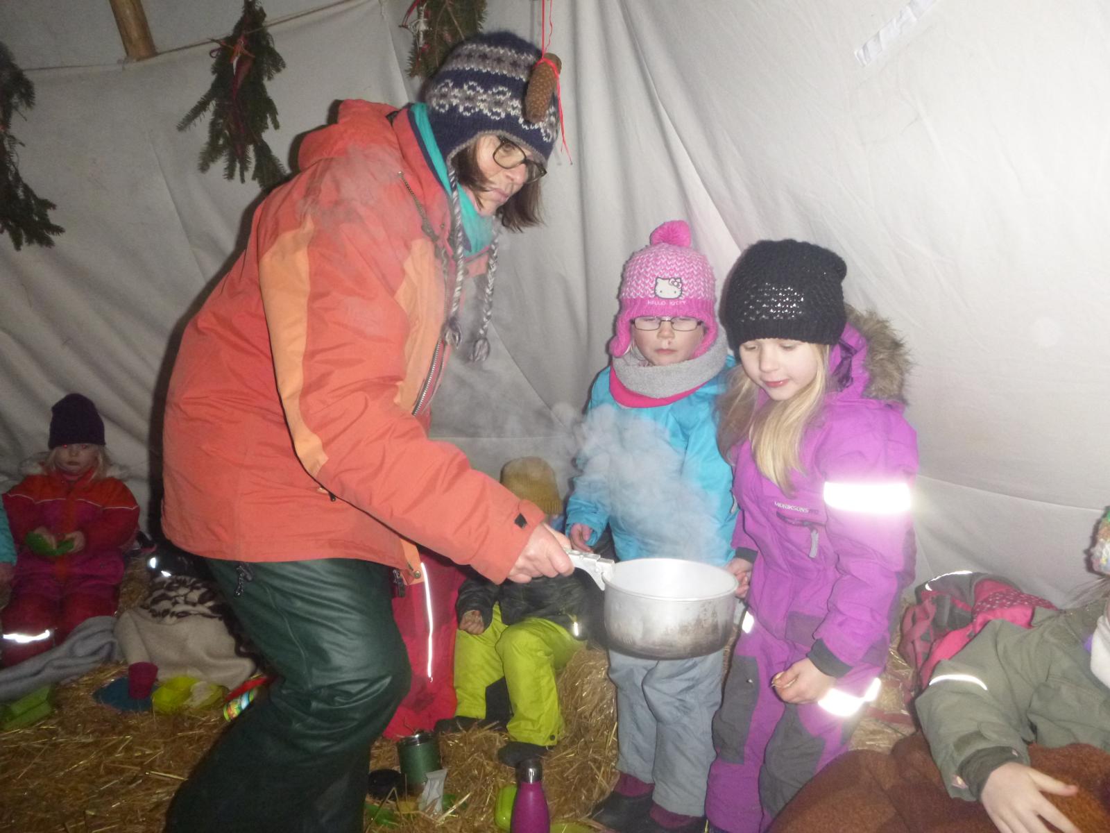 Zur Brotzeit kuscheln wir uns ins strohbefüllte Tipi. Dort warten heißer Tee, warme Decken und Geschichten.