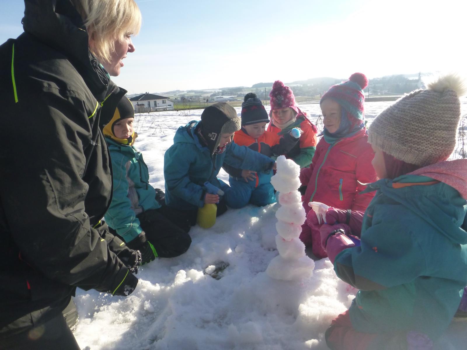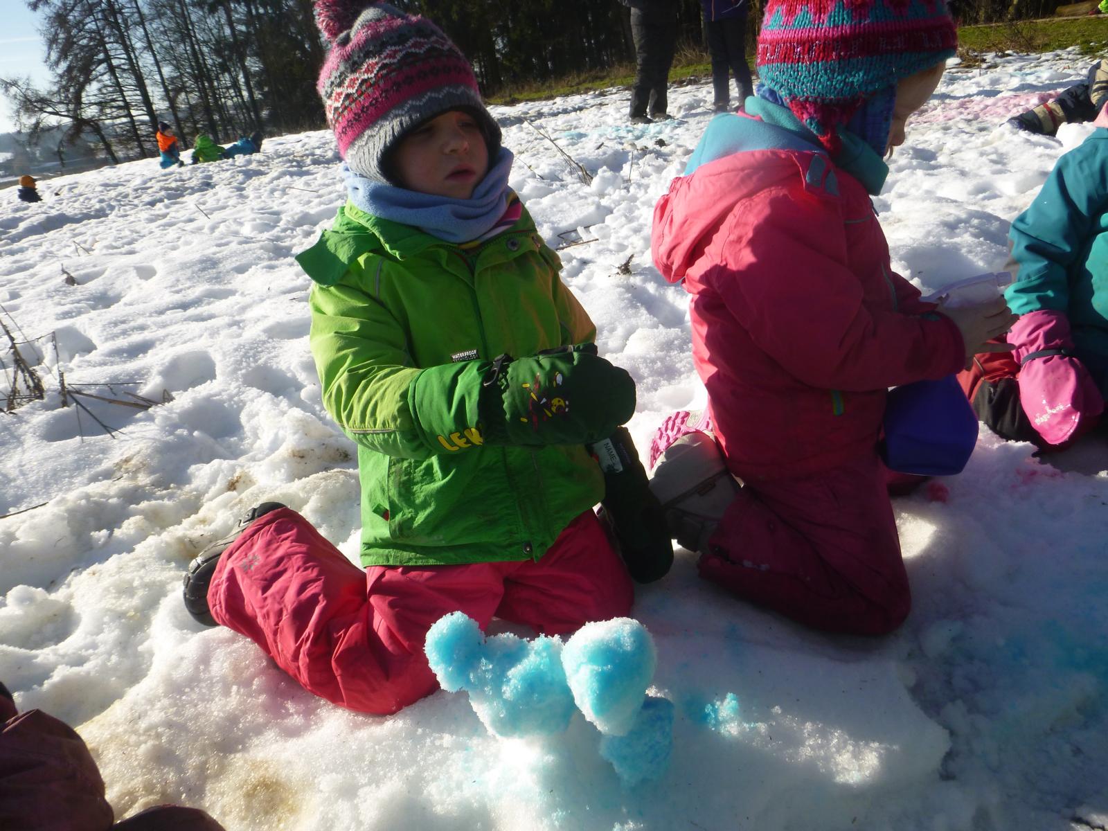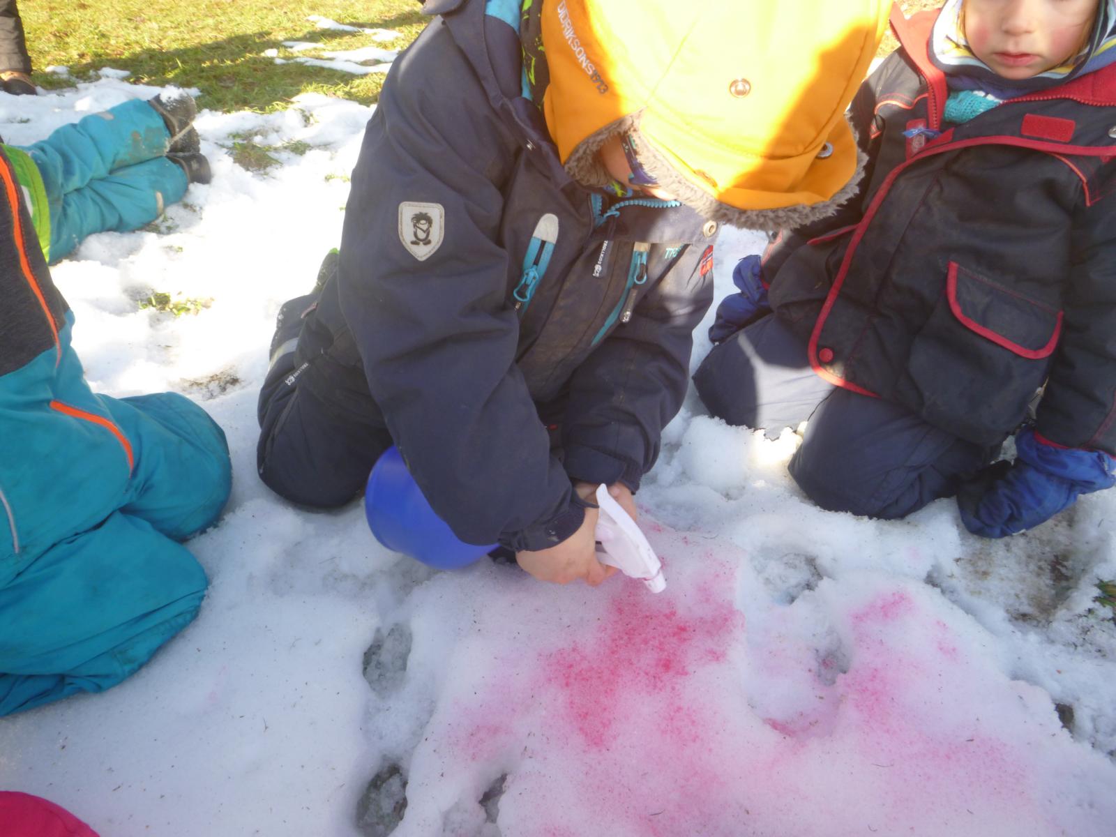 Die andauernden Minustemperaturen ermöglichen vielerlei Experimente mit Eis und Schnee und laden die kleinen Forscher zum Ausprobieren ein. Und mit Sprühflasche und Lebensmittelfarbe entstehen bunte Gemälde in der weißen Winterlandschaft.