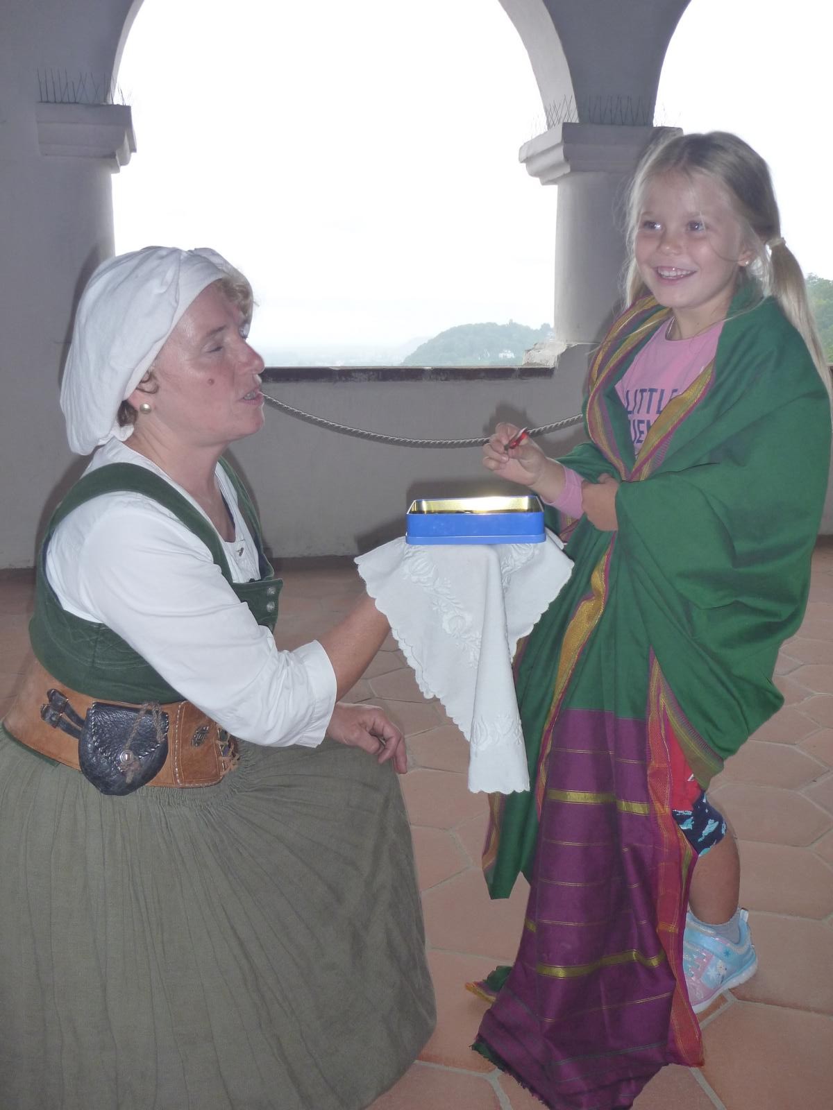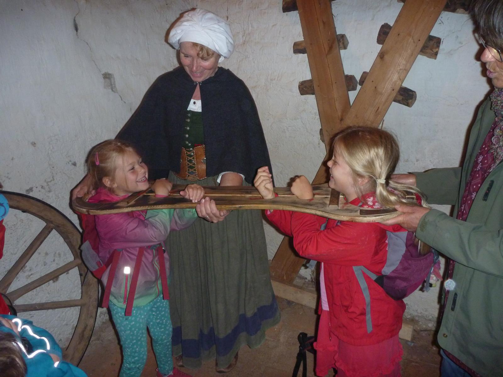 Oben auf der Burg erwartete uns schon die Magd Dorothee. Die wusste viel zu erzählen und zeigte uns, wie es denn zugegangen war in den vergangenen Jahren dort oben auf der Burg. Die Kinder waren fasziniert von den Geschichten, durften vieles selbst ausprobieren und am eigenen Leibe spüren wie es war, am Pranger zu stehen oder als Herzog auf dem Plumpsklo Gäste zu empfangen. Und auch wenn die Faszination von Rittern und Burgdamen groß ist, am Ende waren die Waldlauser doch froh, wieder in ihre Welt zurückkehren zu können.