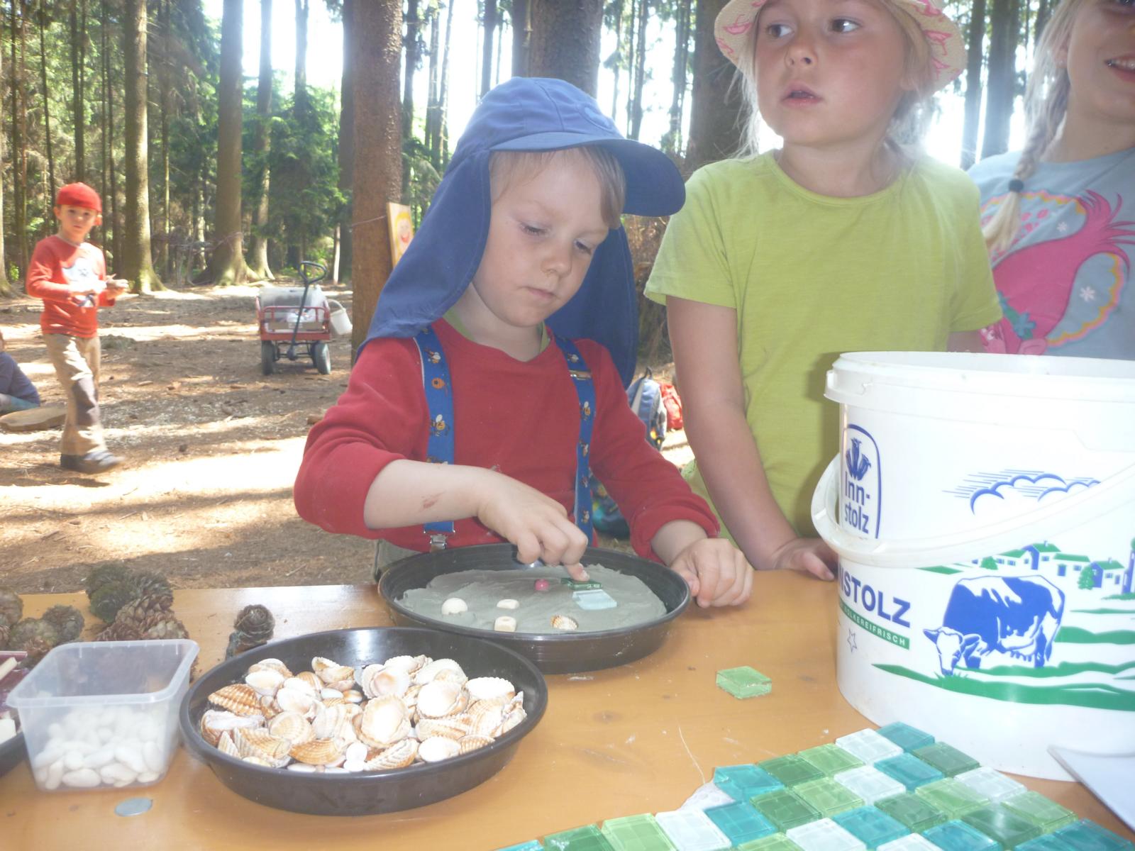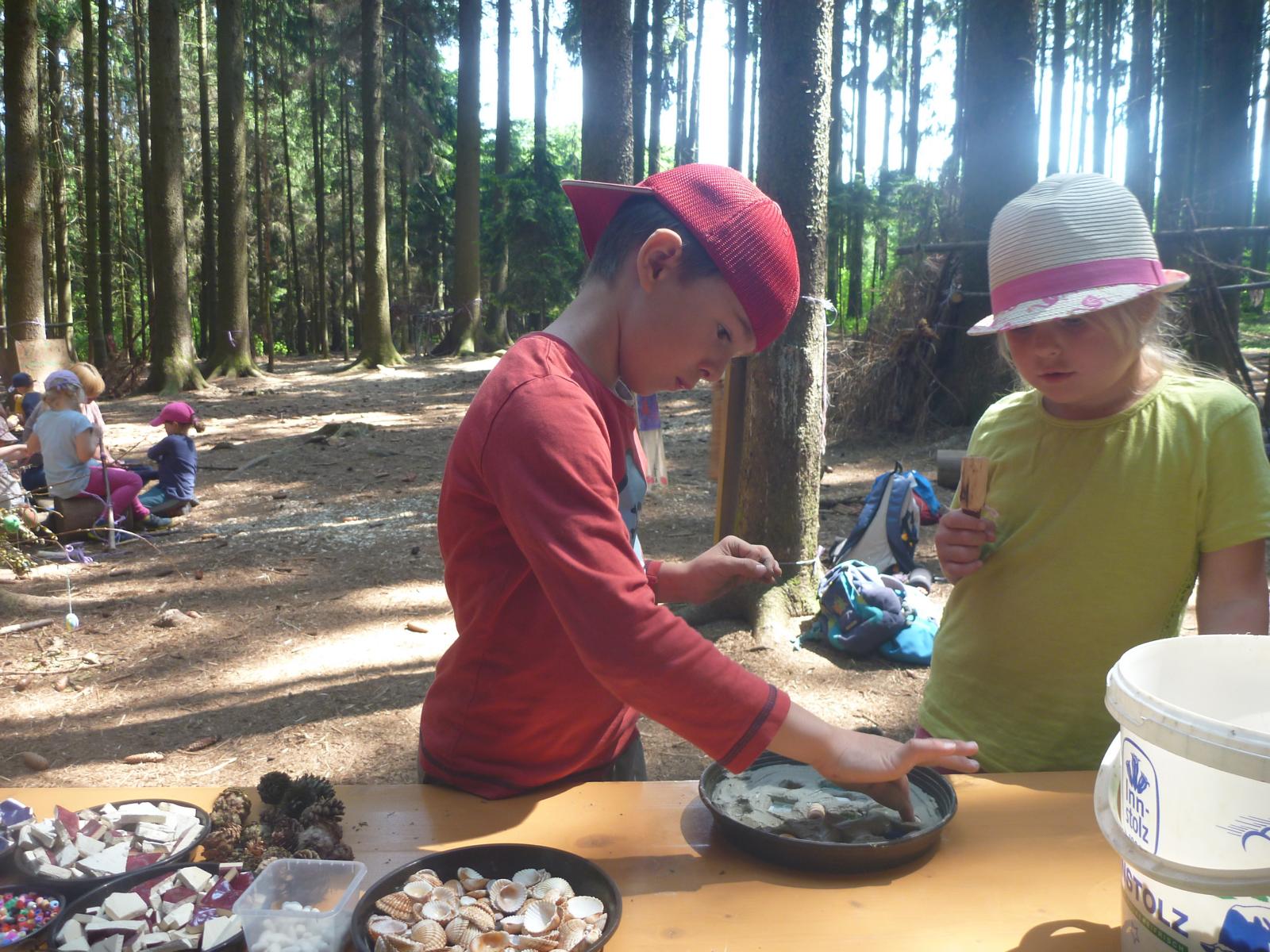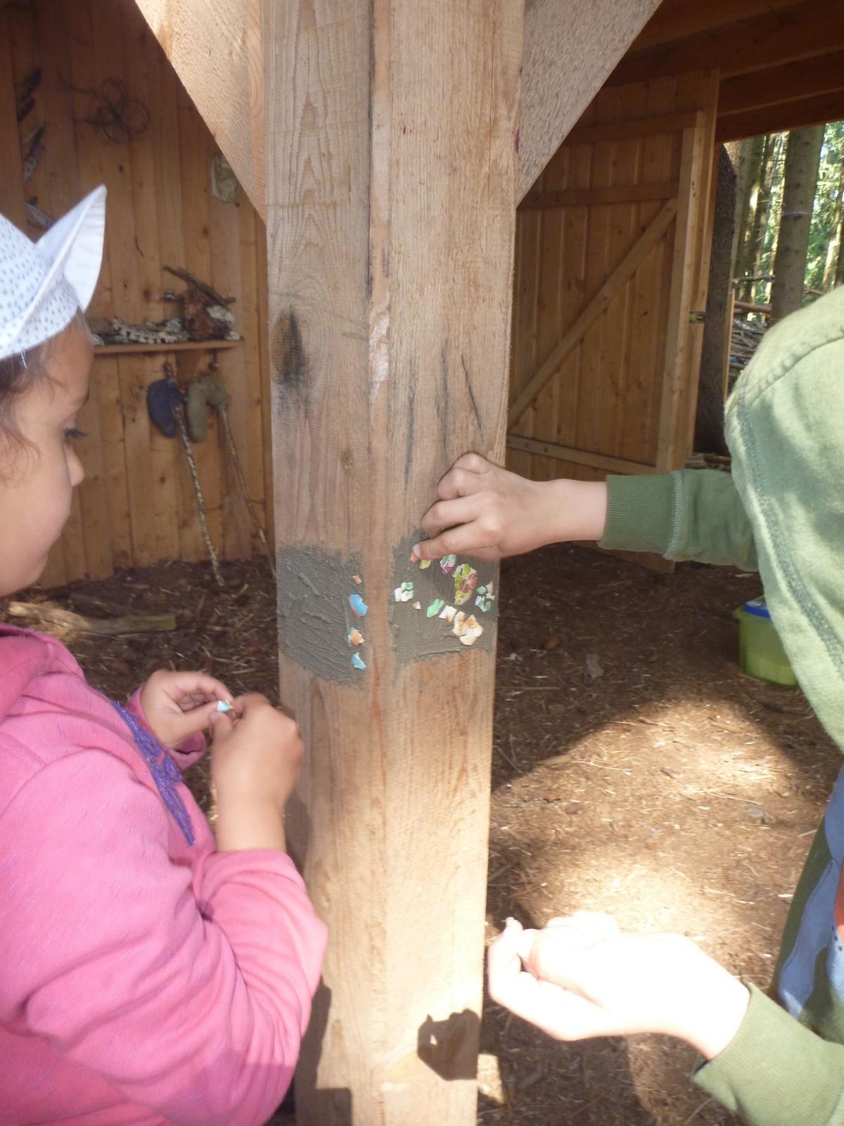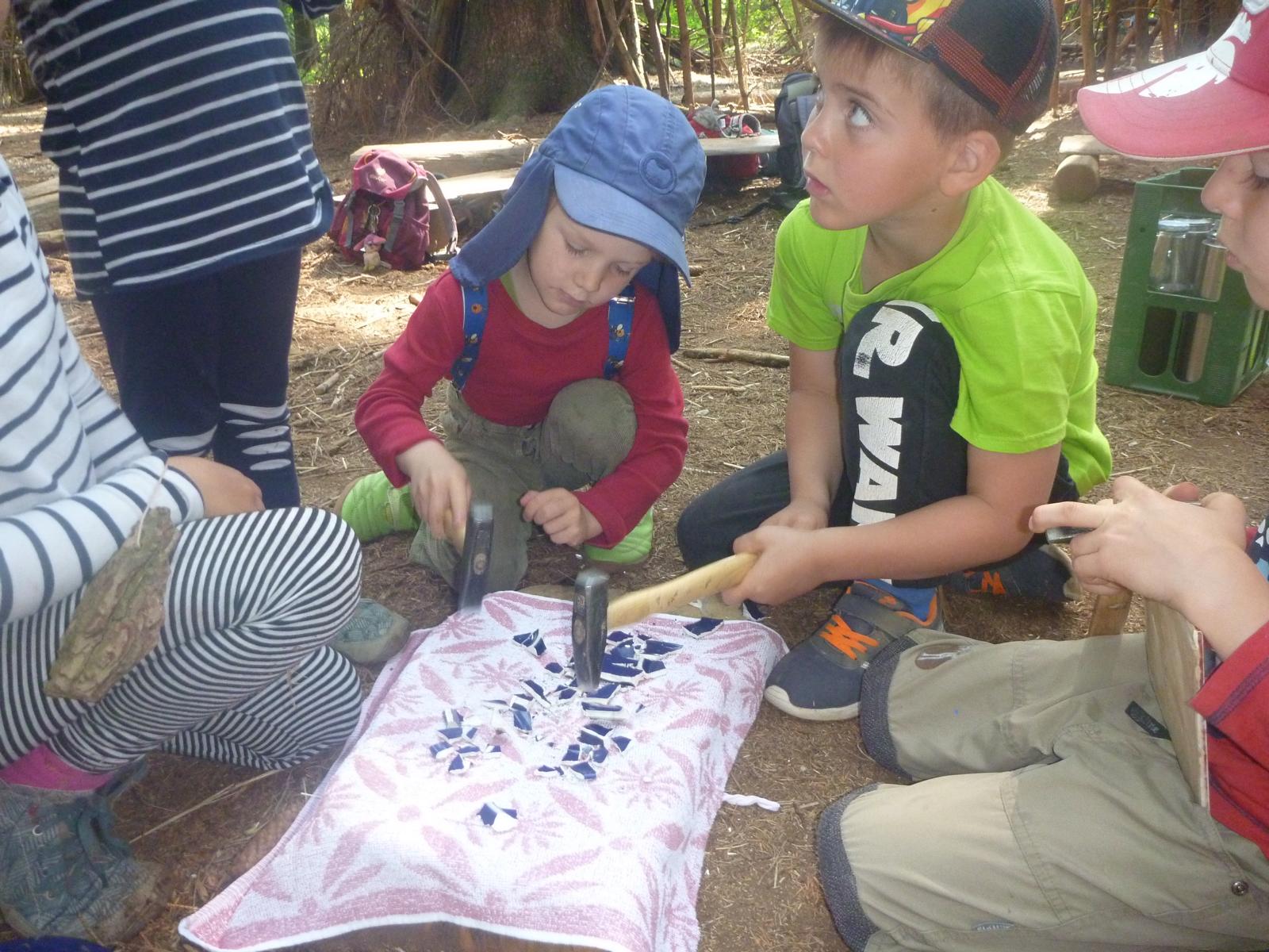 Mit dem Hammer Teller und Spiegel zerschlagen? Was normalerweise nicht erlaubt ist - diesmal durften es die Waldlauser. Denn für ein Geschenk an die Eltern wurden viele bunte Mosaikteilchen benötigt. Zusammen mit Schätzen aus dem Wald entstand so ein wunderschönes Schmuckstück. Das überreichten die Kinder dann ganz stolz beim Familienpicknick an ihre Eltern.