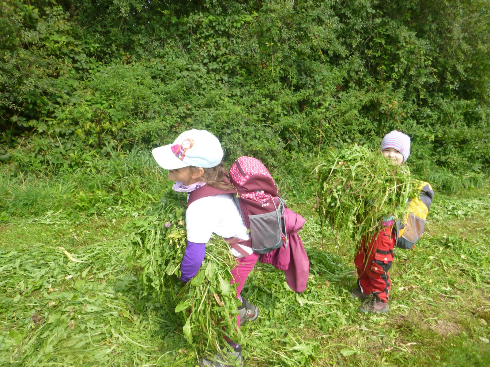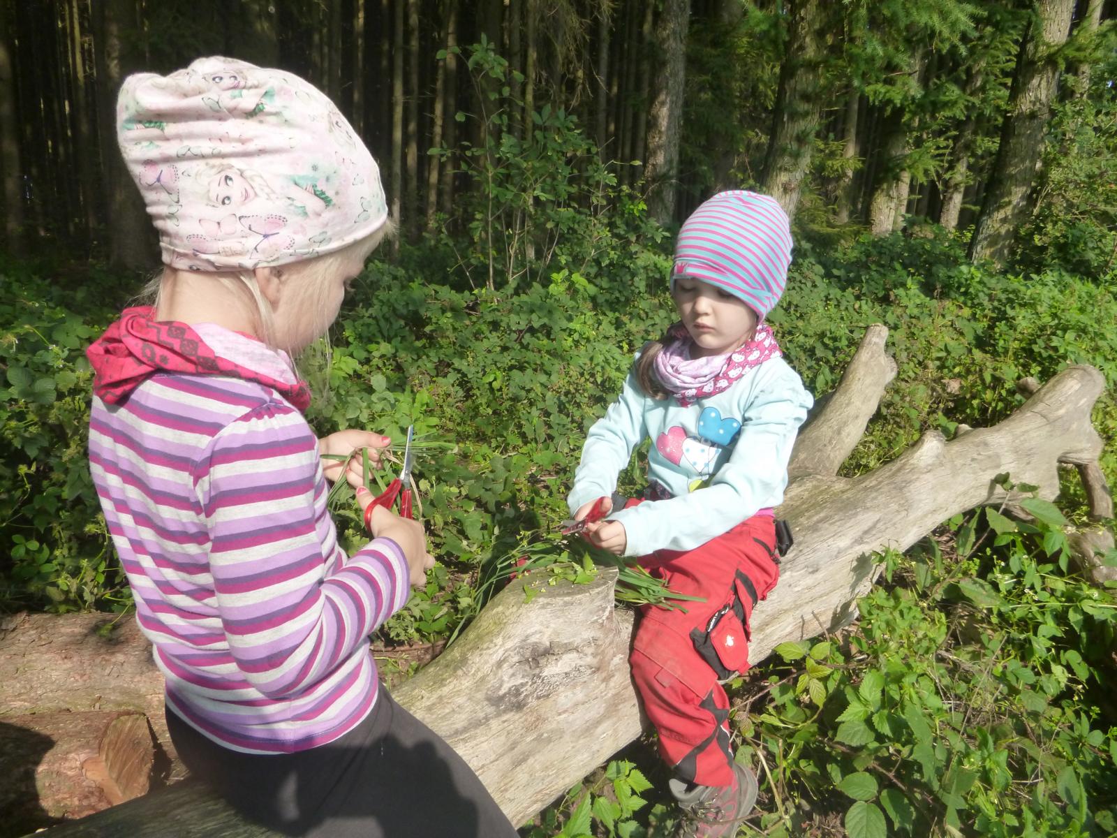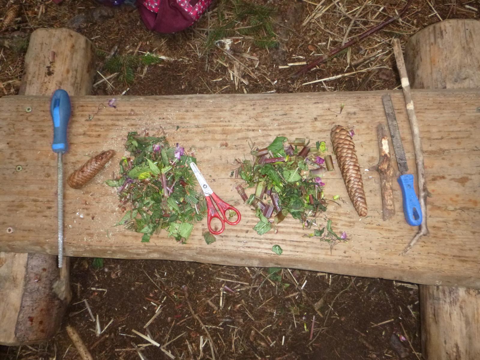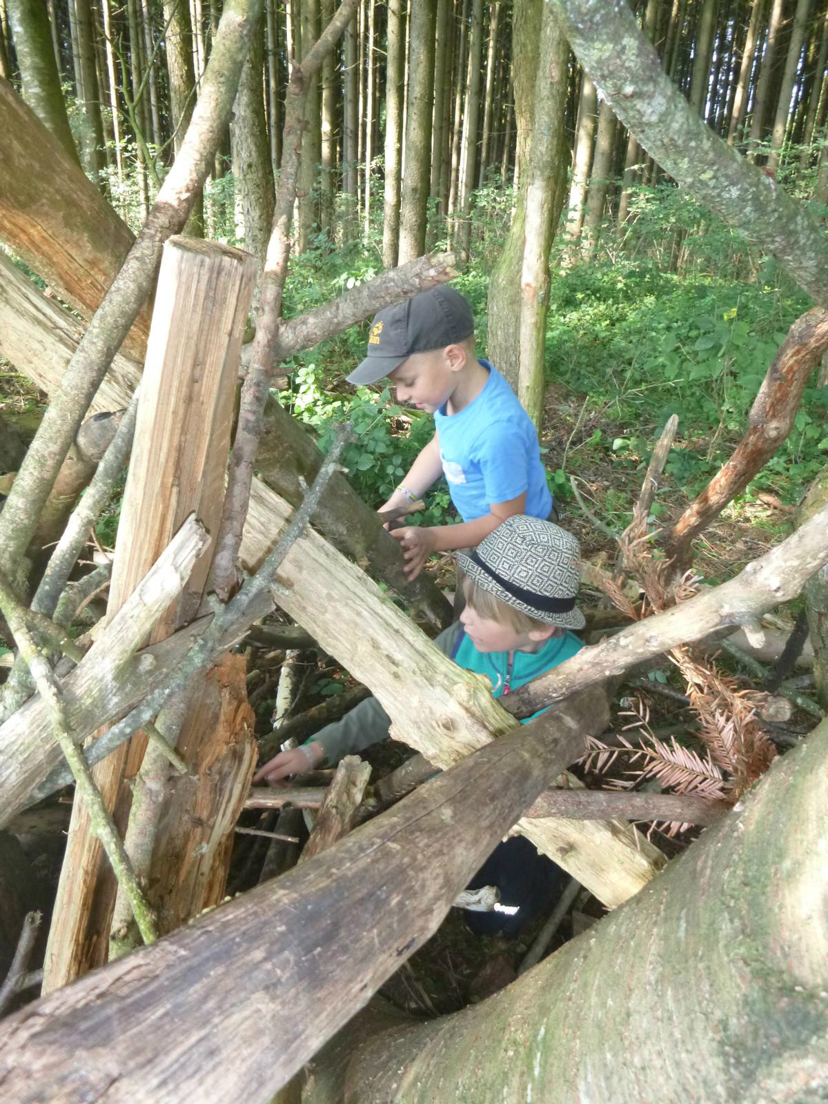 Die vielfältigen Naturmaterialien laden jeden Tag wieder auf’s Neue zum Spielen und Bauen ein. Stöcke haben vielfältige Funktionen – werden als Baumaterial für große und kleine Bauwerke benötigt, zum Graben im sandigen Boden, dienen als Pferd oder Fernrohr. Besonders gerne wird gekocht und gebacken und Gäste werden im Waldrestaurant mit Springkrautpizza, Zapfenwürsteln vom Grill, Geburtstagssandtorte oder Waldsuppe bedient.