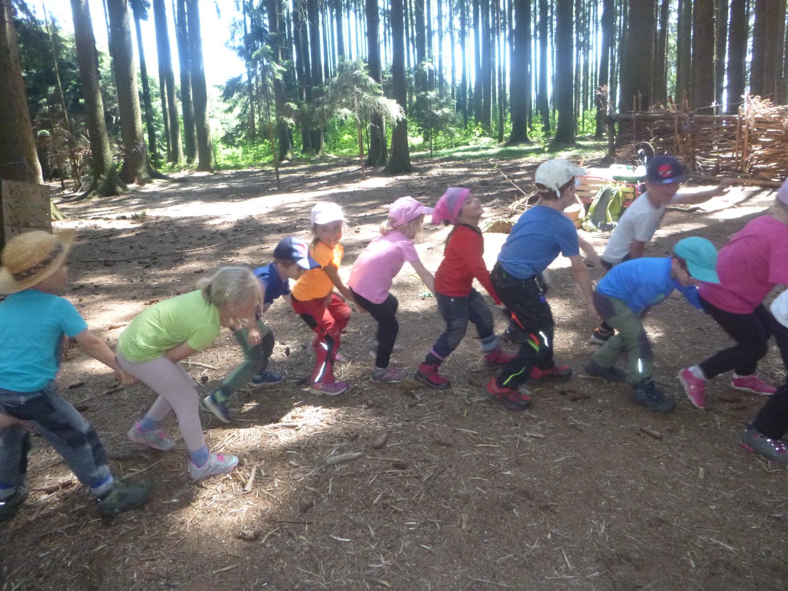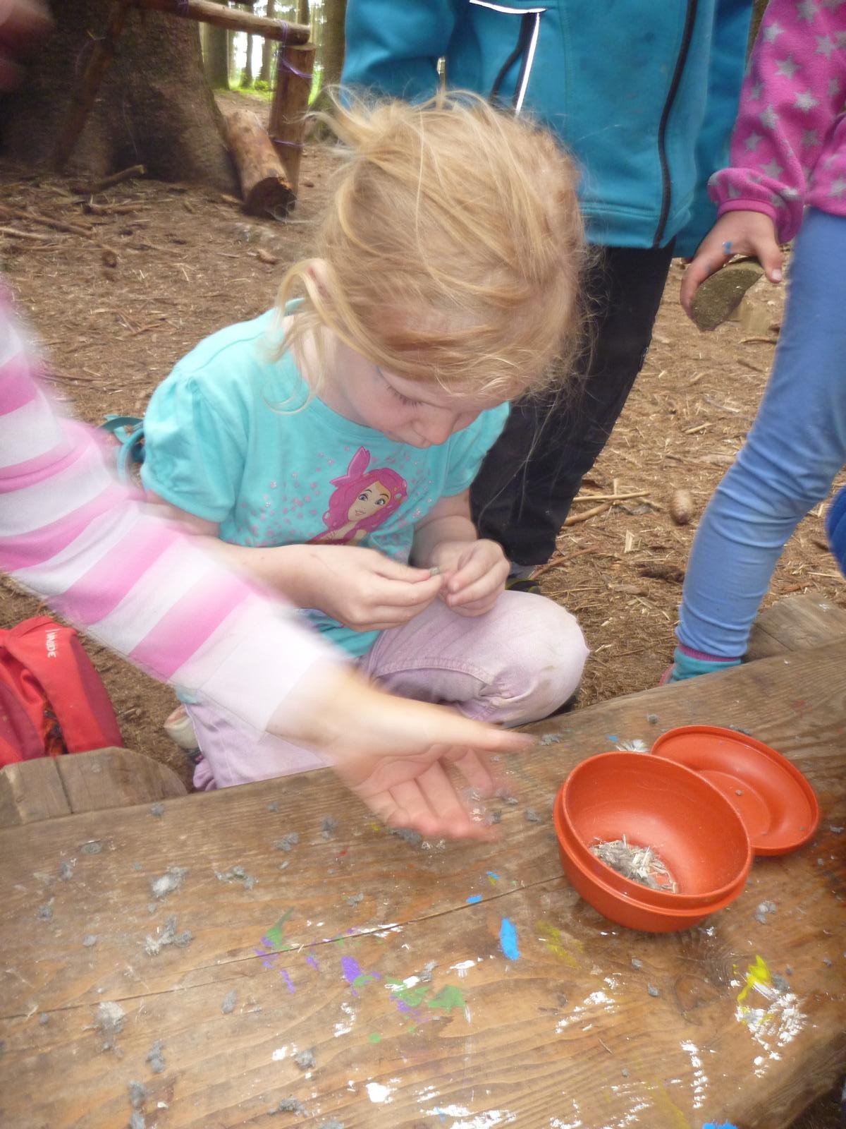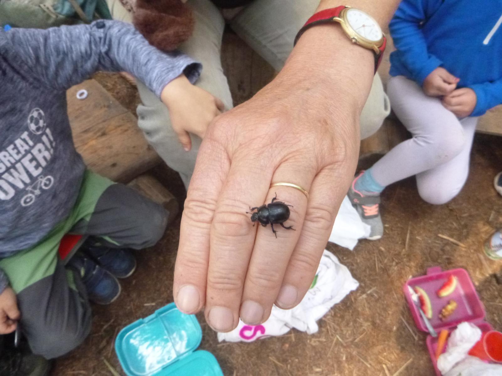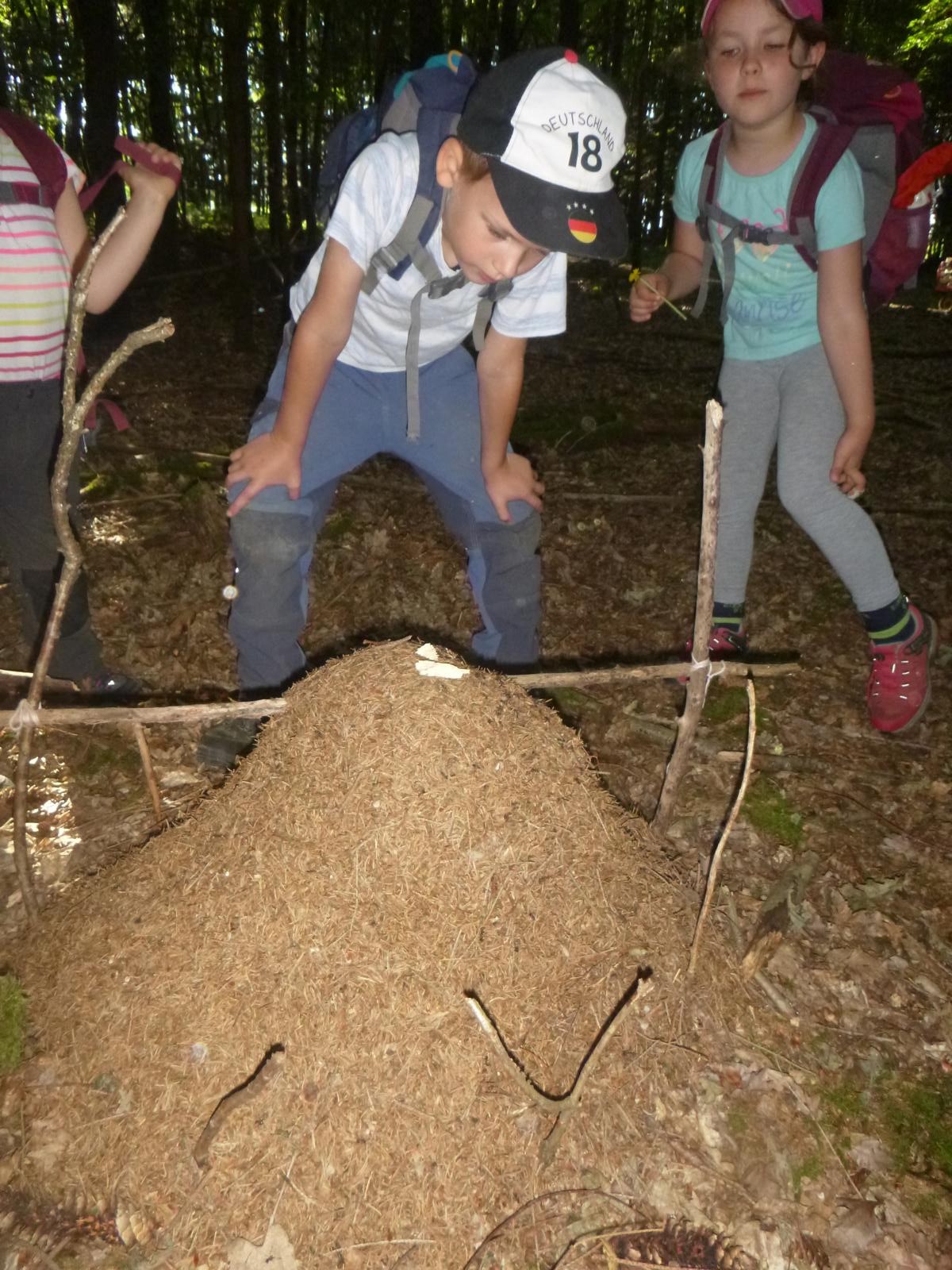 Umso spannender war es jedesmal, wenn eines der beschriebenen Tiere unsere Wege kreuzte und die Kinder die kleinen Waldbewohner ausgiebig beobachten und erforschen konnten. Beim täglichen Besuch am Ameisenhaufen konnten wir genau verfolgen, wie fleißig das Ameisenvolk täglich baute. Die eingebaute Messstange war schon nach wenigen Tagen erreicht worden. Gewölle vom Mäusebussard wurden zerlegt und die winzigen Knöchelchen der verspeisten Tiere untersucht. Immer wieder machten sich die Waldlauser auf Entdeckertour und stießen mit ihren guten Augen auf vielerlei Spuren: Eierschalen und Federn, Knöchelchen, verlassene Nester, Schneckenhäuser, Fraßspuren an Blättern und Zapfen, Puppen von Schmetterlingen und vieles mehr. Sie beobachteten den blau schillernden Mistkäfer bei seiner Arbeit und einmal konnten sie auch eine junge Ringelnatter bestaunen. Die gefundenen Schätze landeten auf dem Schatzbrett und die wunderschönen Eindrücke werden die Waldlauser wohl noch lange im Herzen bewahren.
