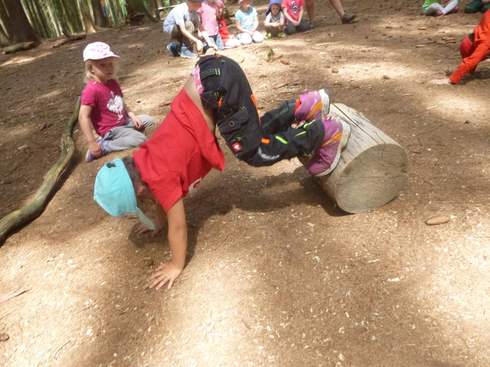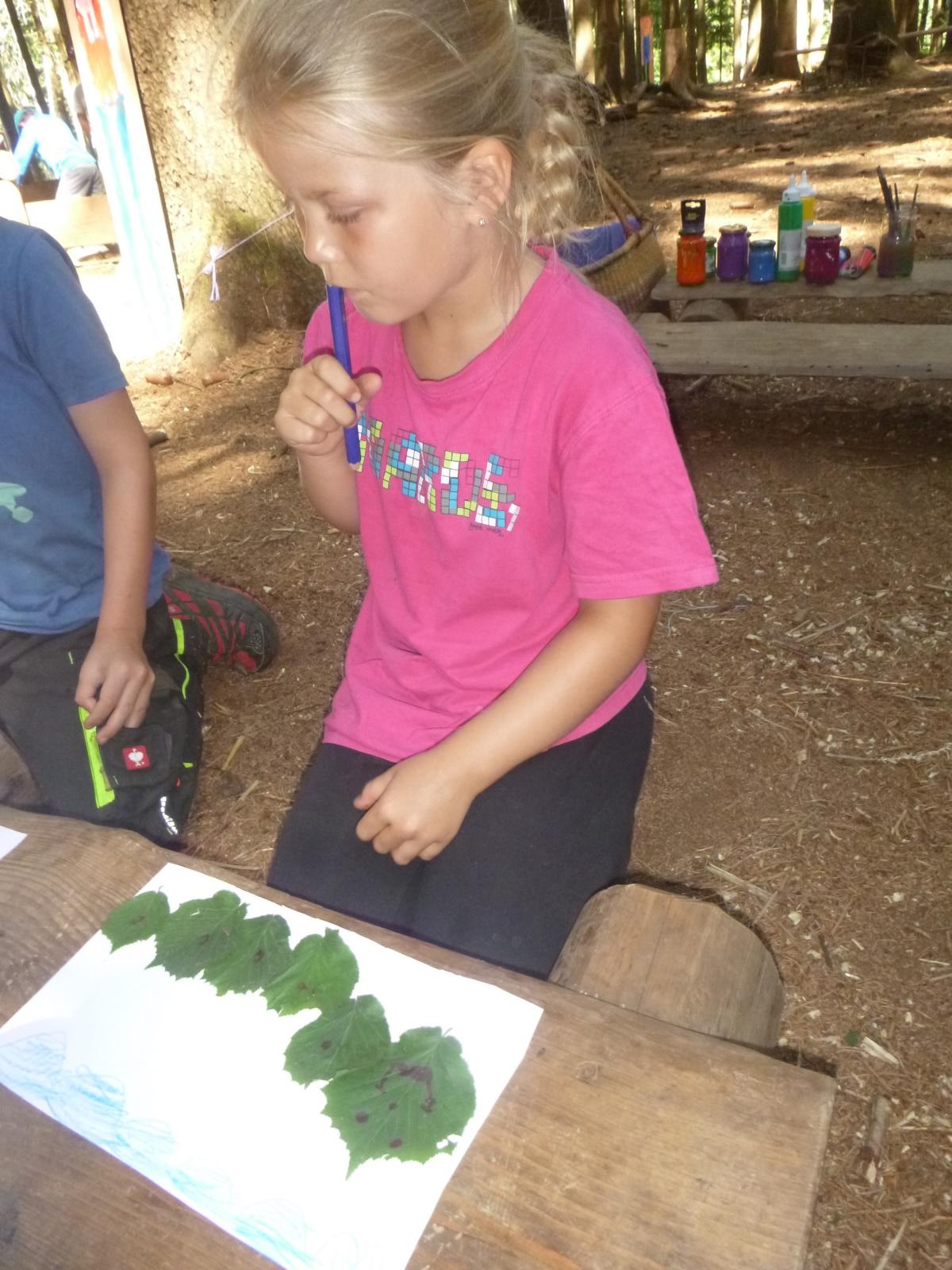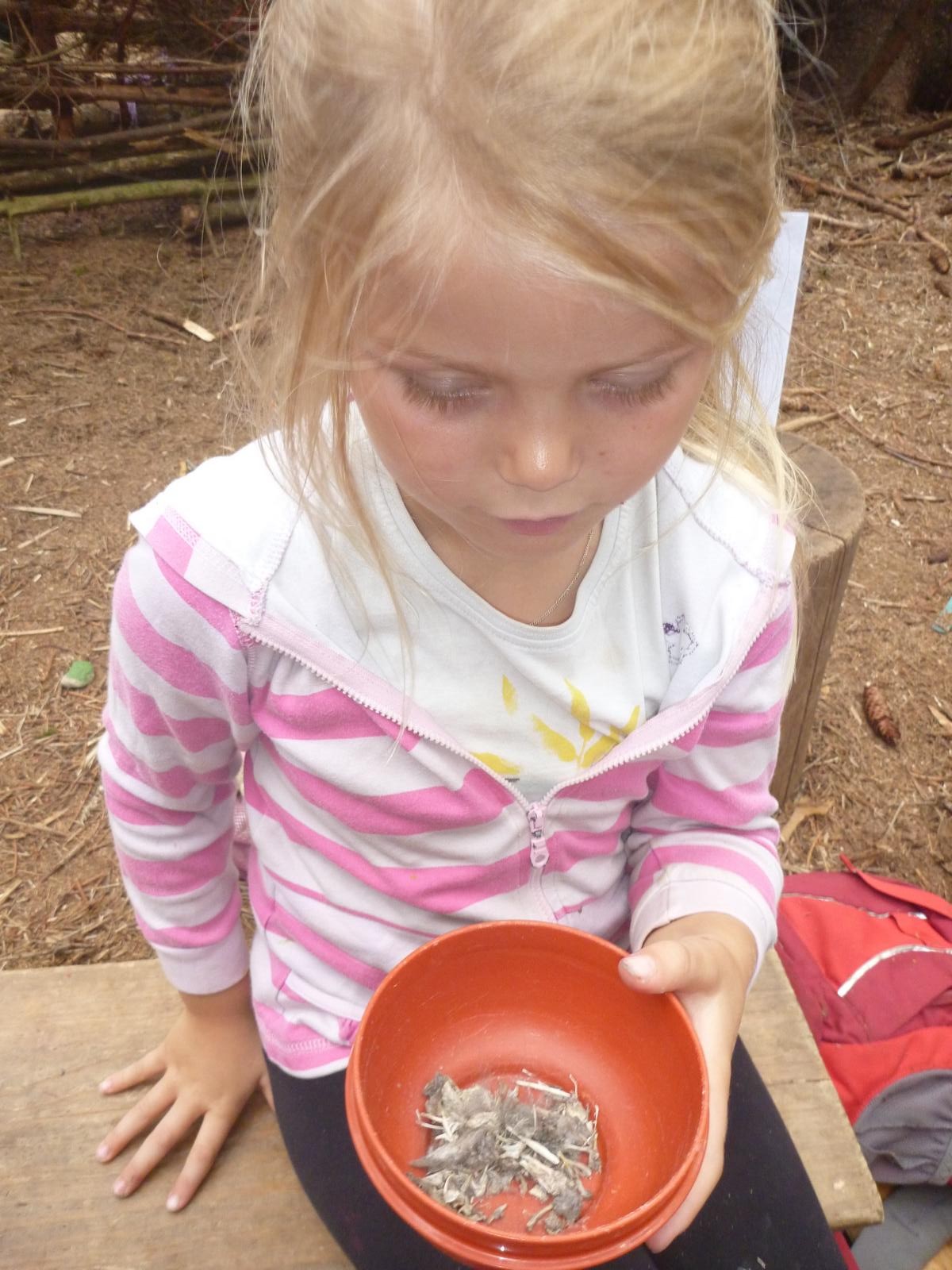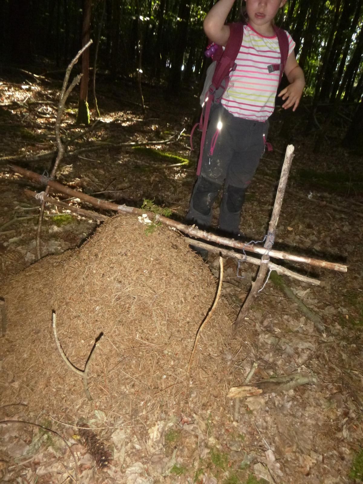 Umso spannender war es jedesmal, wenn eines der beschriebenen Tiere unsere Wege kreuzte und die Kinder die kleinen Waldbewohner ausgiebig beobachten und erforschen konnten. Beim täglichen Besuch am Ameisenhaufen konnten wir genau verfolgen, wie fleißig das Ameisenvolk täglich baute. Die eingebaute Messstange war schon nach wenigen Tagen erreicht worden. Gewölle vom Mäusebussard wurden zerlegt und die winzigen Knöchelchen der verspeisten Tiere untersucht. Immer wieder machten sich die Waldlauser auf Entdeckertour und stießen mit ihren guten Augen auf vielerlei Spuren: Eierschalen und Federn, Knöchelchen, verlassene Nester, Schneckenhäuser, Fraßspuren an Blättern und Zapfen, Puppen von Schmetterlingen und vieles mehr. Sie beobachteten den blau schillernden Mistkäfer bei seiner Arbeit und einmal konnten sie auch eine junge Ringelnatter bestaunen. Die gefundenen Schätze landeten auf dem Schatzbrett und die wunderschönen Eindrücke werden die Waldlauser wohl noch lange im Herzen bewahren.