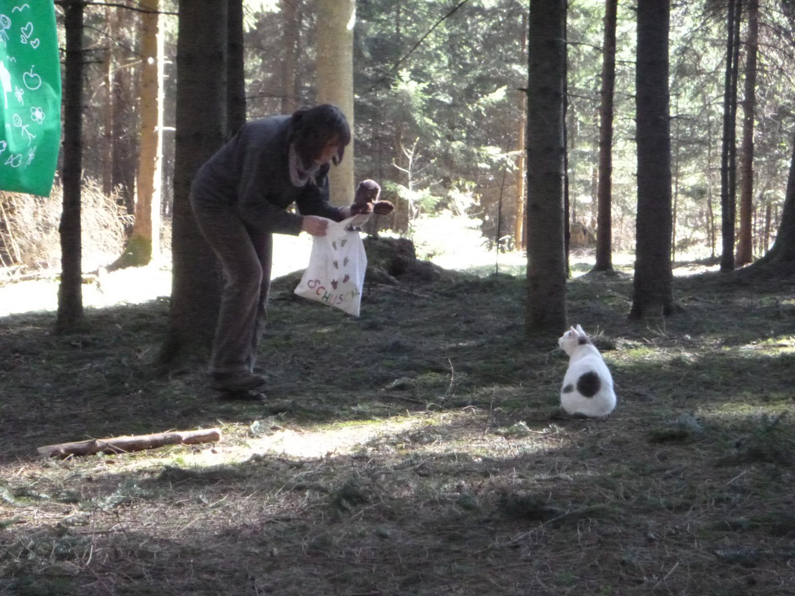 Seit ein paar Wochen begleitet uns der Kater Pinsel jeden Vormittag getreulich in den Wald. Mal läuft er vorne weg, mal folgt er uns und lässt sich auch von Regentagen nicht abschrecken. Er lauscht schnurrend den Geschichten während der Brotzeit, wetzt seine Krallen an den Bäumen und lässt sich auf weichen Mooskissen zum kurzen Schläfchen nieder. Punkt 12 Uhr steht er wieder bereit und begleitet uns hocherhobenen Schwanzes wieder nach Hause.