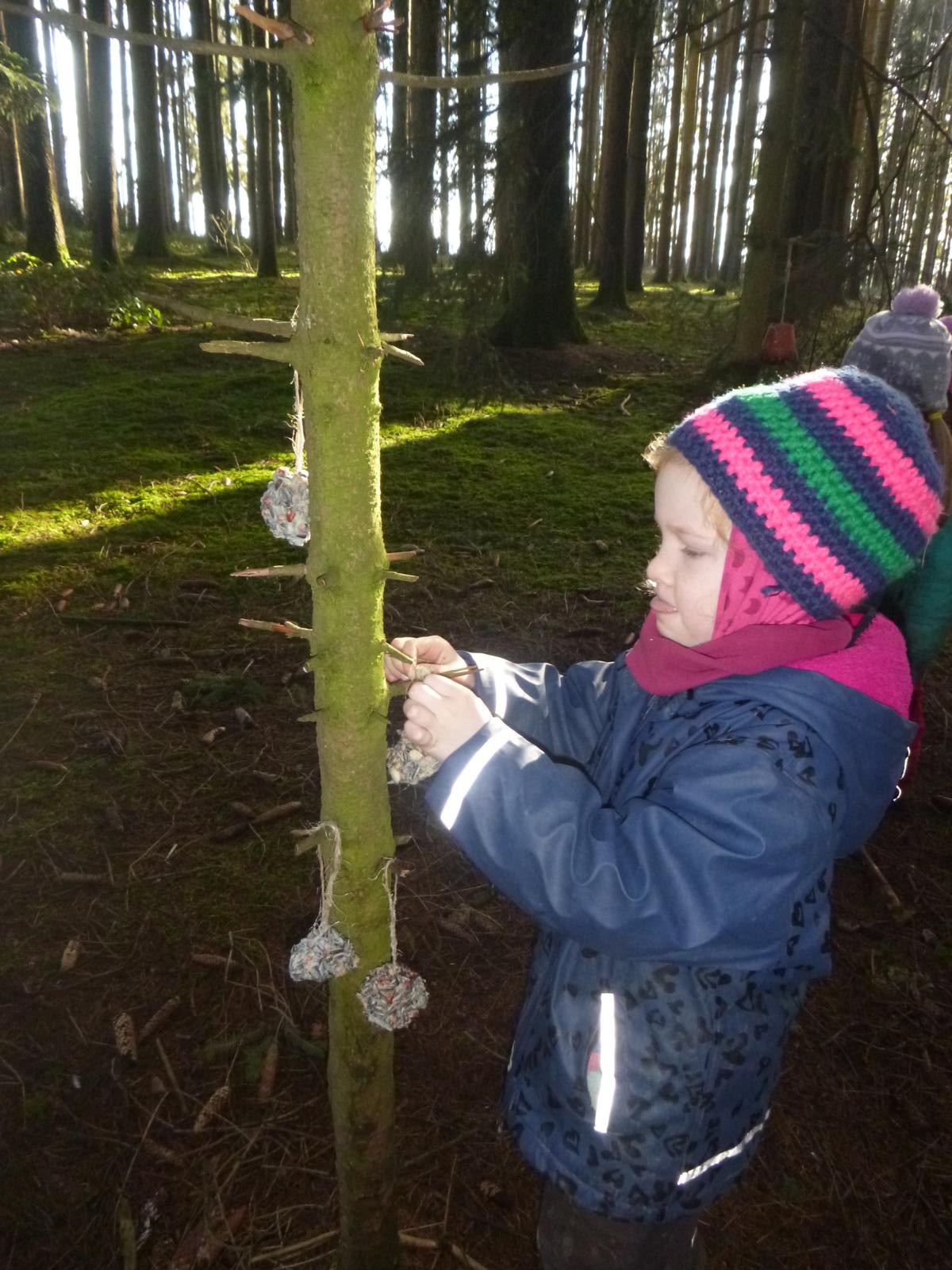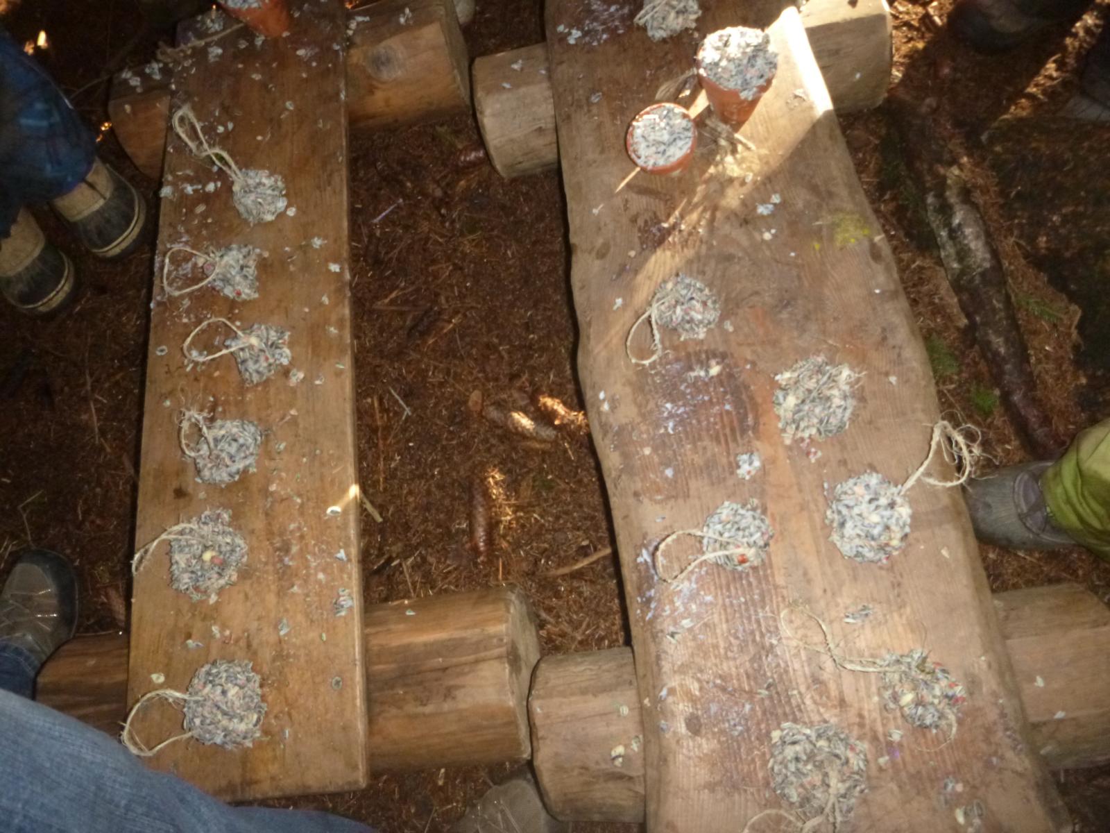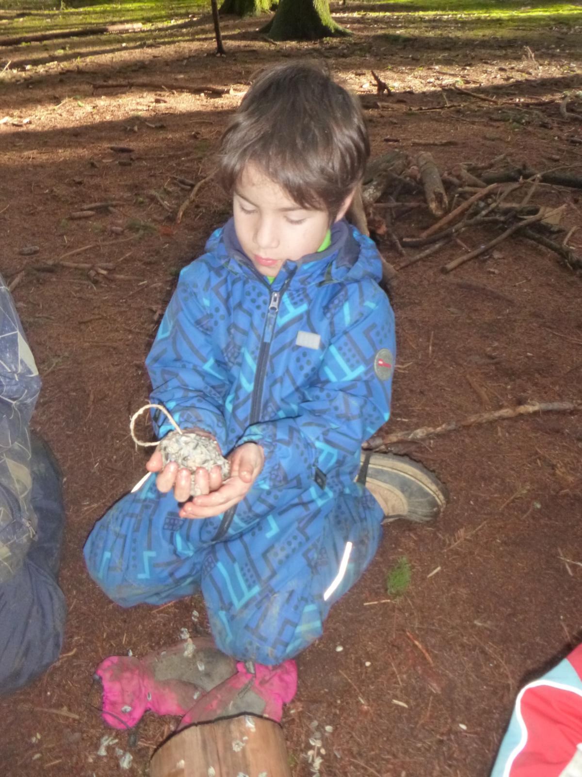 Und so schmelzen die Kinder Fett und mischen unter die erkaltete Masse verschiedene Körner und Samen. Daraus werden Kugeln geformt, mit Aufhängern versehen und schließlich werden die festgewordenen Futterkugeln aufgehängt. So nebenbei erfahren die Waldlauser noch einiges über unsere heimischen Standvögel, die auch im Winter bei uns bleiben. Und wer ganz leise ist, kann die Vögel schon bald beim Naschen beobachten.