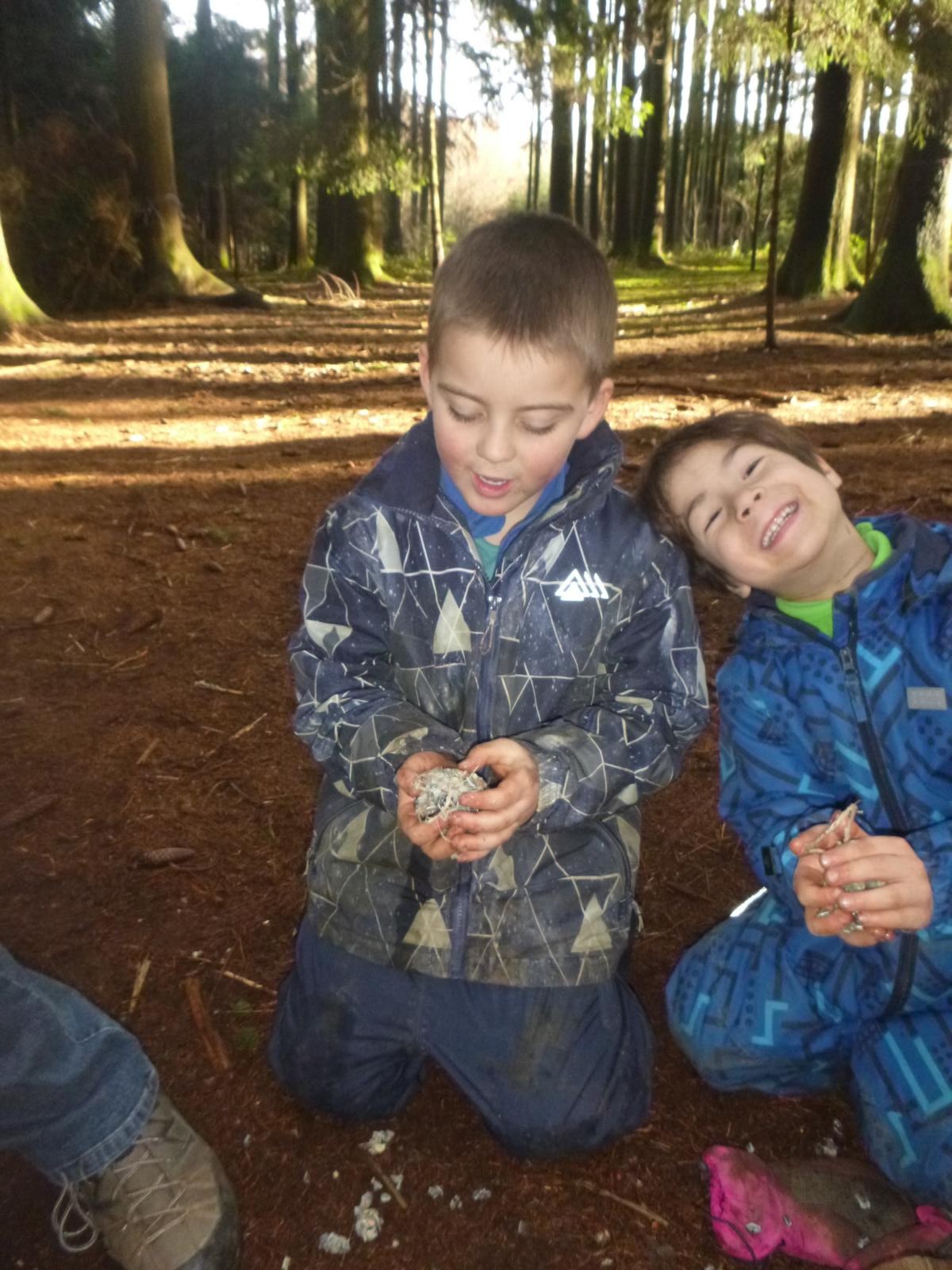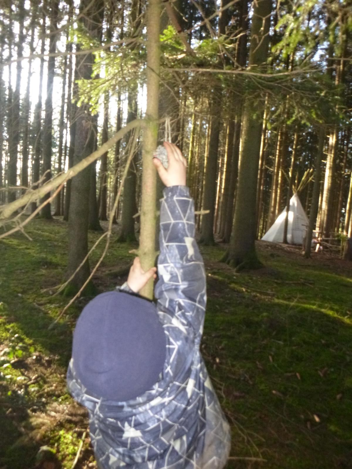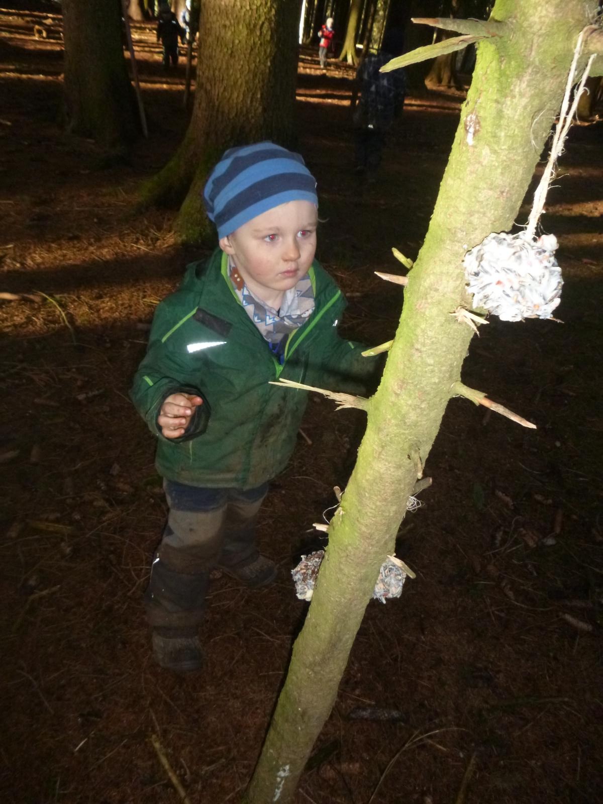 Und so schmelzen die Kinder Fett und mischen unter die erkaltete Masse verschiedene Körner und Samen. Daraus werden Kugeln geformt, mit Aufhängern versehen und schließlich werden die festgewordenen Futterkugeln aufgehängt. So nebenbei erfahren die Waldlauser noch einiges über unsere heimischen Standvögel, die auch im Winter bei uns bleiben. Und wer ganz leise ist, kann die Vögel schon bald beim Naschen beobachten.