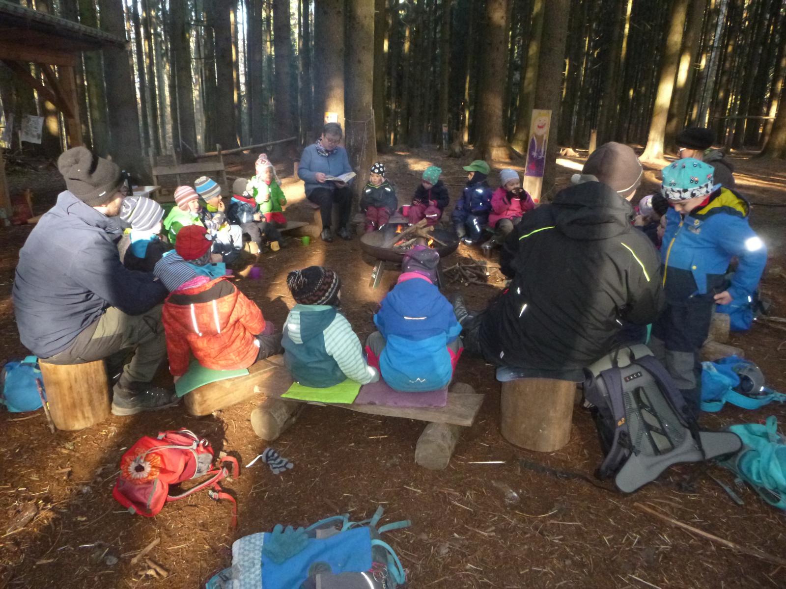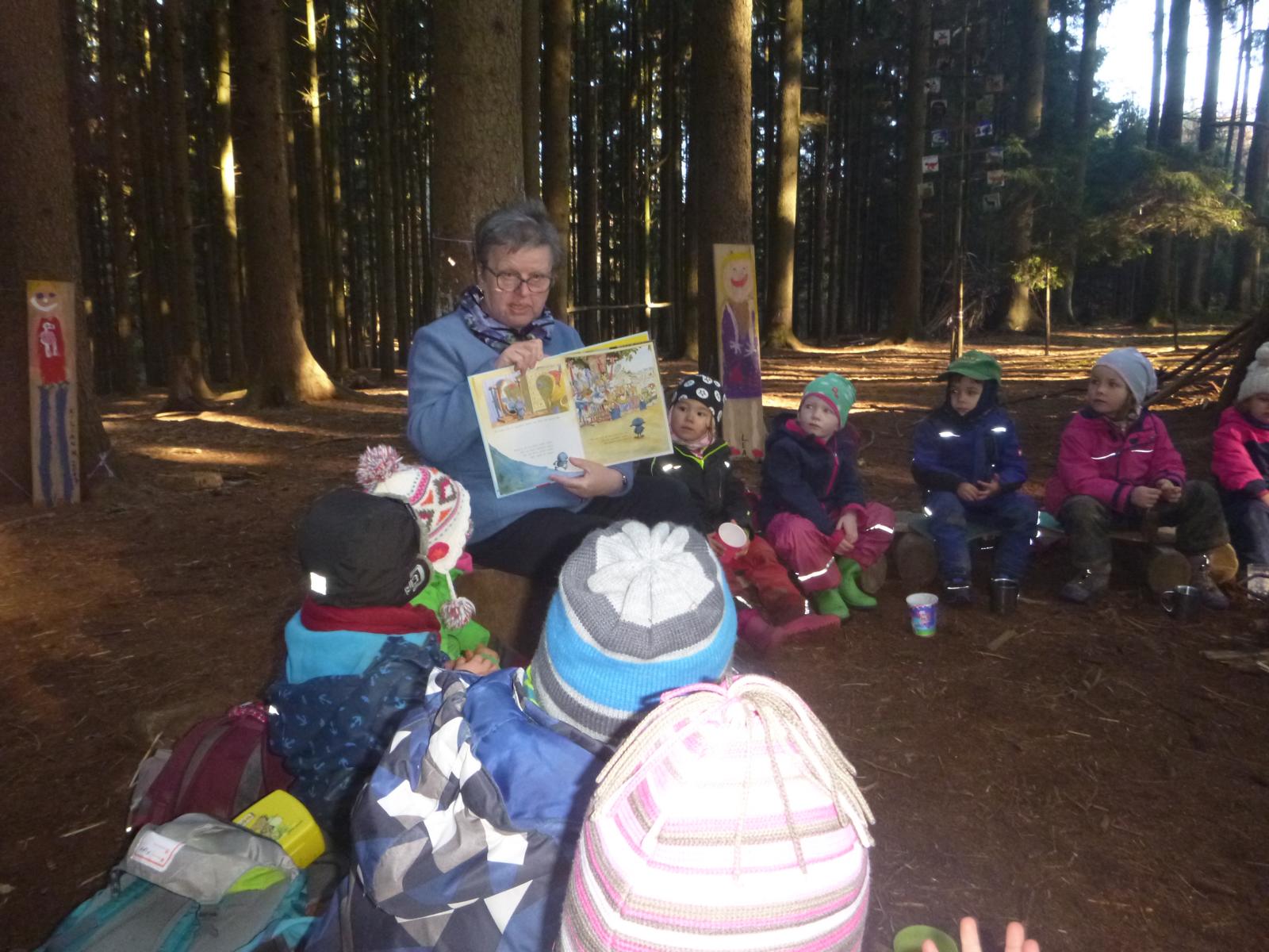 Geschichten und Märchen, frei erzählt oder vorgelesen, sind ebenso wie Bilderbücher ein fester Bestandteil im täglichen Waldkindergartenablauf. Die Kinder tauchen in die erzählten Phantasiewelten ein, fiebern mit den Märchenfiguren mit und setzen vieles davon im Freispiel um.