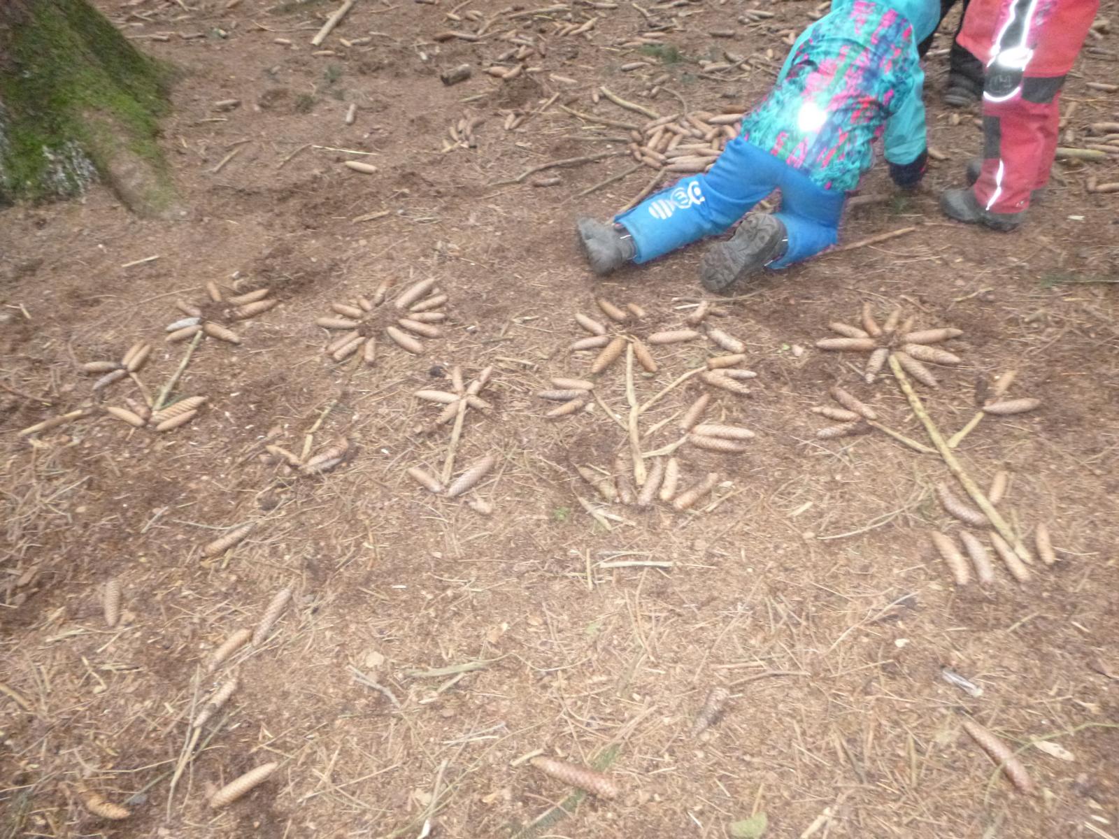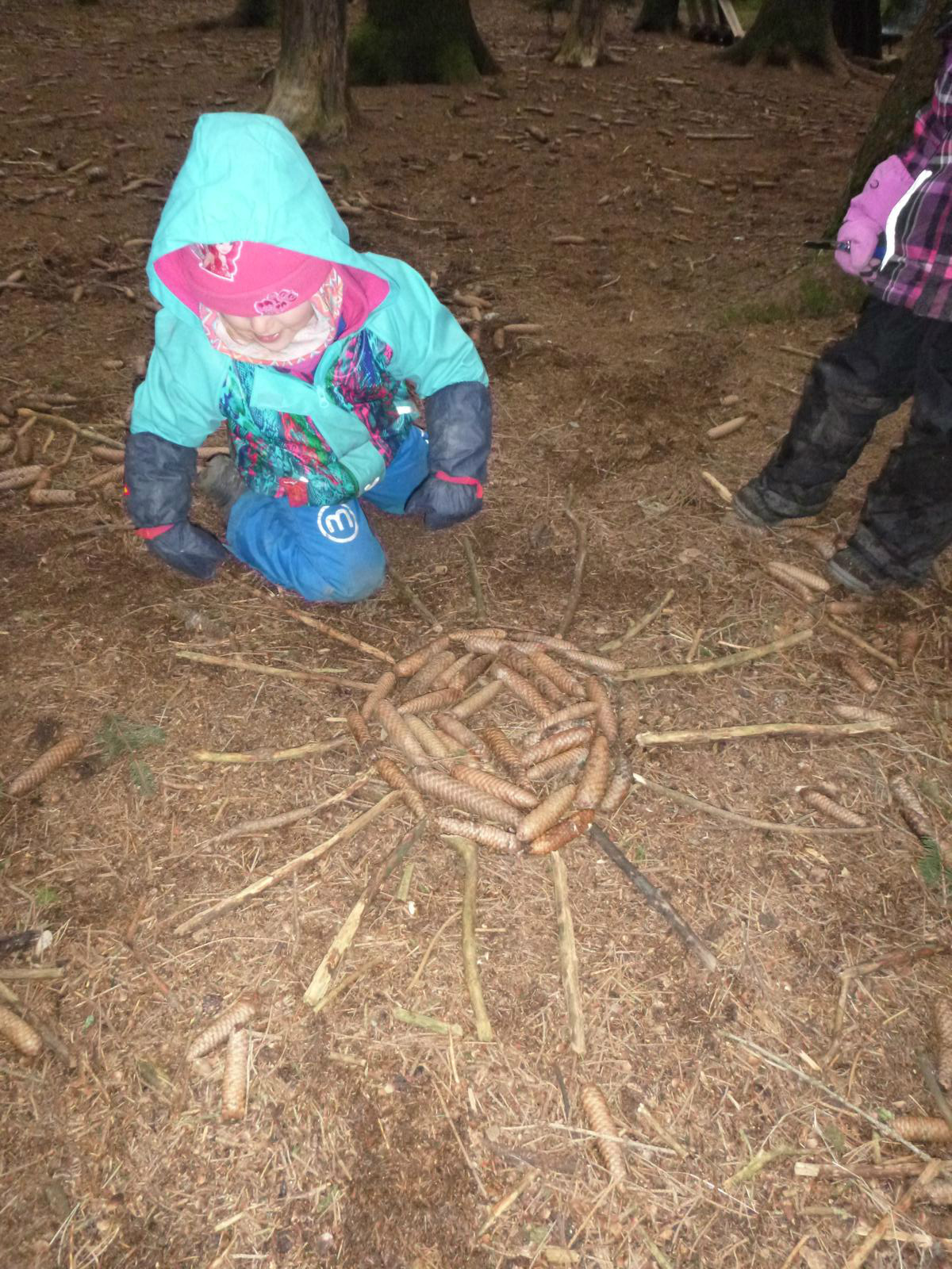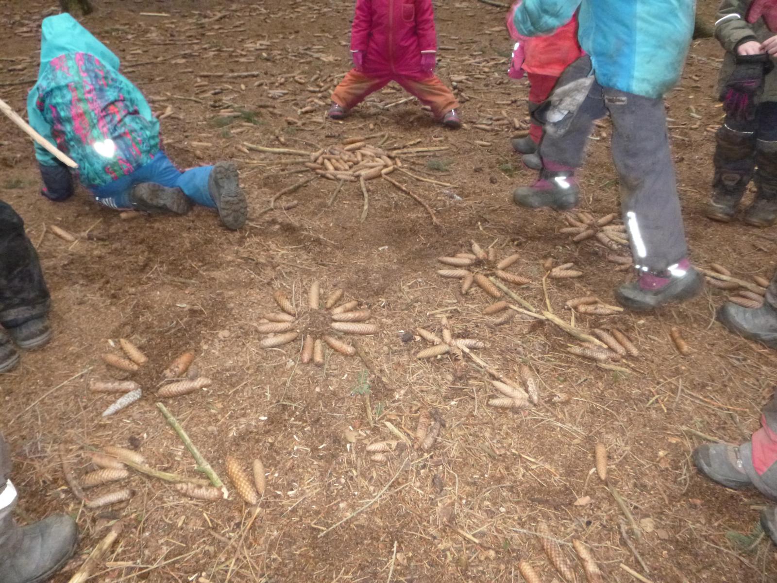 In diesem Jahr haben uns die Fichten mit unzähligen Zapfen beschenkt. Sie kommen im Spiel der Kinder in vielfältigster Weise zum Einsatz. Hier werden sie als Kühe und Pferde in den kleinen Stöckchenstall getrieben, dort liegen sie als Karotten im Kaufladen, werden als Zahlungsmittel verwendet, geschnitzt, abgeraspelt, als Fußbodenbelag genutzt, hängen als Fisch an der Angel oder werden gekonnt ins Ziel geworfen.  In trockenem Zustand aneinandergerieben, ertönt rhythmische Musik und für die kleinen Künstler dienen sie als willkommenes Gestaltungsmaterial.