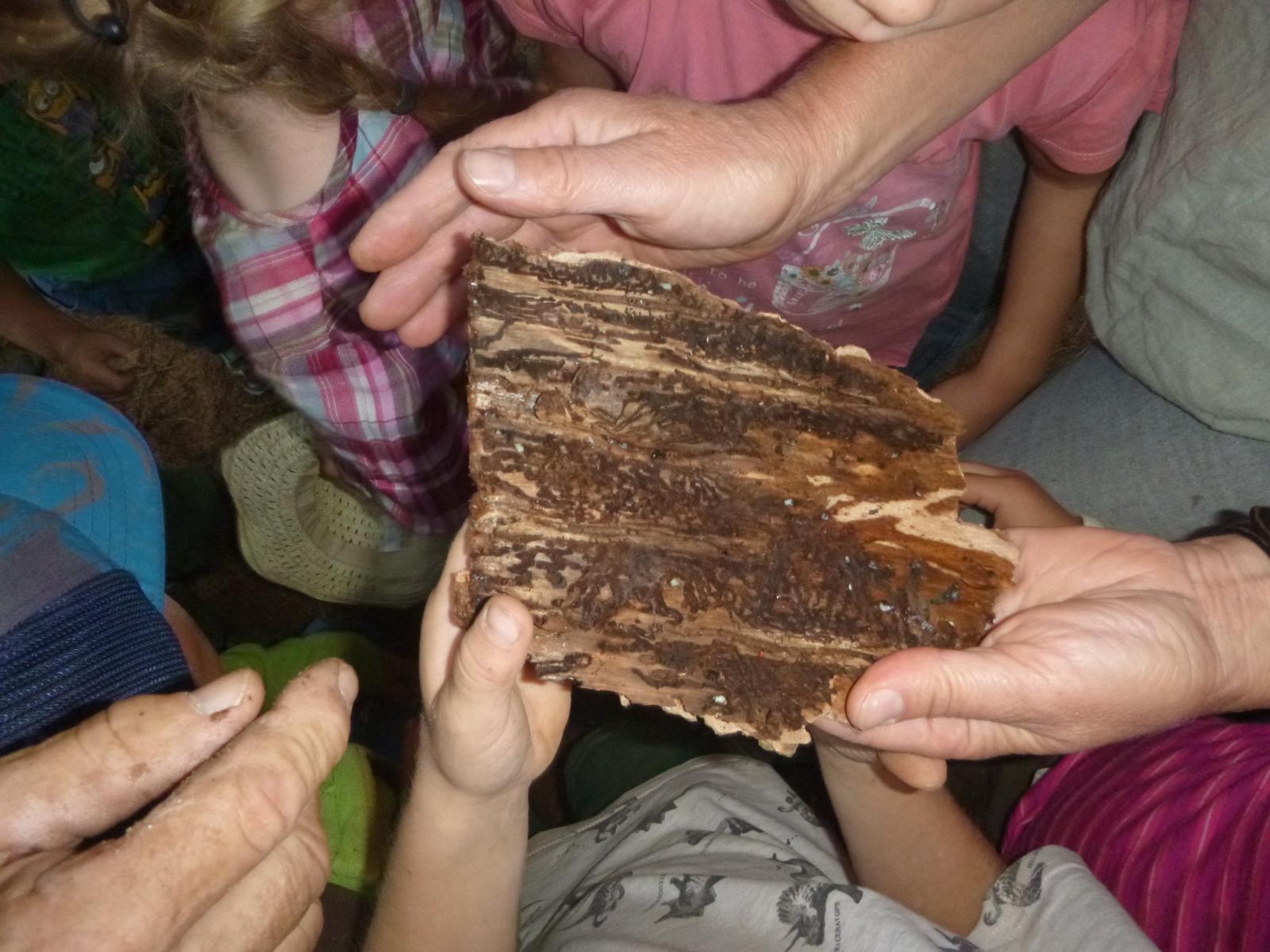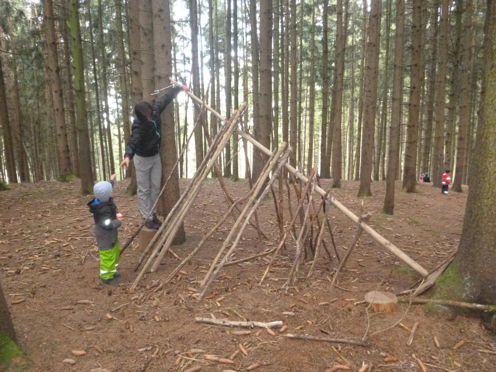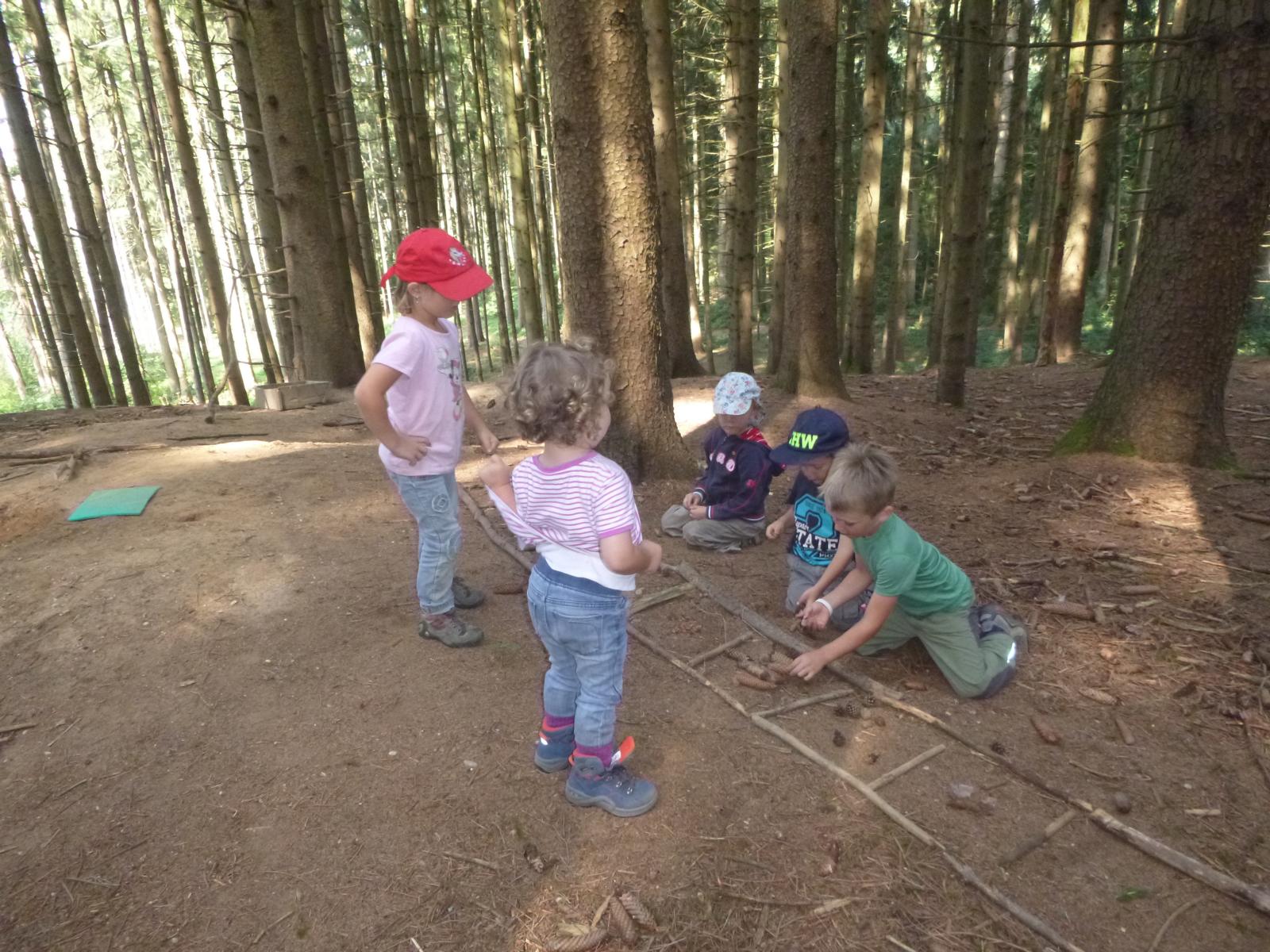 „Ich möchte bitte ein Pfund Brot, drei Kartoffeln und eine Tafel Schokolade“. Die Verkäuferin eilt, das Gewünschte zu holen, kassiert und sucht das passende Wechselgeld. „Der Nächste bitte!“ Im neu eröffneten Waldkaufladen ist gerade viel los und die Lieferanten haben alle Hände voll zu tun, damit dem Kaufmann die Ware nicht ausgeht. Feine Erde wird als Mehl angeliefert, Moossalat und Zapfenwiener werden gebraucht und Kiefernnadelnspagetti dürfen natürlich auch nicht fehlen. Das Angebot ist umfangreich, hier gibt es für alle Wünsche etwas. Aus ein paar Ästen und Stöcken ist die Auslage schnell gebaut, mit den unterschiedlichsten Waldmaterialien befüllt und die Phantasie der Kinder tut ihr Übriges dazu. Nach einer Weile lässt der Andrang nach, der Laden muss mal schnell Mittagspause machen und die Einkäufer bringen ihre Waren nach Hause. Dort warten die Hüttenbauer, das Baby und die Oma ja schon auf’s Mittagessen…..