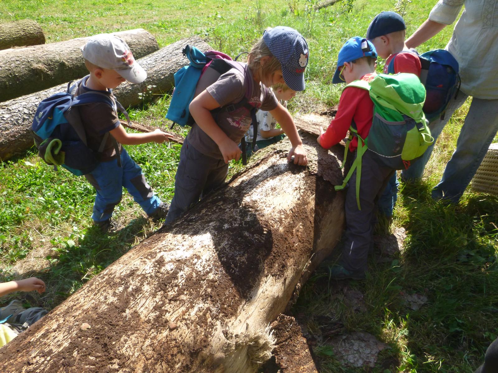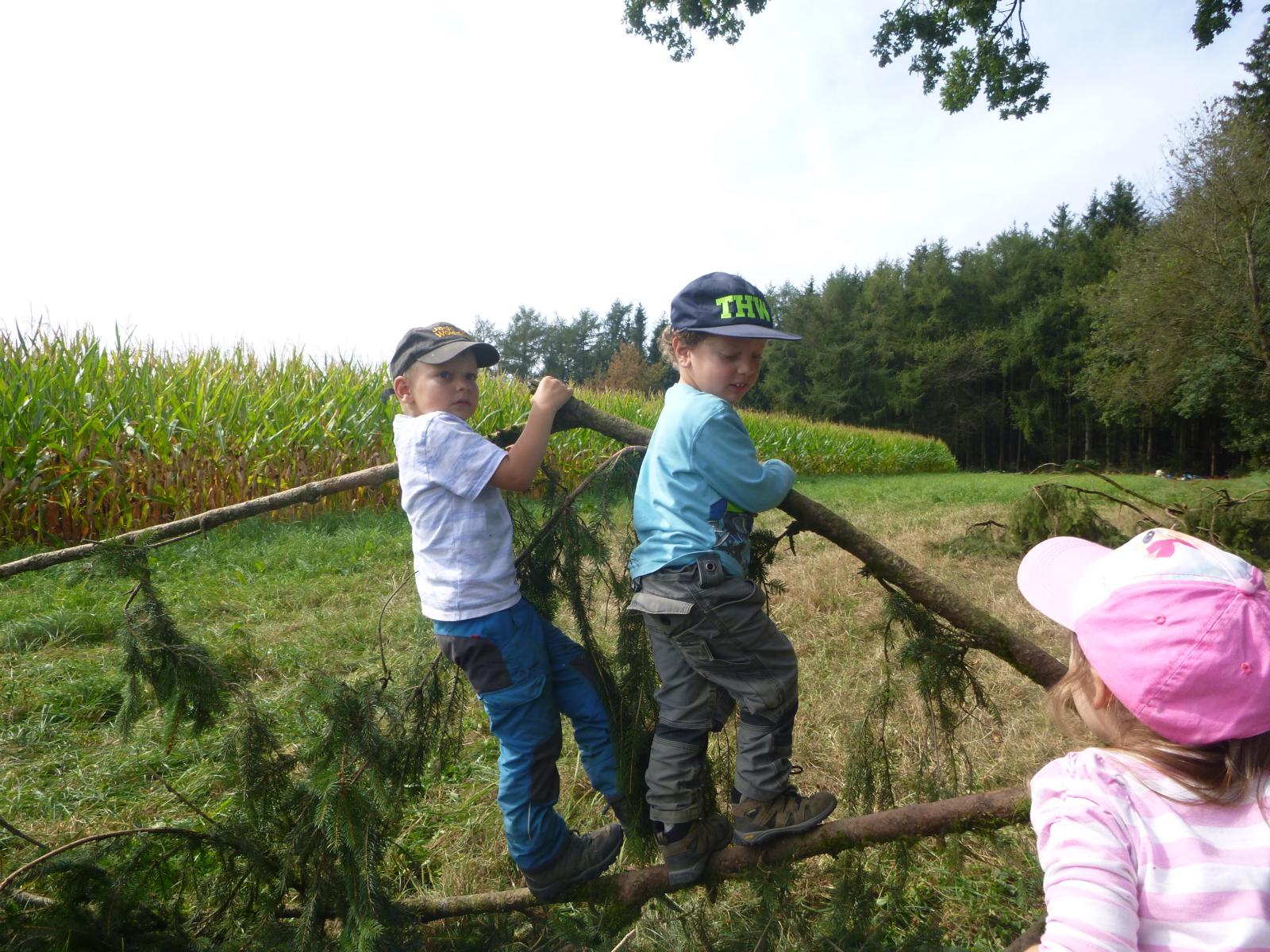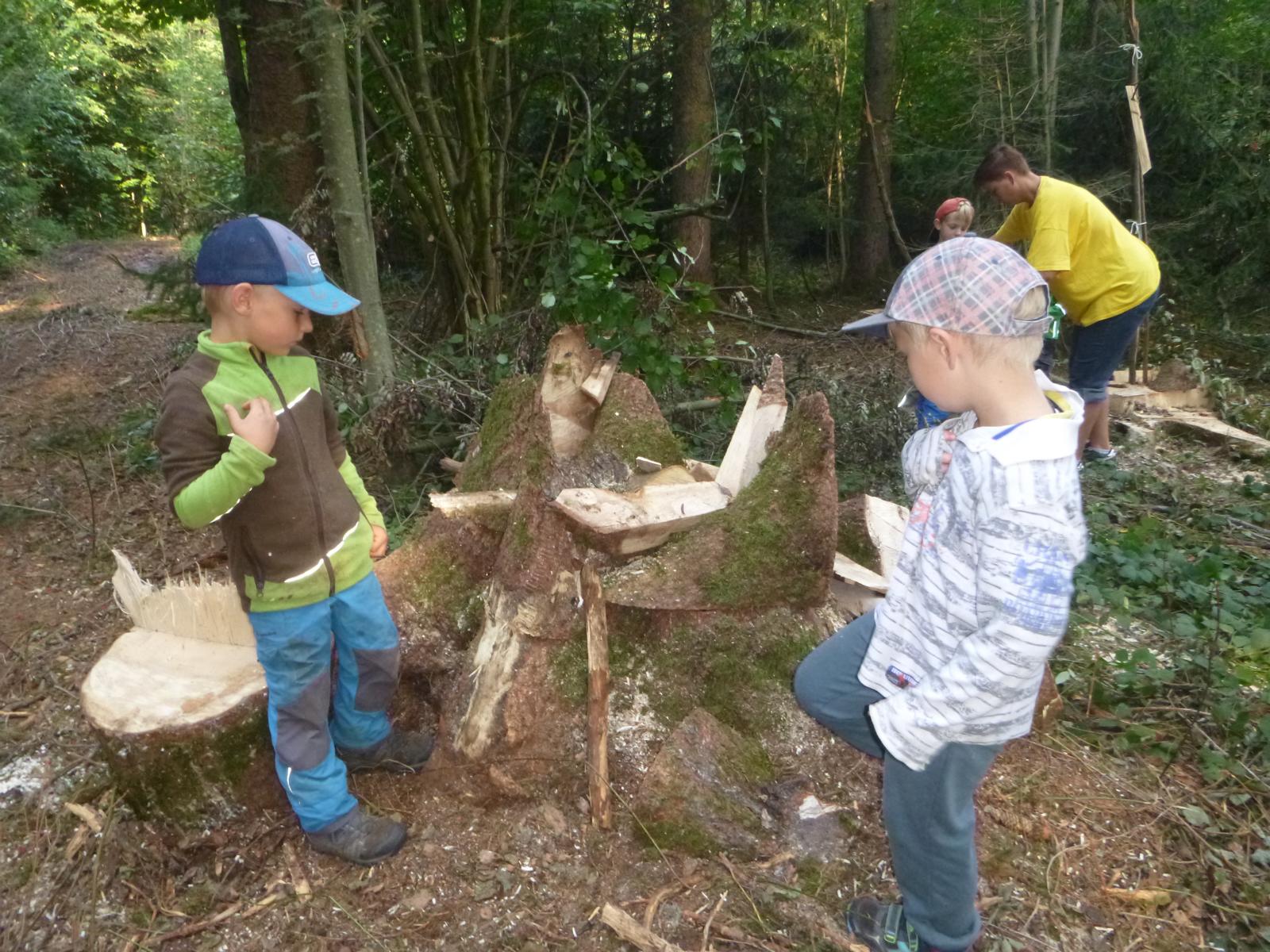 Gefällte Bäume – auch hier treibt der Borkenkäfer sein Unwesen – bieten einen spannenden Spielplatz für ein paar Tage und die liegengebliebenen Holzkeile, das Sägemehl und die Baumstümpfe bieten schon wieder Raum für unzählige neue Spielideen. Langweilig wird es den Altfraunhofener Waldlausern nicht.