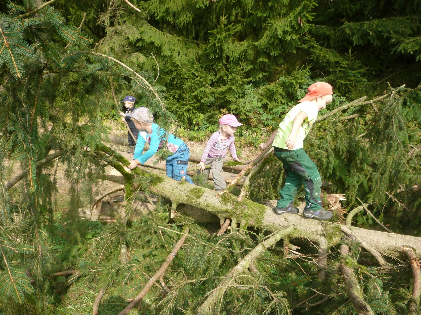 Jeden Tag bietet das schöne Lausbacher Holz altbekannte und neue Spielmöglichkeiten. Im „Waldsandkasten“ werden Höhlen gegraben oder Kuchen gebacken und Wurzelstöcke laden zum Klettern und Erkunden ein. Waren sie gestern noch ein Feuerwehrauto, so sind sie heute der Zahnarztstuhl oder ein Wikingerschiff.