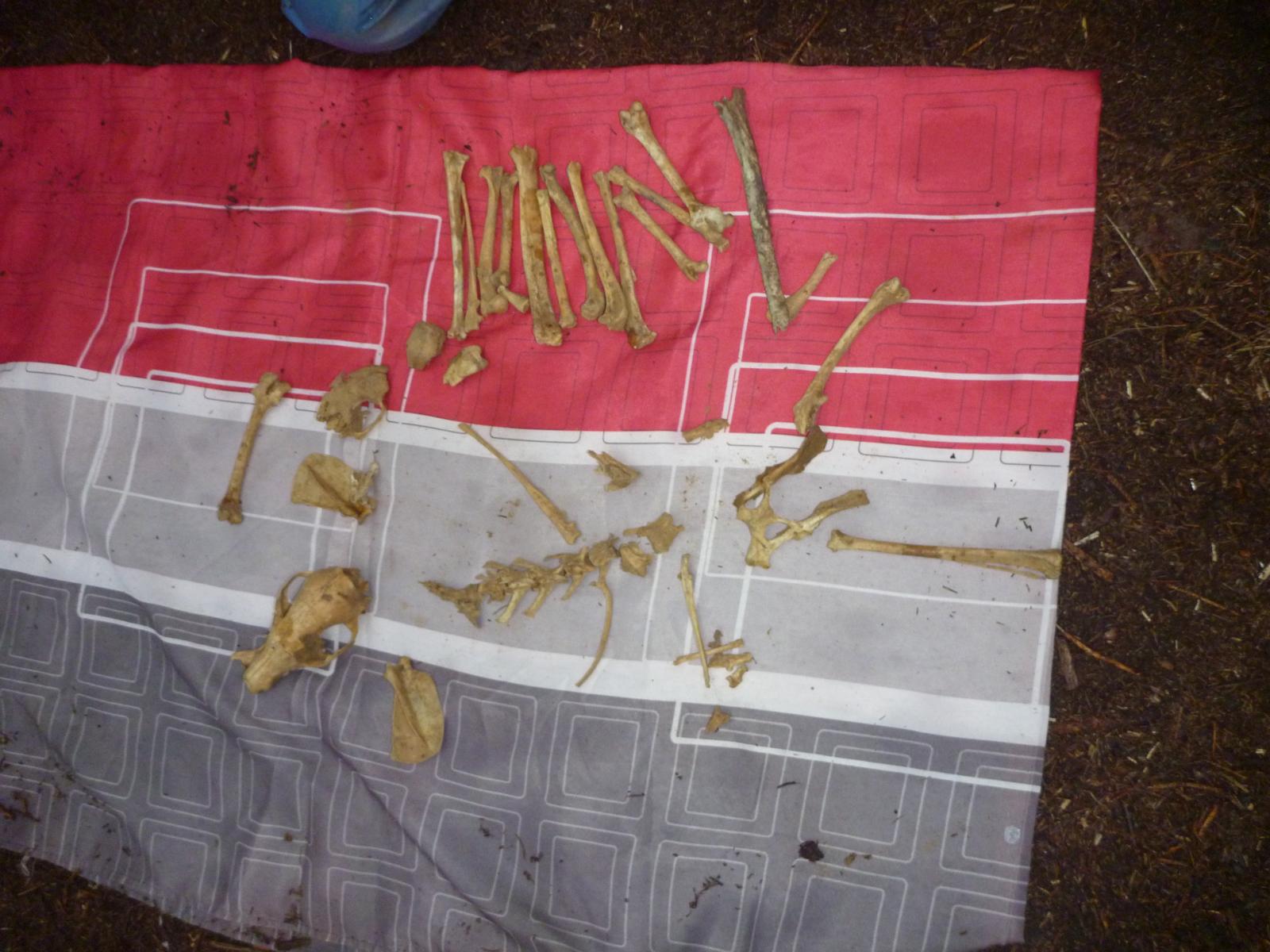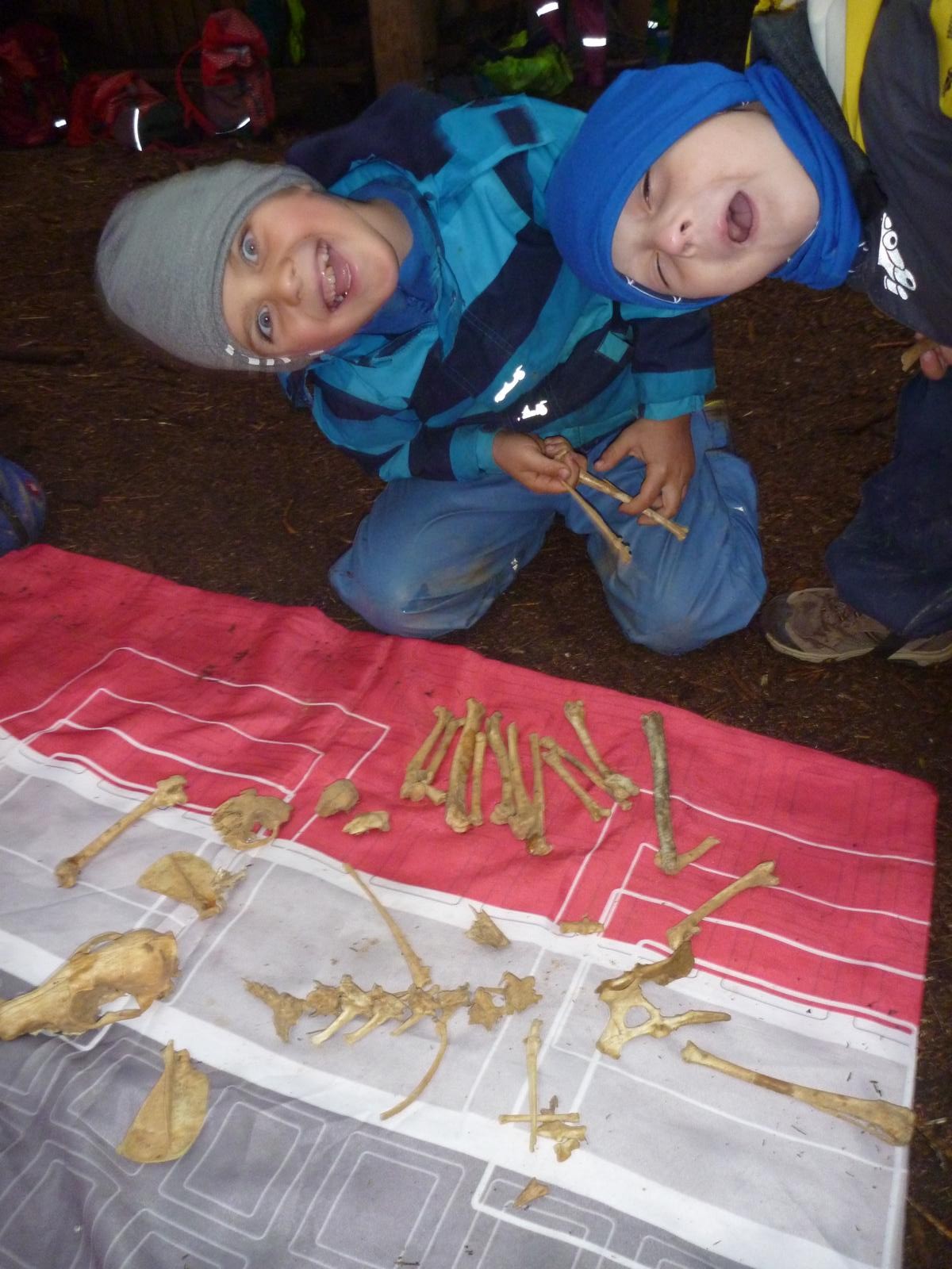 Mit großem Eifer wurden all die großen und kleinen, dicken und dünnen Knöchelchen eingesammelt, betrachtet und verglichen. Da kamen Schulterblätter, Wirbelsäulenelemente, Kieferknochen mit Zähnen und vieles andere zum Vorschein. Die Waldlauser überlegten jeweils, ob sie auch über solche Knochen verfügen und schließlich setzten wir aus den Fundstücken ein Skelett zusammen. Was für ein Tier es wohl einmal gewesen war?
