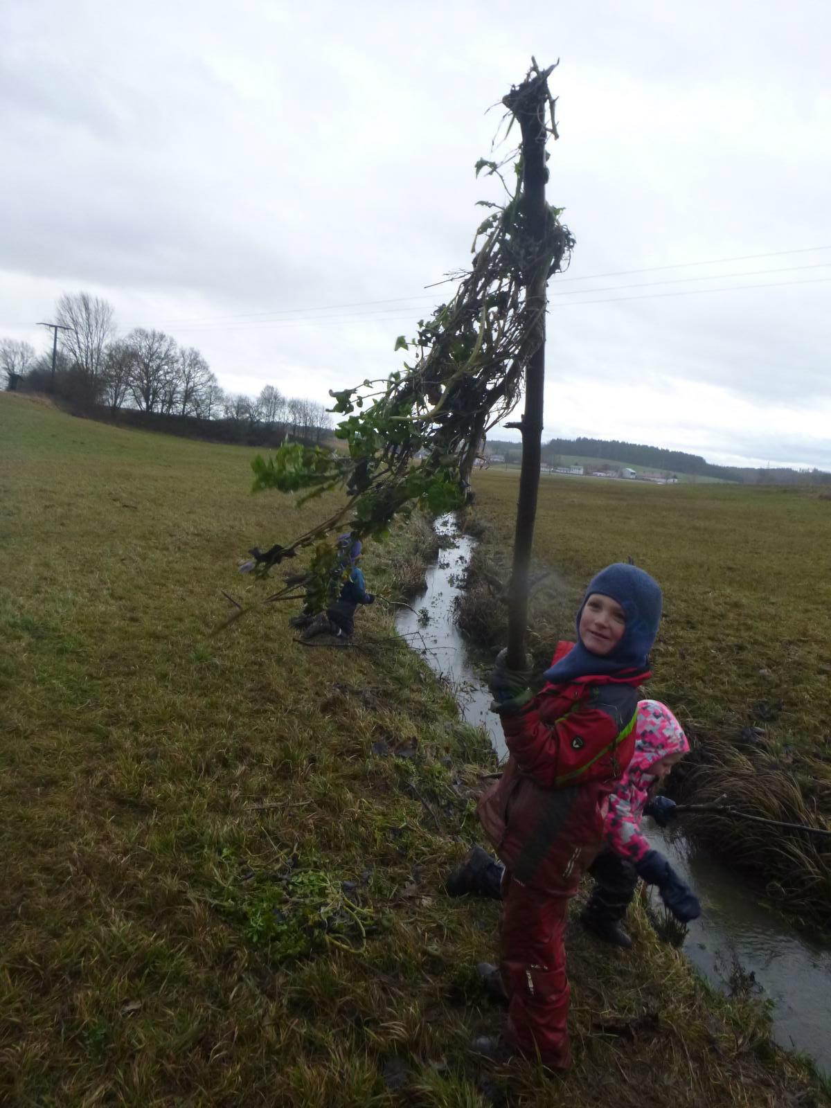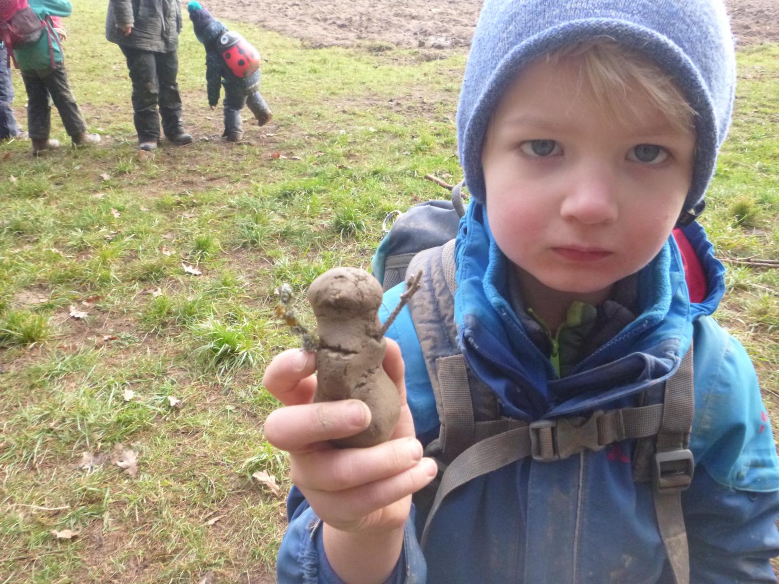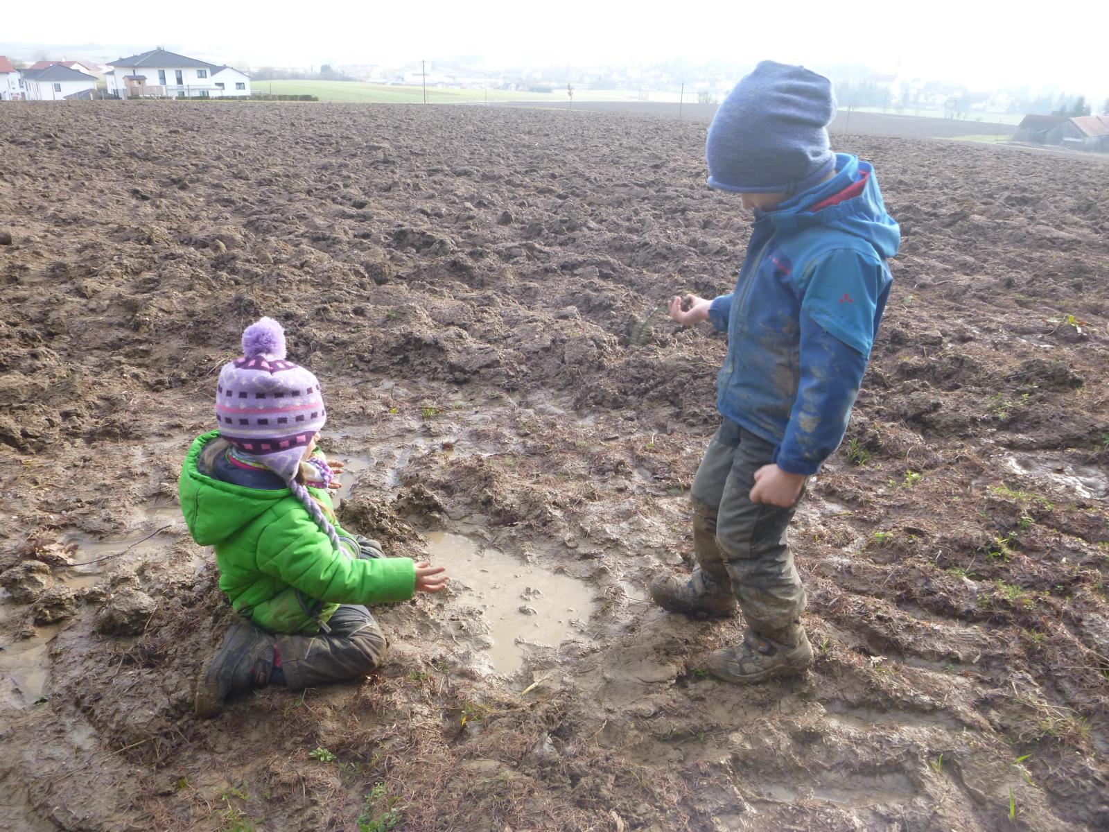 Ein naher, brachliegender Acker zieht uns in den letzten Wochen magisch an, statt Schneekugeln werden hier Lehmknödel geformt, Erdhügel erkundet, Pfützeneis untersucht und geborgen, mancher vorwitzige Regenwurm schon entdeckt, Probebohrungen mit diversen Bohrgeräten durchgeführt, Kugelbahnen gebaut und vieles andere mehr.