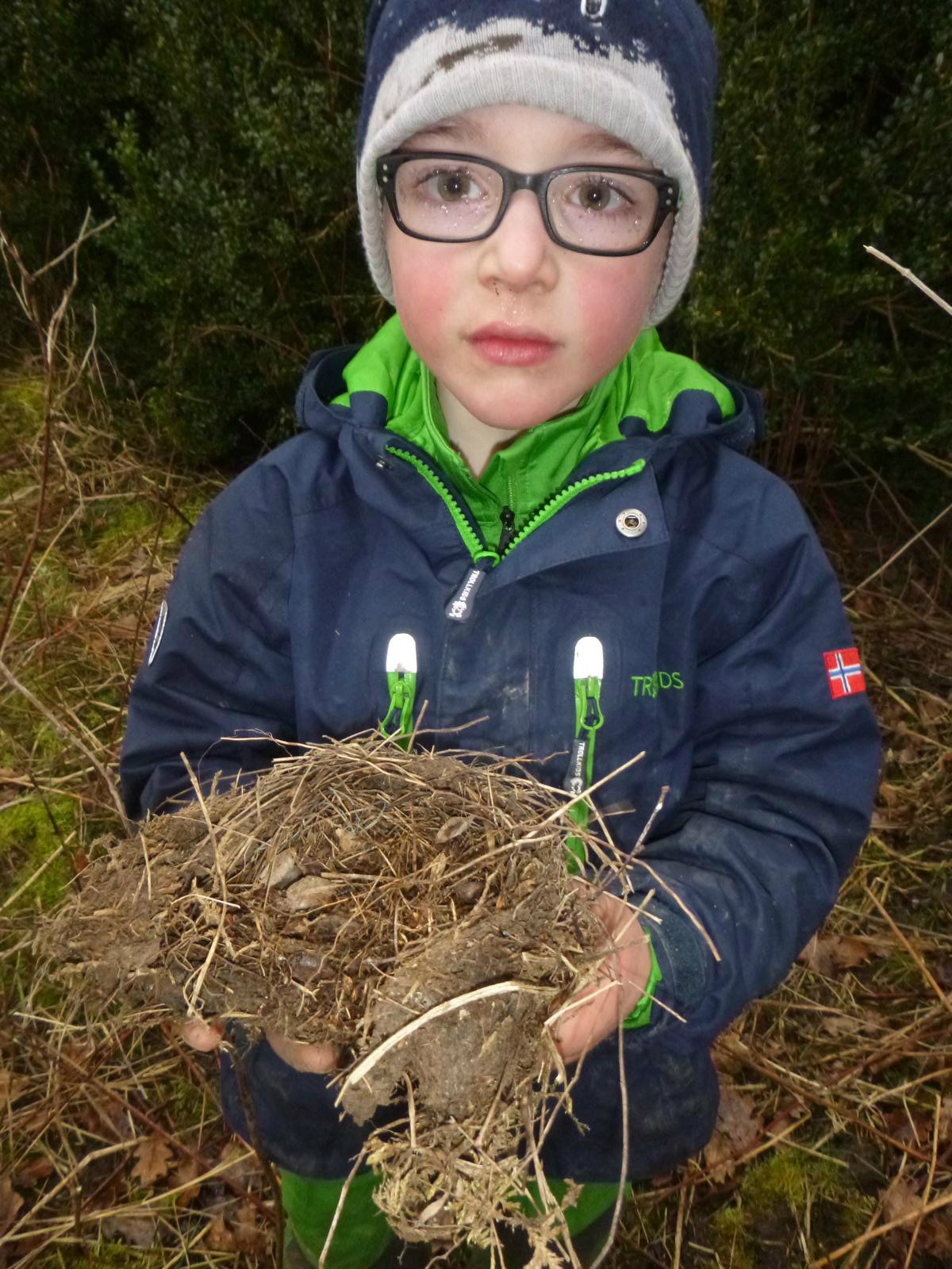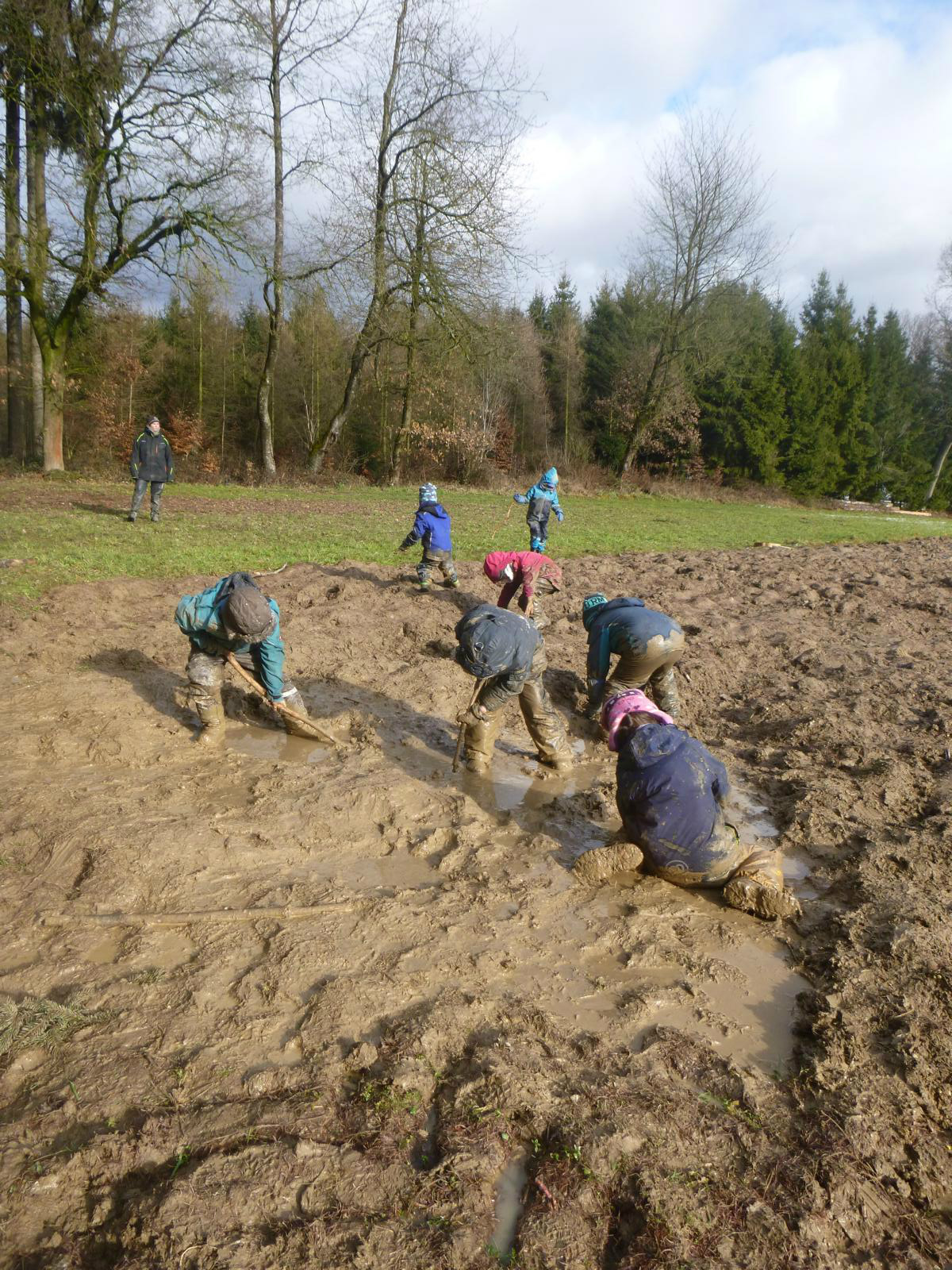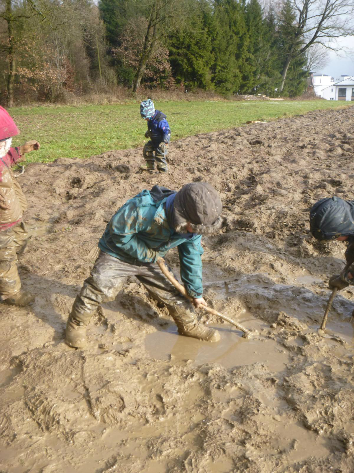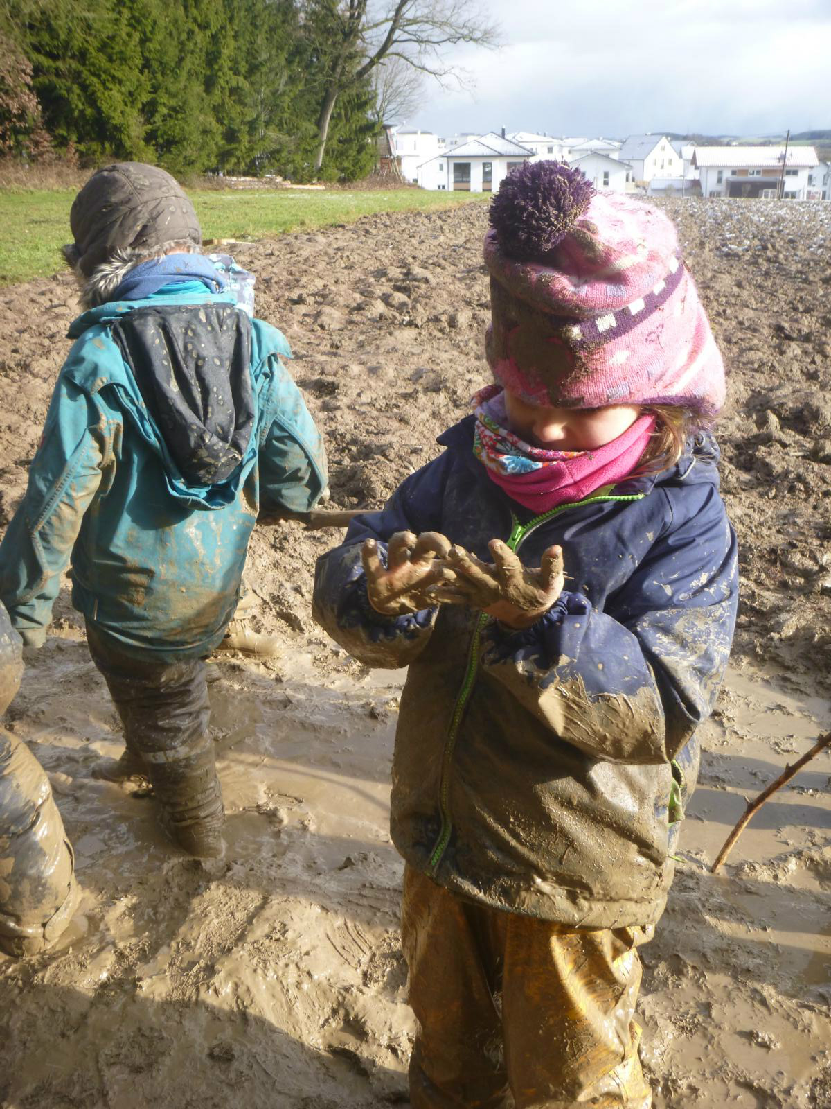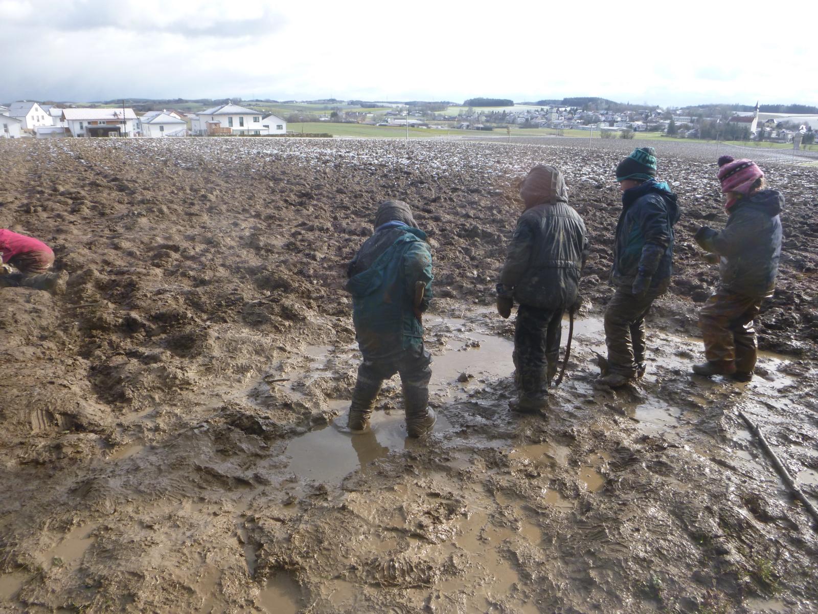 Dieses intensive Arbeiten und Erleben hinterlässt natürlich seine Spuren. An manchen Tagen sind die Kinder kaum vom Acker zu unterscheiden und die Regnhosen und Gummistiefel in ein einheitliches Matschbraun getaucht. Drum geht es vor dem Heimweg noch mal in die „Waschanlage“: die Kinder rollen sich einige Male durchs Gras und schon ist der gröbste Baatz weg und der Rest fällt auf dem Heimweg auch noch ab. Und so können die Kinder den Eltern wieder einigermaßen „sauber“ übergeben werden. Das Spielen im Schnee ist in dieser Hinsicht eindeutig elternfreundlicher…..! Aber wer weiß, was uns das Wetter in den nächsten Wochen noch für Überraschungen beschert.
