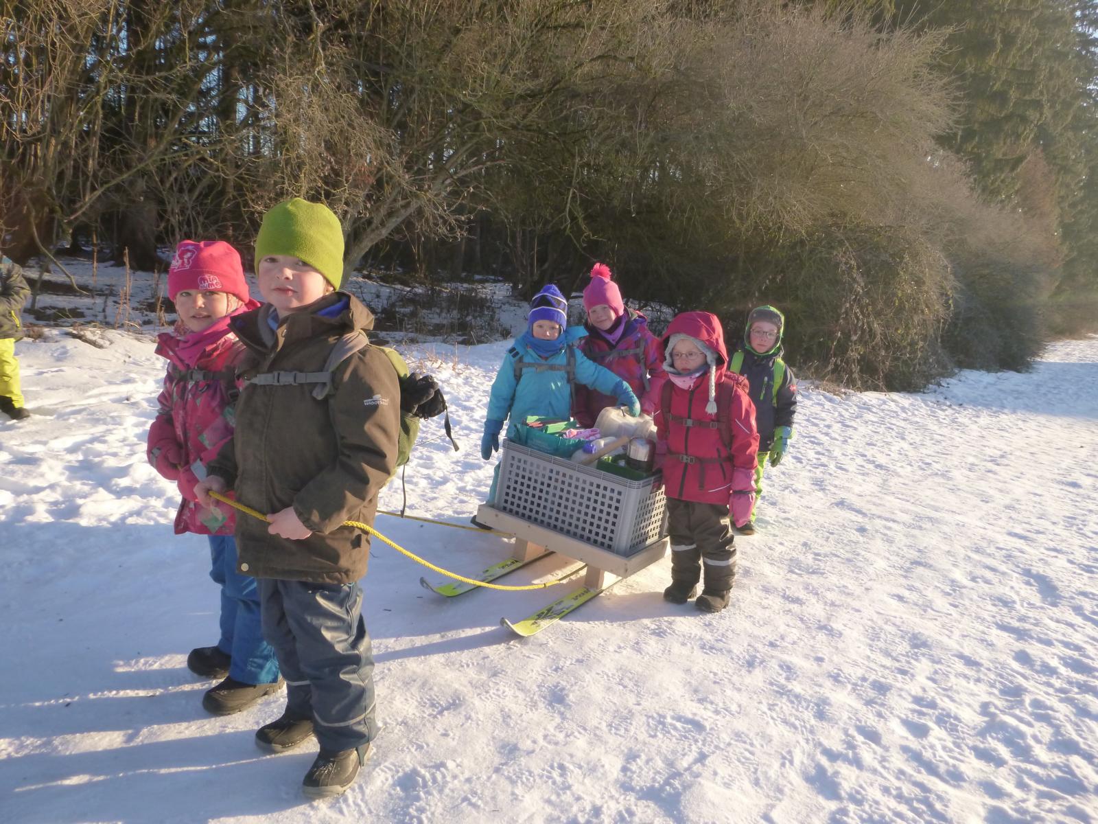 Aus ein paar alten Skiern und zwei Transportboxen baute uns Bauhofchef Flori Geiger einen höchst praktischen Schlitten. Der transportiert nun mühelos unsere Materialien und Getränke durch den Schnee. Das mühsame Ziehen des Bollerwagens bleibt uns somit im Winter erspart. Und willige Pferdchen, die sich gerne vor den Schlitten spannen lassen, sind immer dabei......