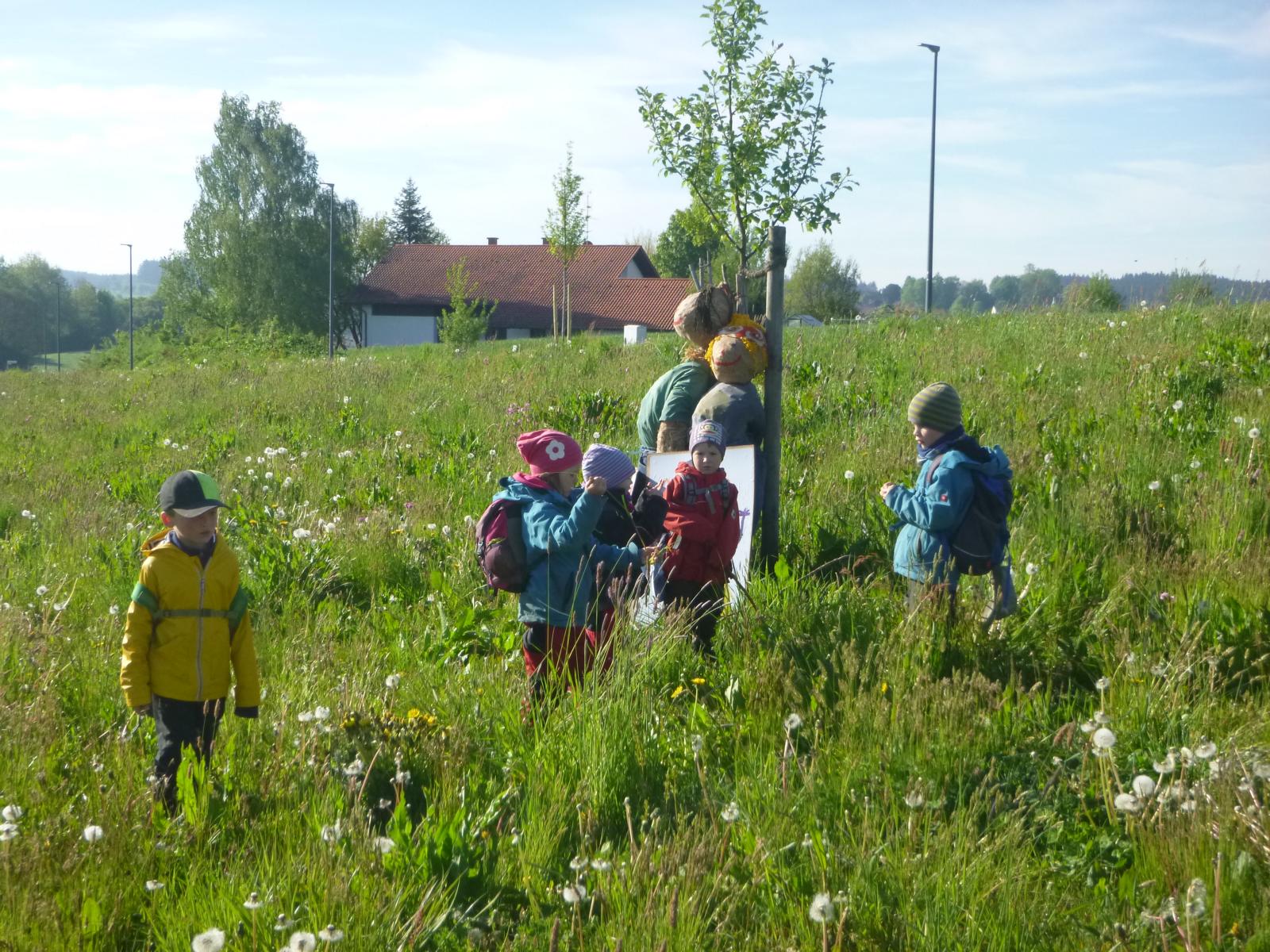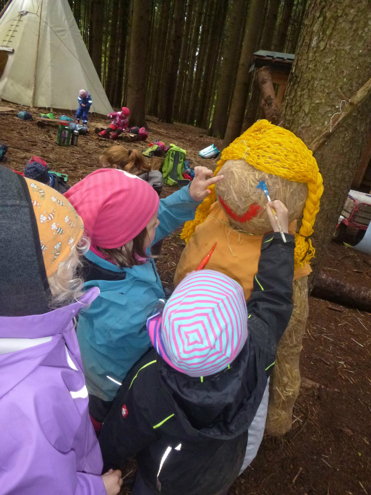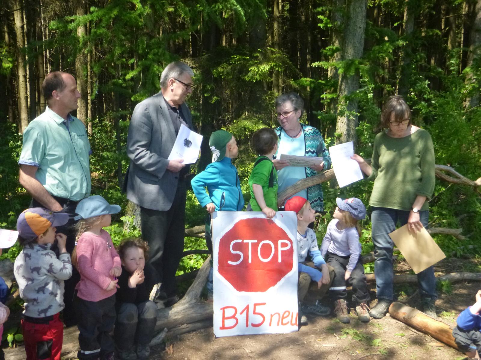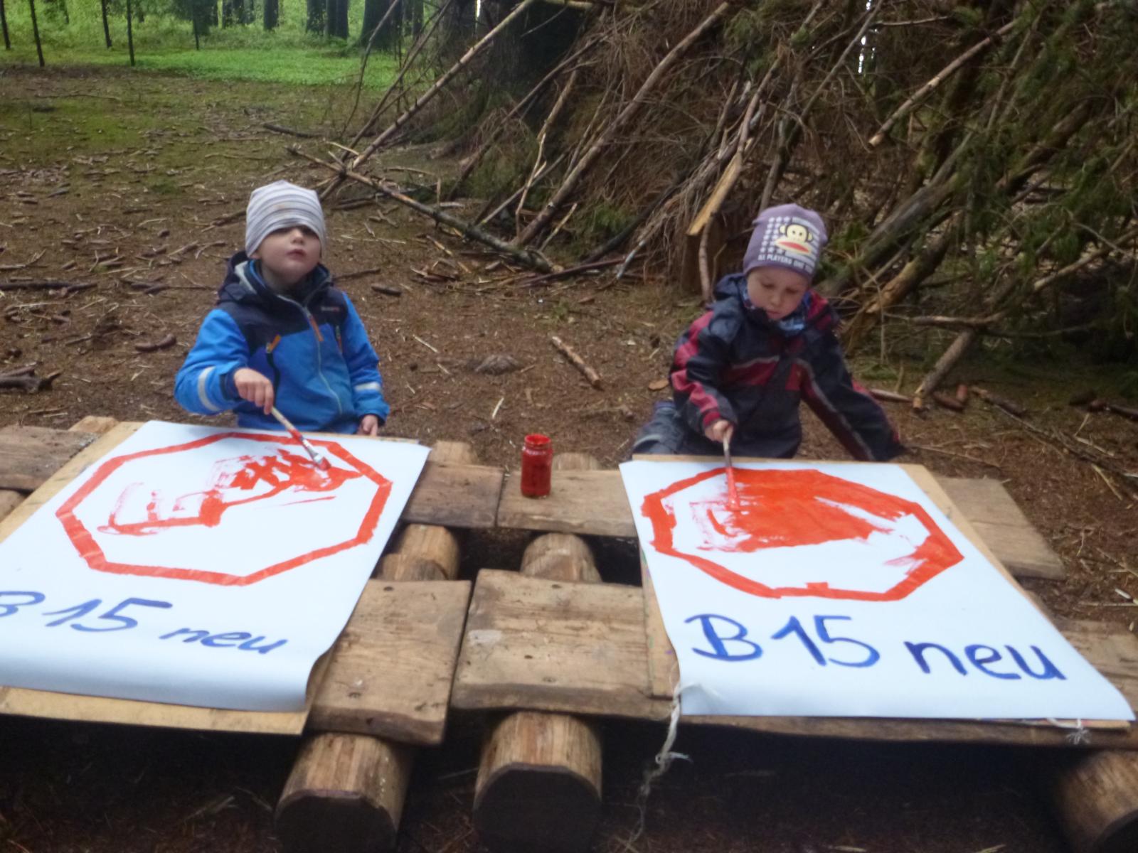 Doch bei den Kindern regte sich bald lauter Protest und gemeinsam wurde überlegt, wie man den Straßenbau wohl aufhalten könne. Viele verschiedene Ideen machten die Runde: Große Stoppschilder wurden gemalt, Figuren gebaut und an der Straße platziert und schließlich einigte man sich darauf, aufzumalen und aufzuschreiben, warum das Lausbacher Holz nicht zerstört werden dürfe. Das kleine Buch, das aus den vielen Bildern entstand, überreichten die Kinder schließlich an Bürgermeisterin Katharina Rottenwallner. Die war extra zusammen mit MdB Thomas Gambke und Martin Eberl von der Bürgerinitiative „Stopp B 15 neu im kleinen Vilstal“ in den Waldkindergarten gekommen und versprach den Kindern, ihre Einwendungen an die richtige Stelle weiterzuleiten.