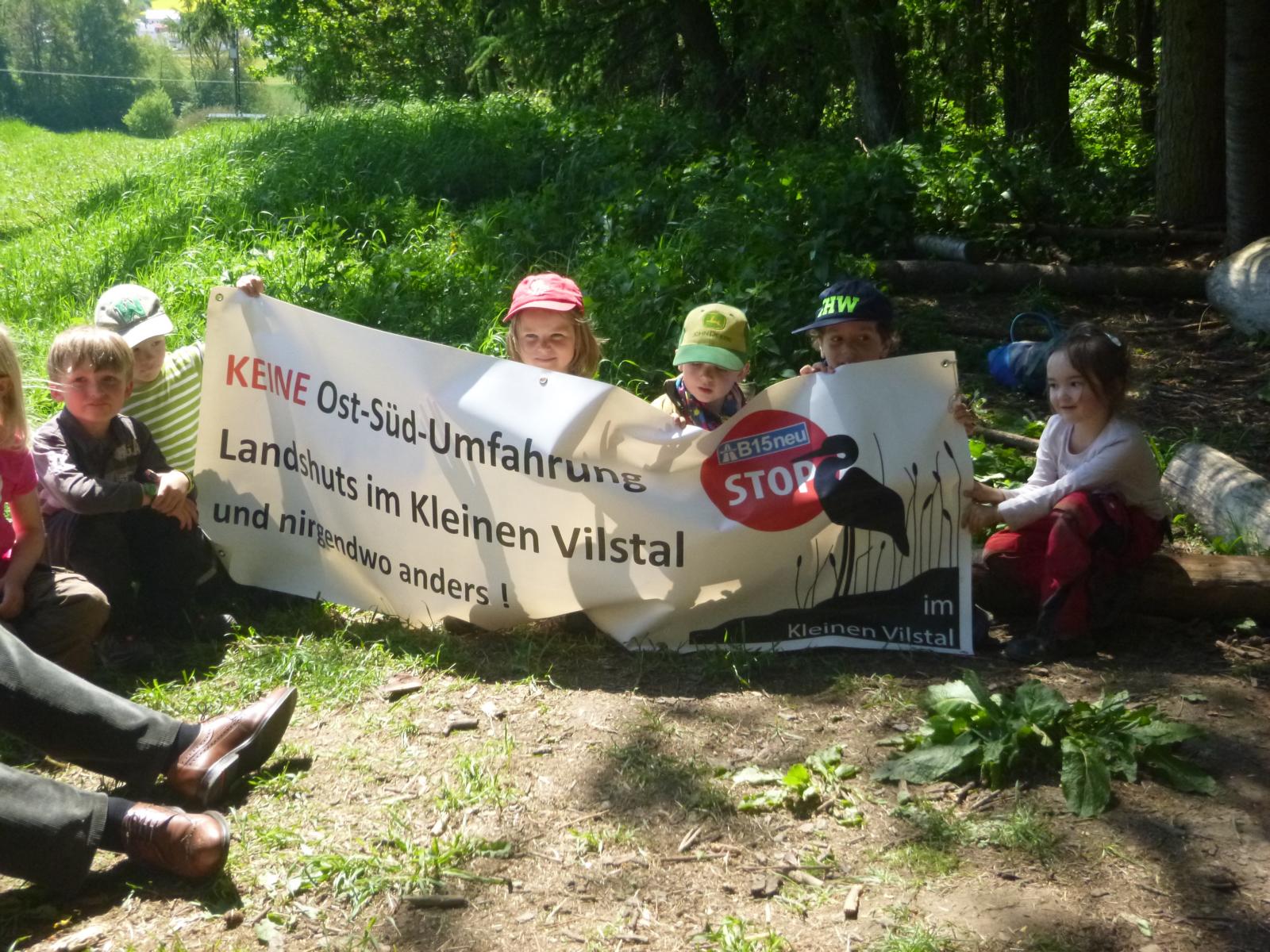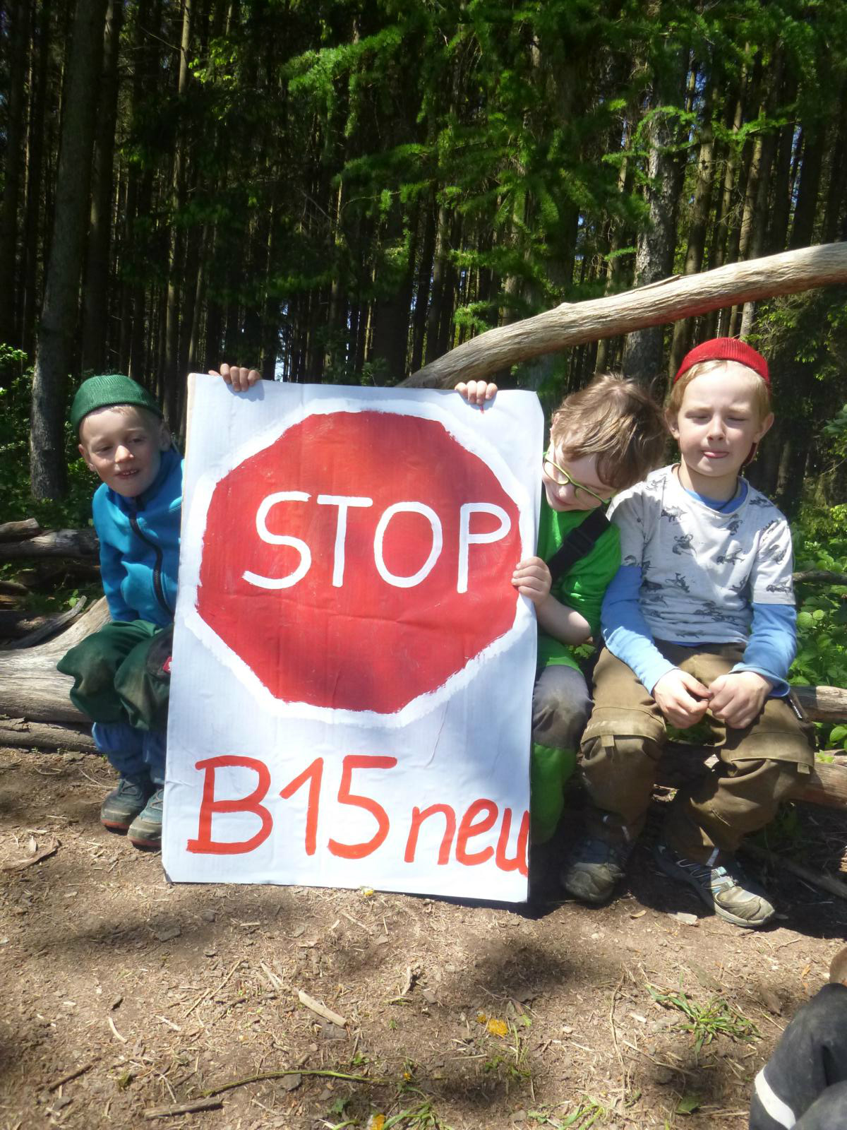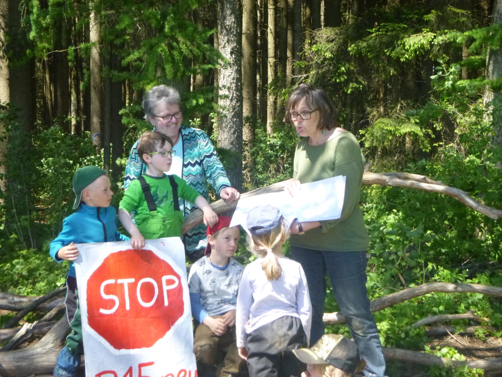 „Könnt Ihr Euch vorstellen, wie sich unser Wald verändert, wenn eine riesige Straße mitten hindurch führt?“ So ganz kann sich das wohl keiner vorstellen und die Kinder des Waldkindergartens wollten sich das auch gar nicht vorstellen. Die Waldpädagogik vermittelt den Kindern einen schonenden Umgang mit der Natur. Müllvermeidung, verantwortlicher Umgang mit Ressourcen, Bewahrung unserer Lebensgrundlagen Wasser, Luft und Boden erscheinen unseren Waldlausern als selbstverständlich. Der Bau einer autobahnähnlichen Straße durch’s Lausbacher Holz entsetzt und verstört die Kinder, da können nicht mal die Baumaschinen locken.
