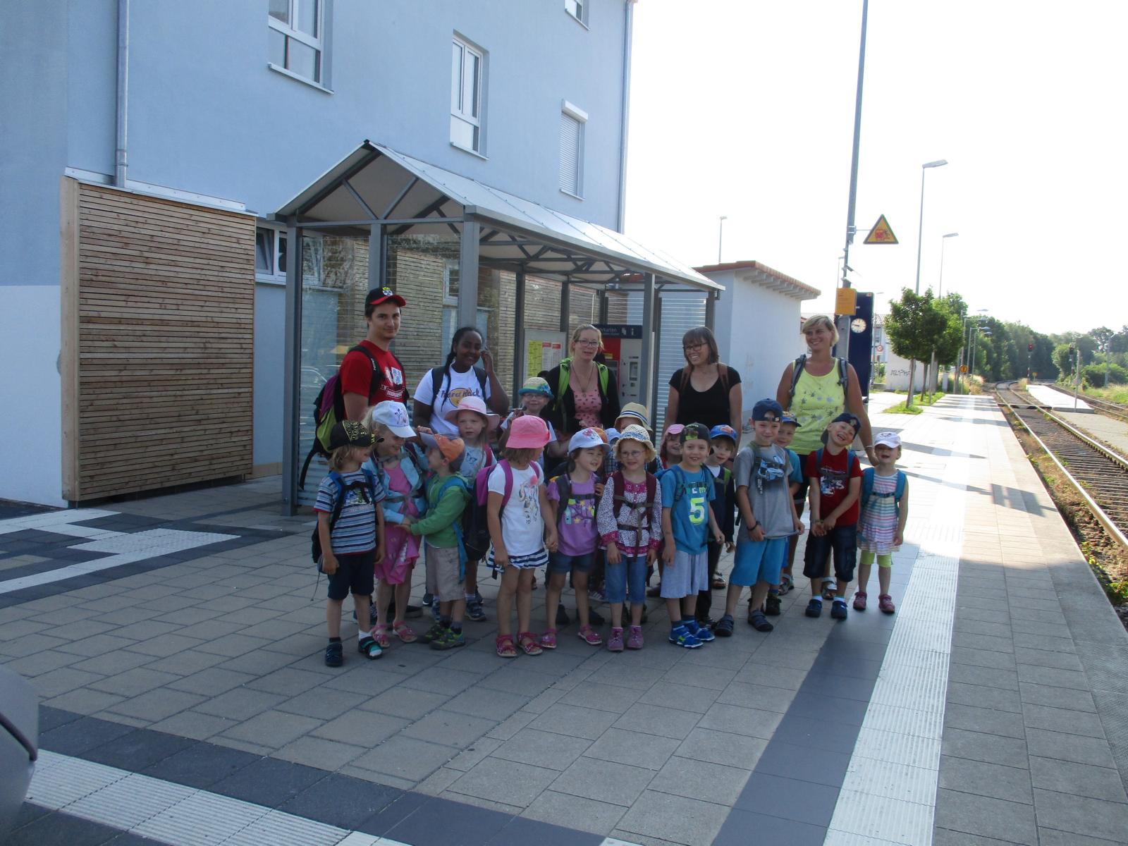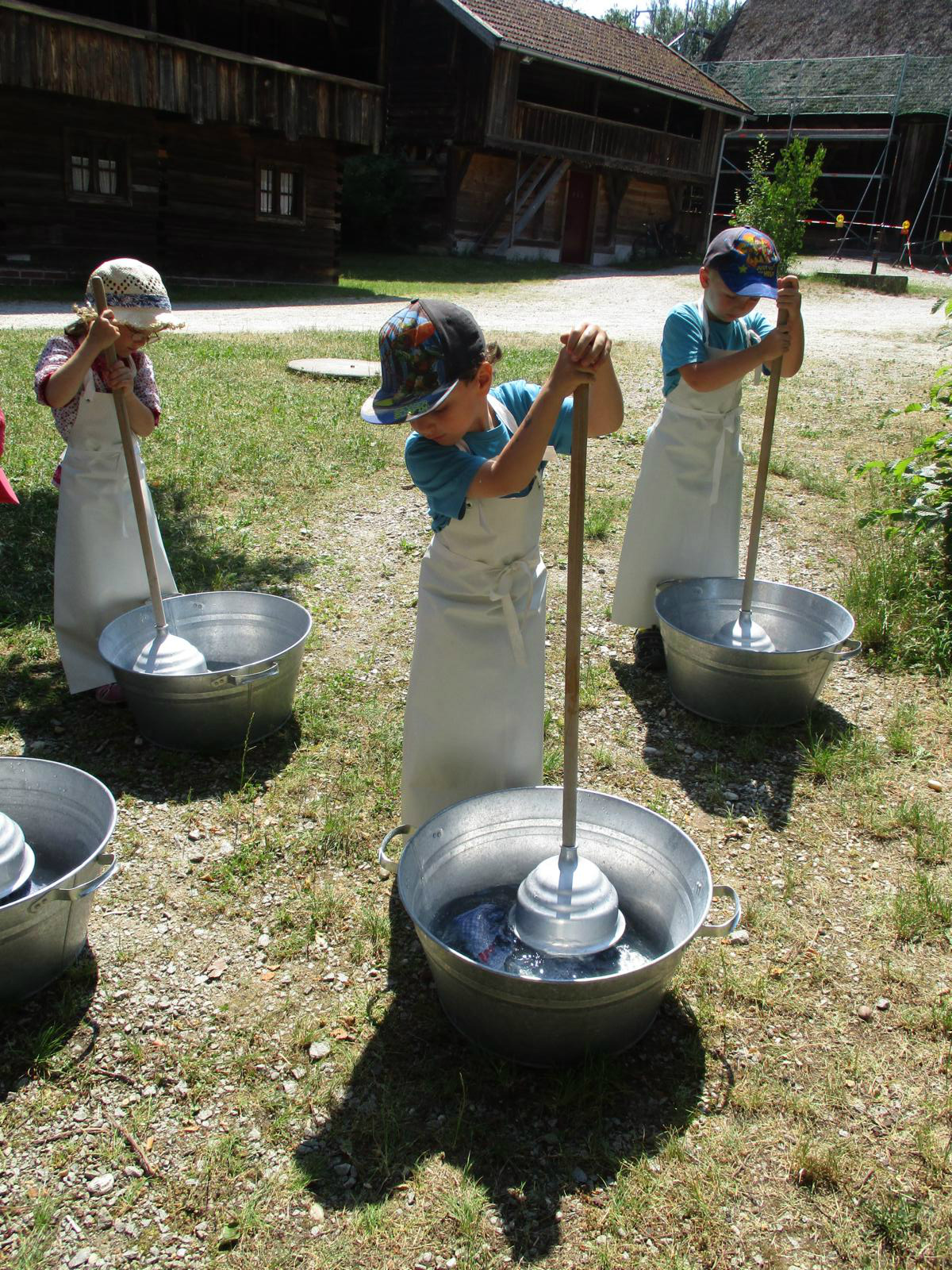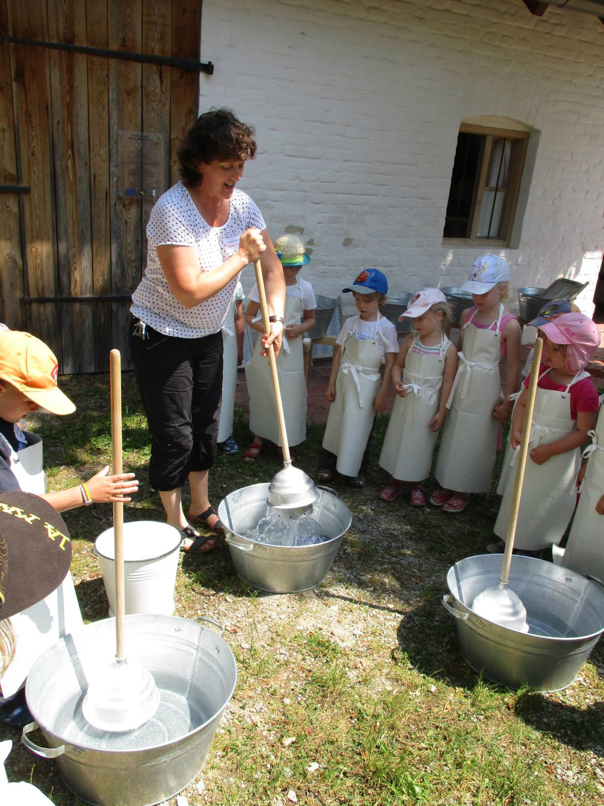 Im Waschhäusl stand schon alles bereit, um die Wäsche sauber zu bekommen. Die Kinder konnten sich an verschiedenen Waschzubern, Waschbottichen und Wäschepressen probieren – was bei den hochsommerlichen Temperaturen natürlich doppelt Spaß machte. Die fertiggewaschenen Handtücher konnten dann schließlich noch auf die Leine zum Trocknen gehängt werden. Und für uns wurde es auch Zeit, uns auf den Rückweg zum Bahnhof zu machen. Trotz der Sommerhitze marschierten die Kinder wieder wacker zurück und beim Aufenthalt in Neumarkt gab’s für alle noch ein Eis zur Erfrischung. Allen hat’s gut gefallen und den am Bahnhof wartenden Eltern konnte viel berichtet werden.