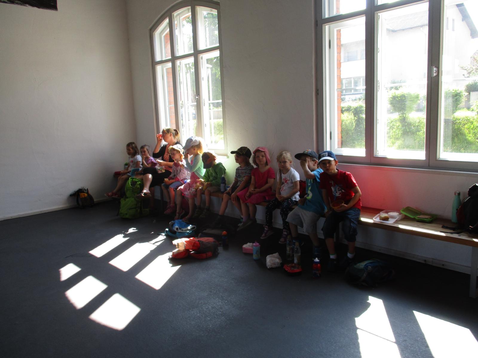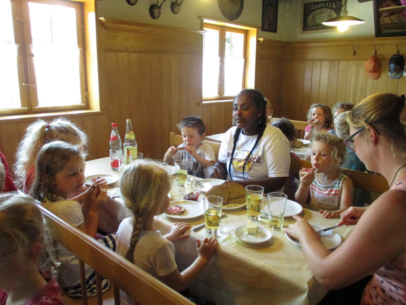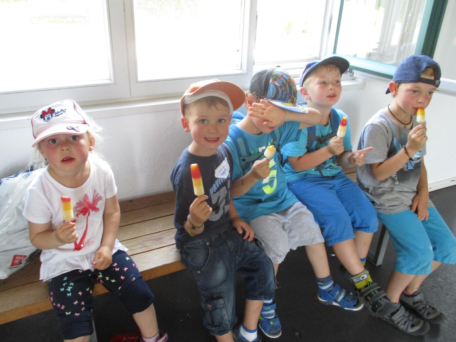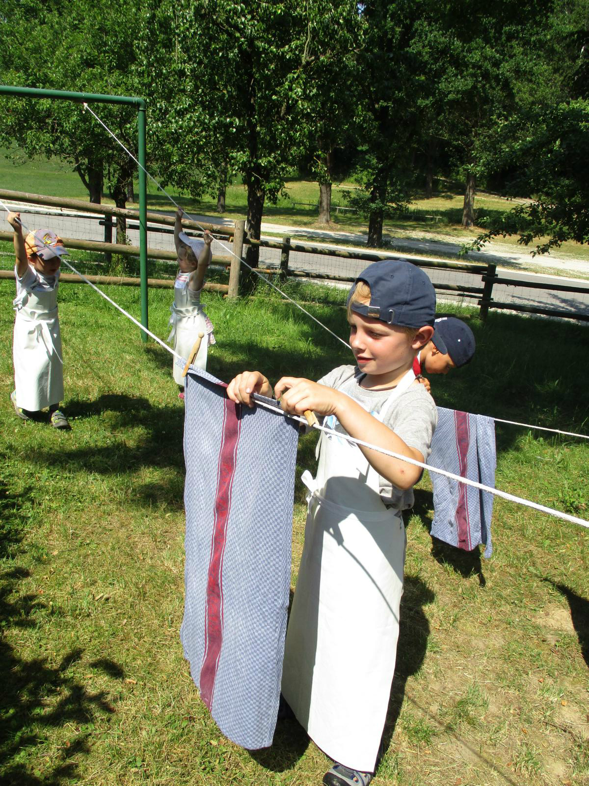 Im Waschhäusl stand schon alles bereit, um die Wäsche sauber zu bekommen. Die Kinder konnten sich an verschiedenen Waschzubern, Waschbottichen und Wäschepressen probieren – was bei den hochsommerlichen Temperaturen natürlich doppelt Spaß machte. Die fertiggewaschenen Handtücher konnten dann schließlich noch auf die Leine zum Trocknen gehängt werden. Und für uns wurde es auch Zeit, uns auf den Rückweg zum Bahnhof zu machen. Trotz der Sommerhitze marschierten die Kinder wieder wacker zurück und beim Aufenthalt in Neumarkt gab’s für alle noch ein Eis zur Erfrischung. Allen hat’s gut gefallen und den am Bahnhof wartenden Eltern konnte viel berichtet werden.