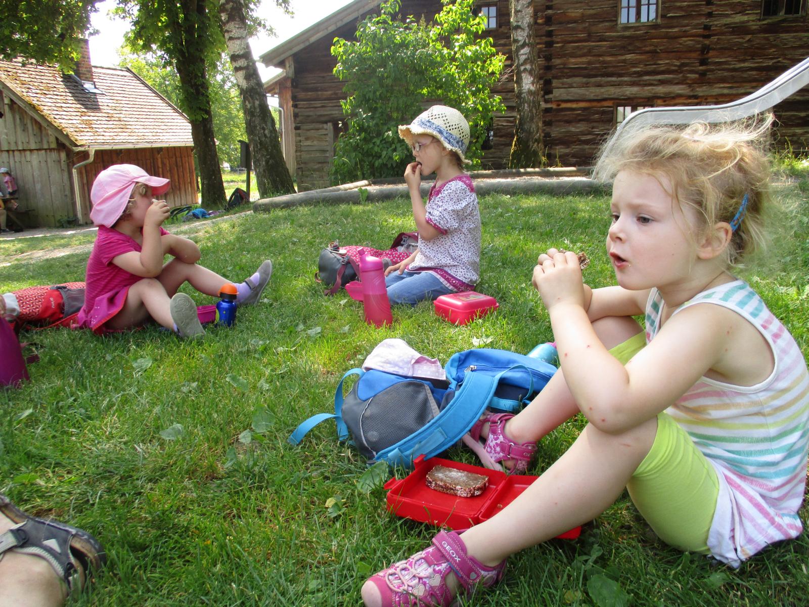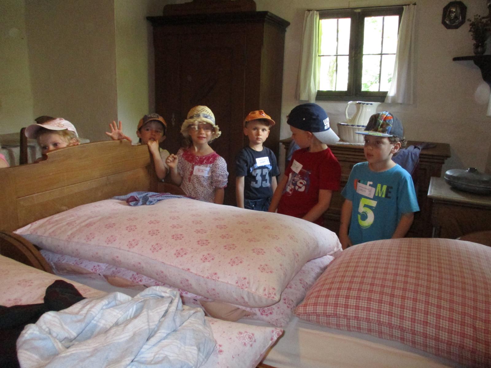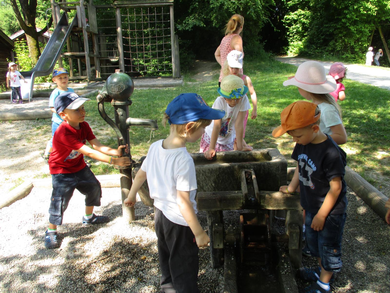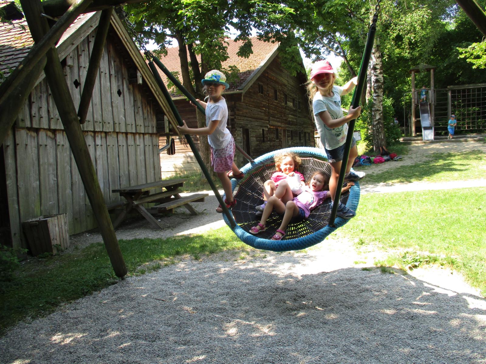 Gleich nach den Pfingstferien trafen sich die Waldkinder nicht am Häusl, sondern ganz aufgeregt am Geisenhausener Bahnhof. Ein Ausflug ins Bauernhofmuseum nach Massing stand auf dem Programm. Die Kinder wollten einmal erproben, wie das Wäschewaschen vor hundert Jahren von statten ging. Doch erst einmal ging es mit dem Zug nach Neumarkt und von dort, nach einem Aufenthalt, weiter nach Massing. Die Zugfahrt, der Brotzeitstop am Neumarkter Bahnhof sowie die kurze Weiterfahrt nach Massing haben wunderbar geklappt und hätten einigen Kindern als Programm eigentlich schon gelangt. Ein kurzer Fußweg führte uns zum Bauernhofmuseum. Die Kinder waren ganz angetan vom alten Mobiliar, dem Geschirr und den verschiedenen Tieren, denen wir auf unserem Weg über’s Gelände begegnet sind. Am Spielplatz sind wir natürlich nicht vorbeigekommen. Dort konnten wir im Schatten auch noch ein zweites Mal Brotzeit machen. Um kurz nach 12 Uhr hat uns dann schon die Museumspädagogin Roswitha Klingshirn in Empfang genommen und erläuterte den Kindern anhand von vielen Wäsche- und Kleidungsstücken und anderen Gebrauchsgegenständen den Tagesablauf auf einem Hof um ca. 1910.