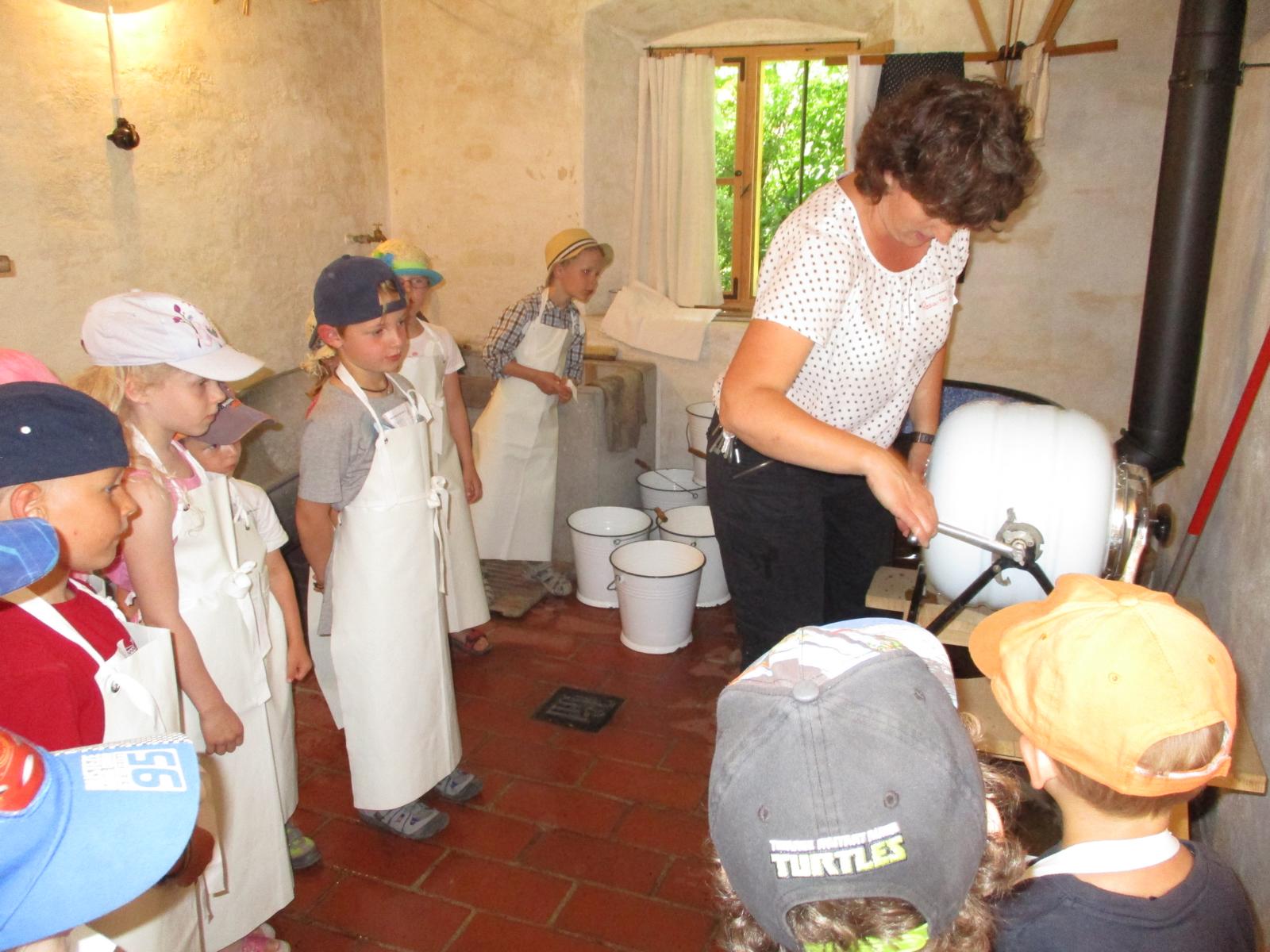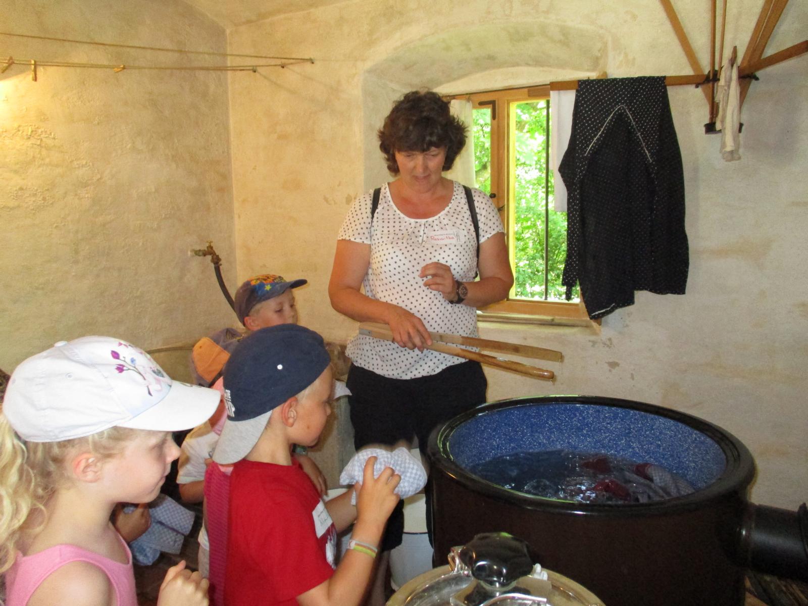 Schließlich durften die Kinder die im ganzen Haus verteilten Handtücher in die Wäschekörbe einsammeln und dann ging’s gemeinsam zum Waschhäusl. Auf dem Weg dorthin konnten wir noch Schweine, Gänse, Ziegen, Hasen und ein Pfauenpärchen mit seinen Jungen beobachten.